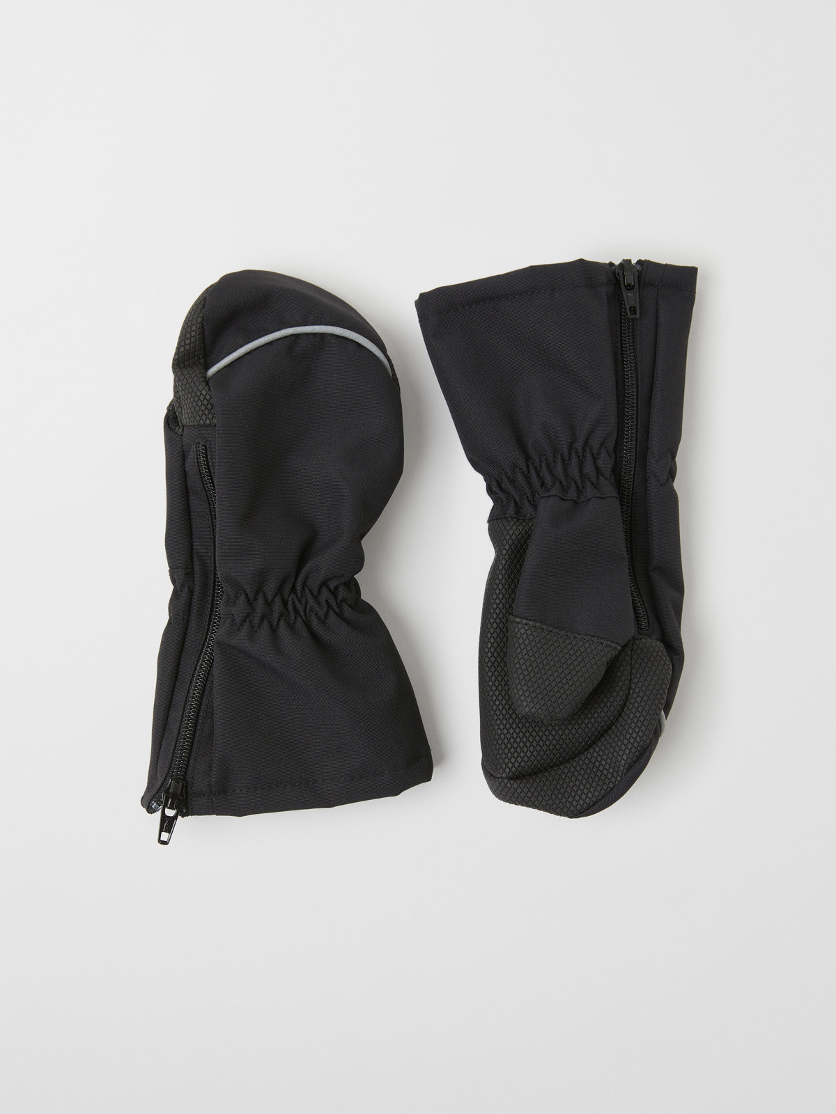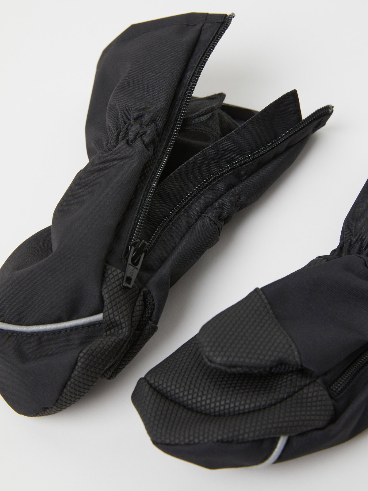Die winddichten Shellfäustlinge haben einen Reißverschluss an der Seite, der das An- und Ausziehen erleichtert. An der Innenseite haben die Handschuhe ein dehnbares Band aus weichem Fleece, das sich mit Klettverschluss ums Handgelenk befestigen lässt, sodass sie nicht verrutschen. Die Innenseite der Handfläche ist für guten Griff beschichtet, die Oberseite ist mit gut sichtbaren Reflektoren ausgerüstet. Der Reißverschluss ist nicht wasserdicht.