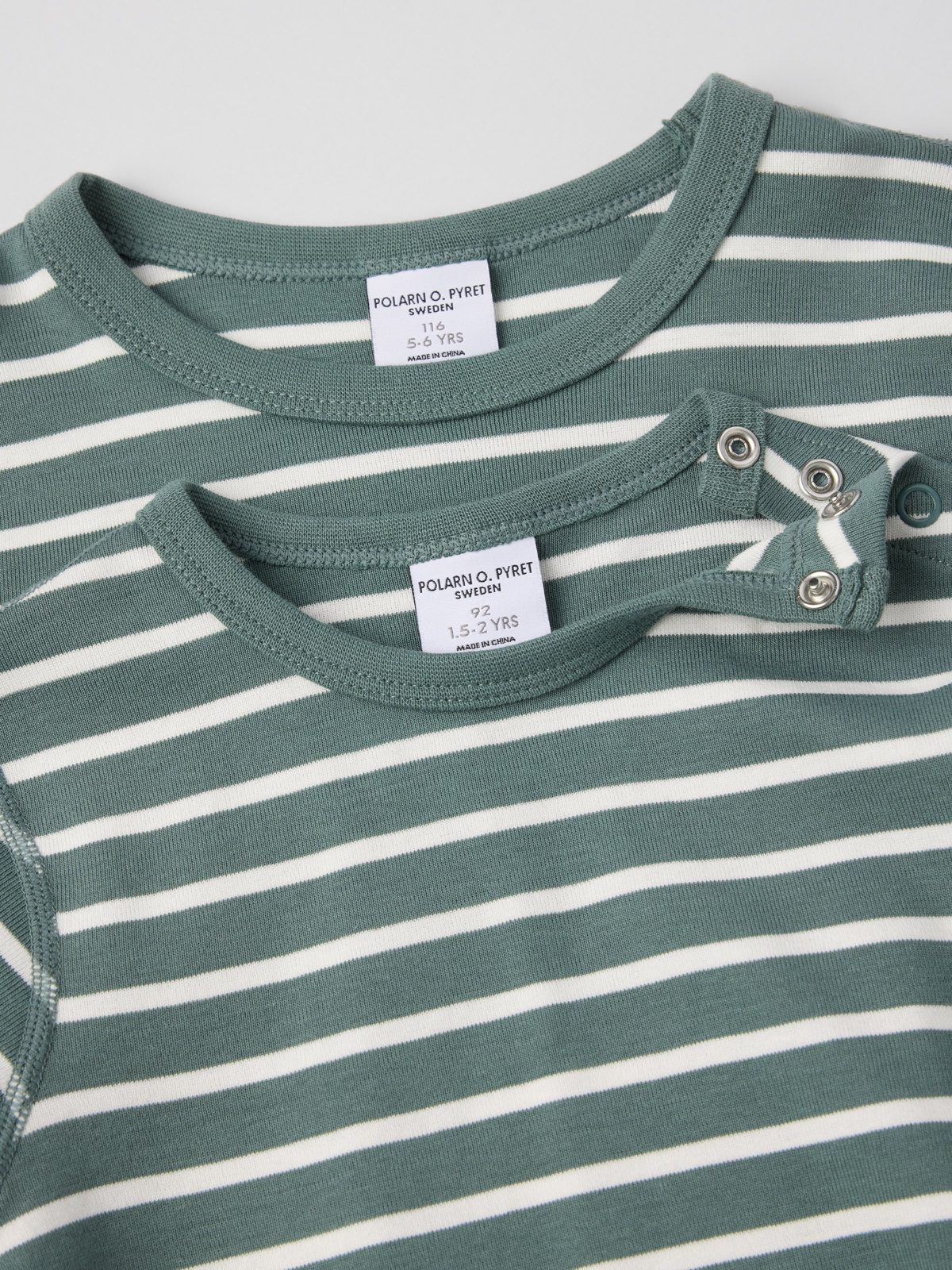 Die Größen 86 bis 92 werden auf einer Schulter mit Druckknöpfen geschlossen, um das An- und Ausziehen zu erleichtern.