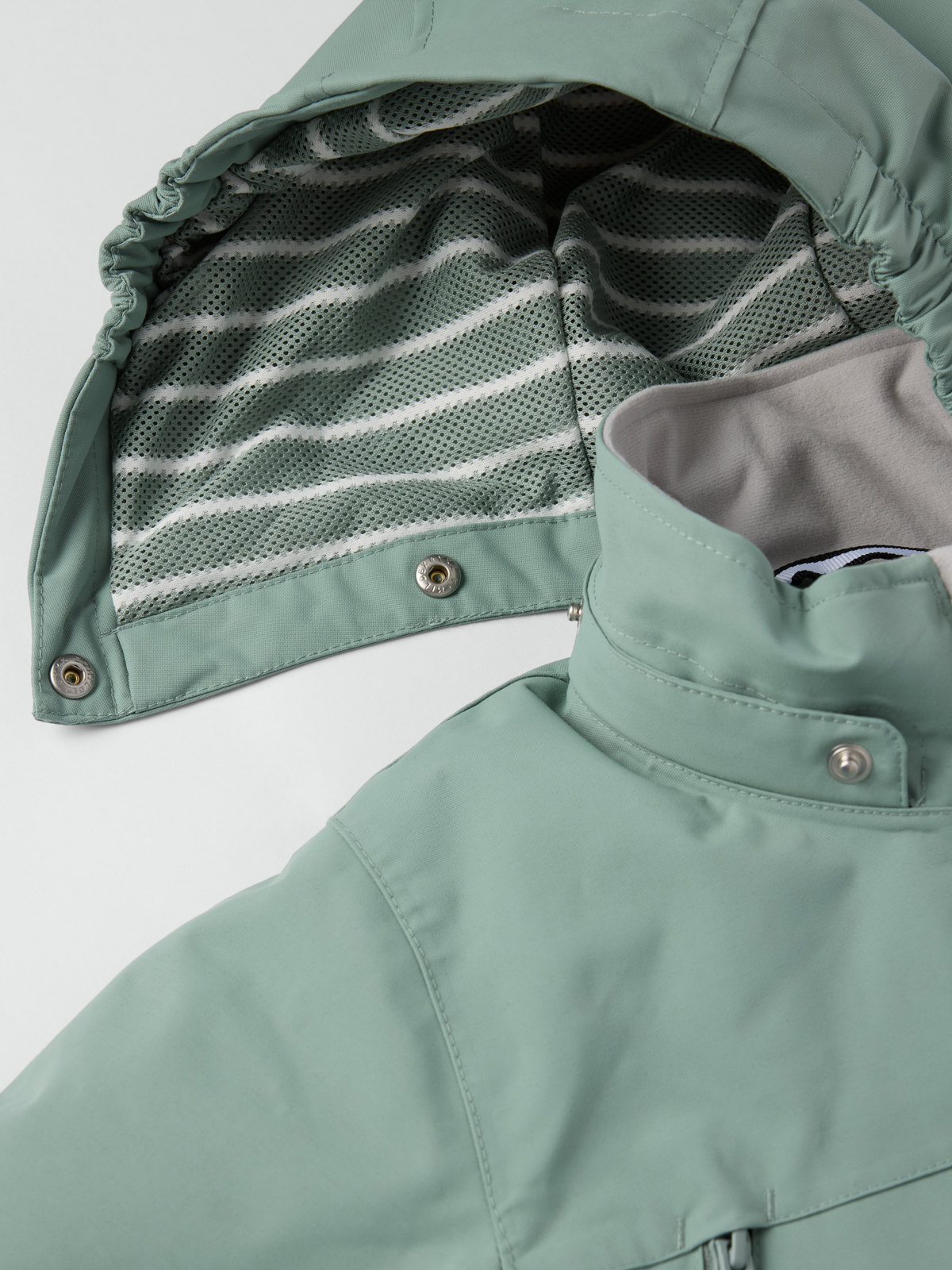 • Die verstellbare Kapuze hat Druckknöpfe für mehr Sicherheit und kann abgenommen werden. Die seitlichen Gummizüge gewährleisten eine gute Passform