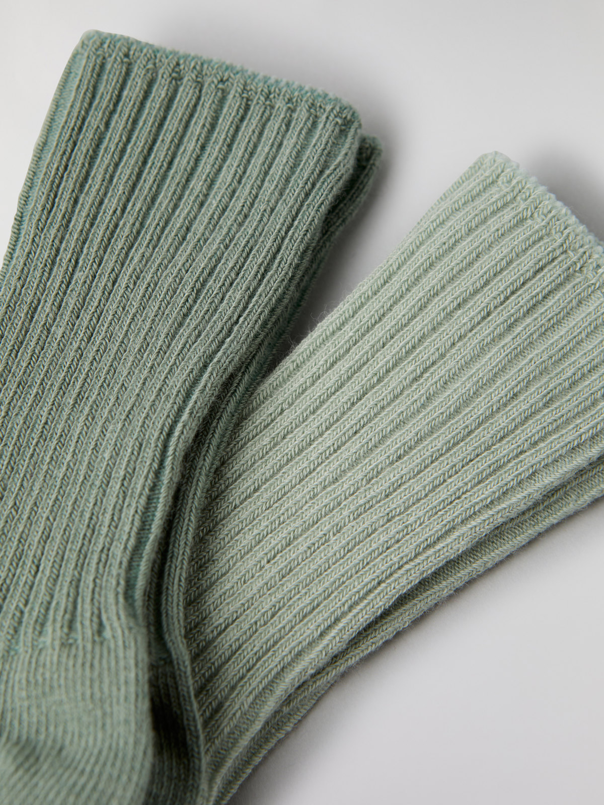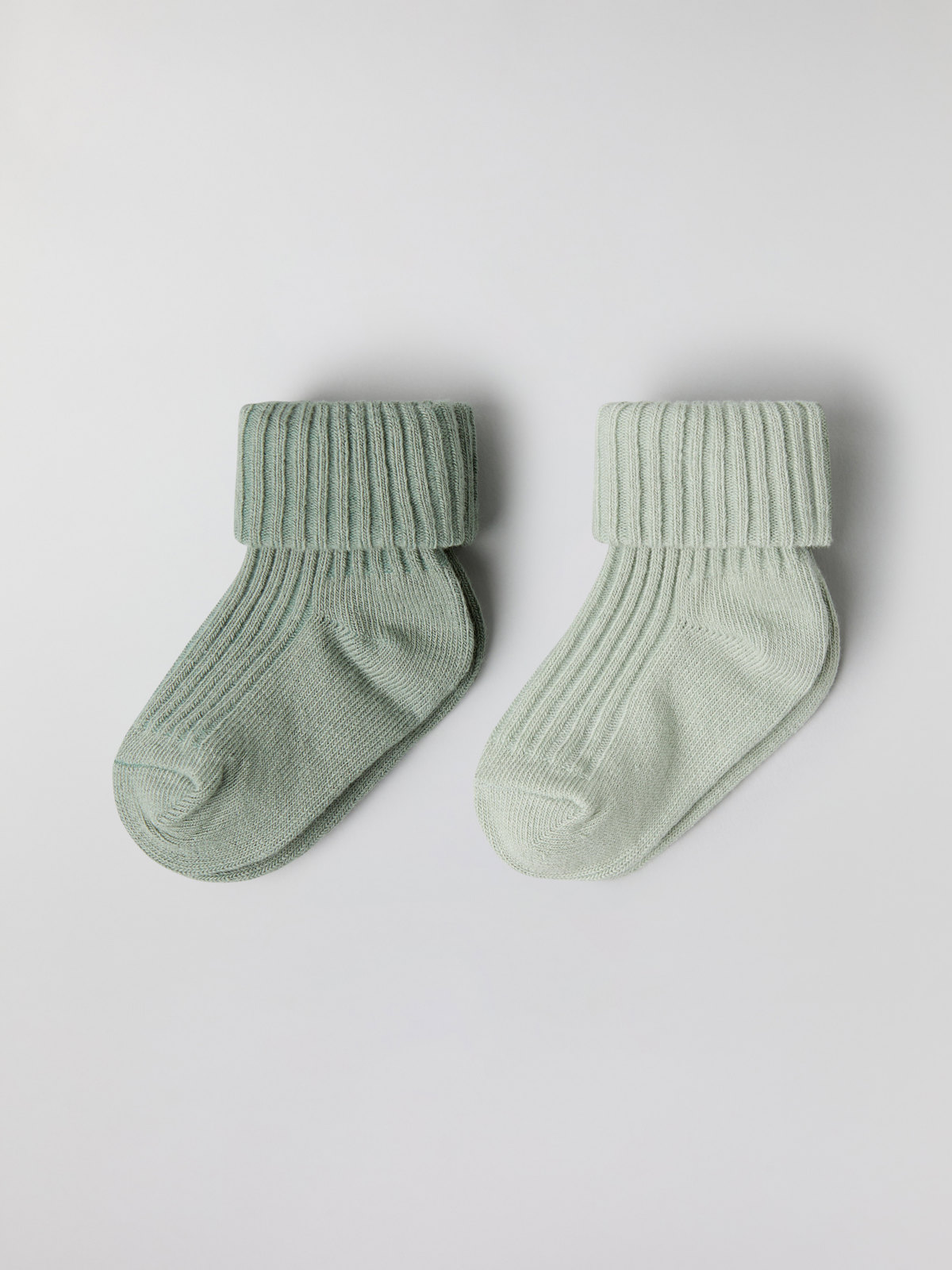 Hier kommen zwei Paar einfarbiger Söckchen aus weicher Bio-Baumwolle für Babys zum Auffüllen der Sockenschublade. Die Söckchen haben weiche Bündchen zum Umschlagen, die nicht kratzen.