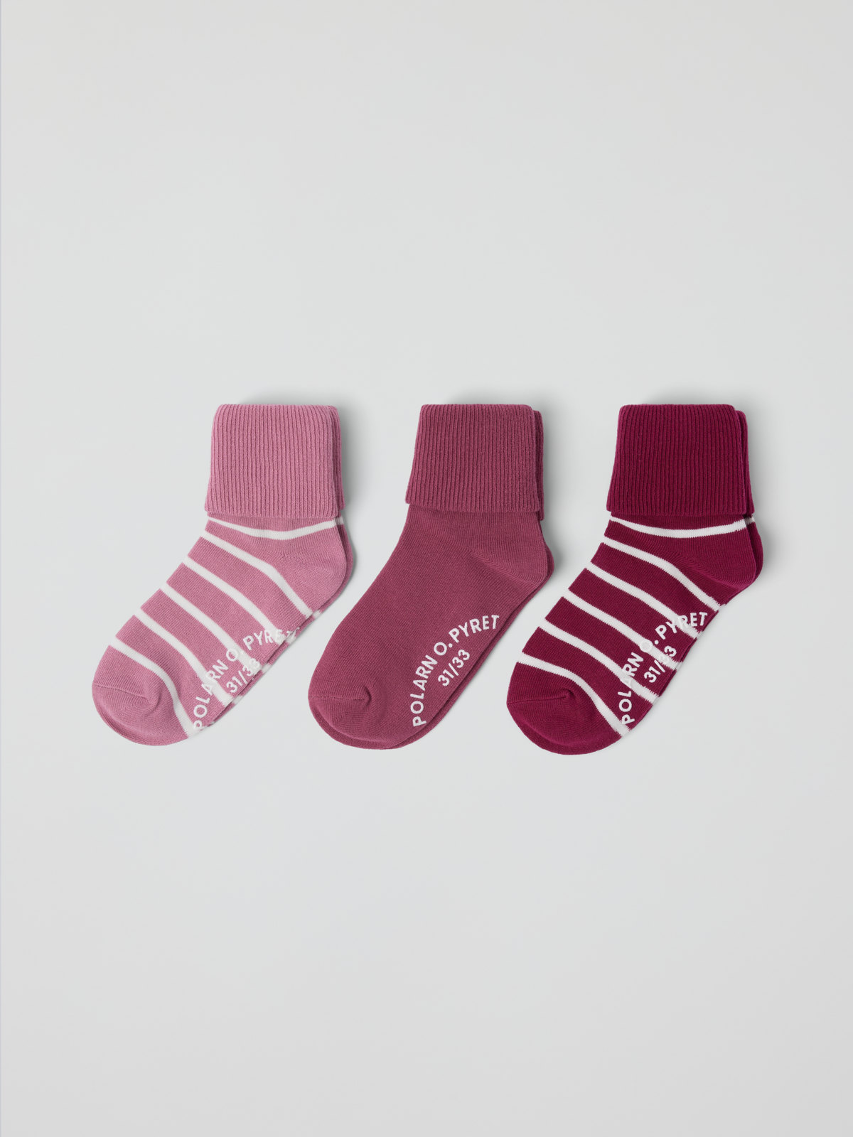 Hier kommt ein 3er-Pack Söckchen mit rutschhemmenden Noppen zum Auffüllen der Sockenschublade. Die Söckchen aus weicher Bio-Baumwolle haben Bündchen zum Umschlagen.