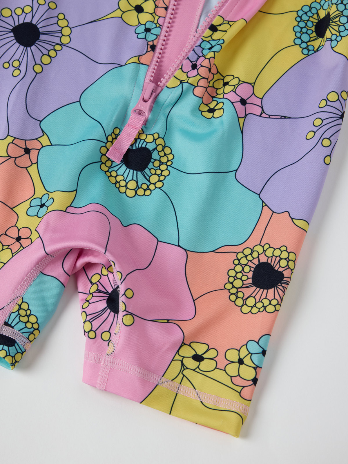 Geblümter UV-Anzug mit UPF 50 aus weichem und bequemem Material aus recyceltem Polyester. Der UV-Anzug hat besonders weiche Nähte, die nicht scheuern. Der Reißverschluss an der Vorderseite macht das An- und Ausziehen zum Kinderspiel und der Kinnschutz am oberen Ende sorgt dafür, dass an Hals und Wangen nichts kratzt.
