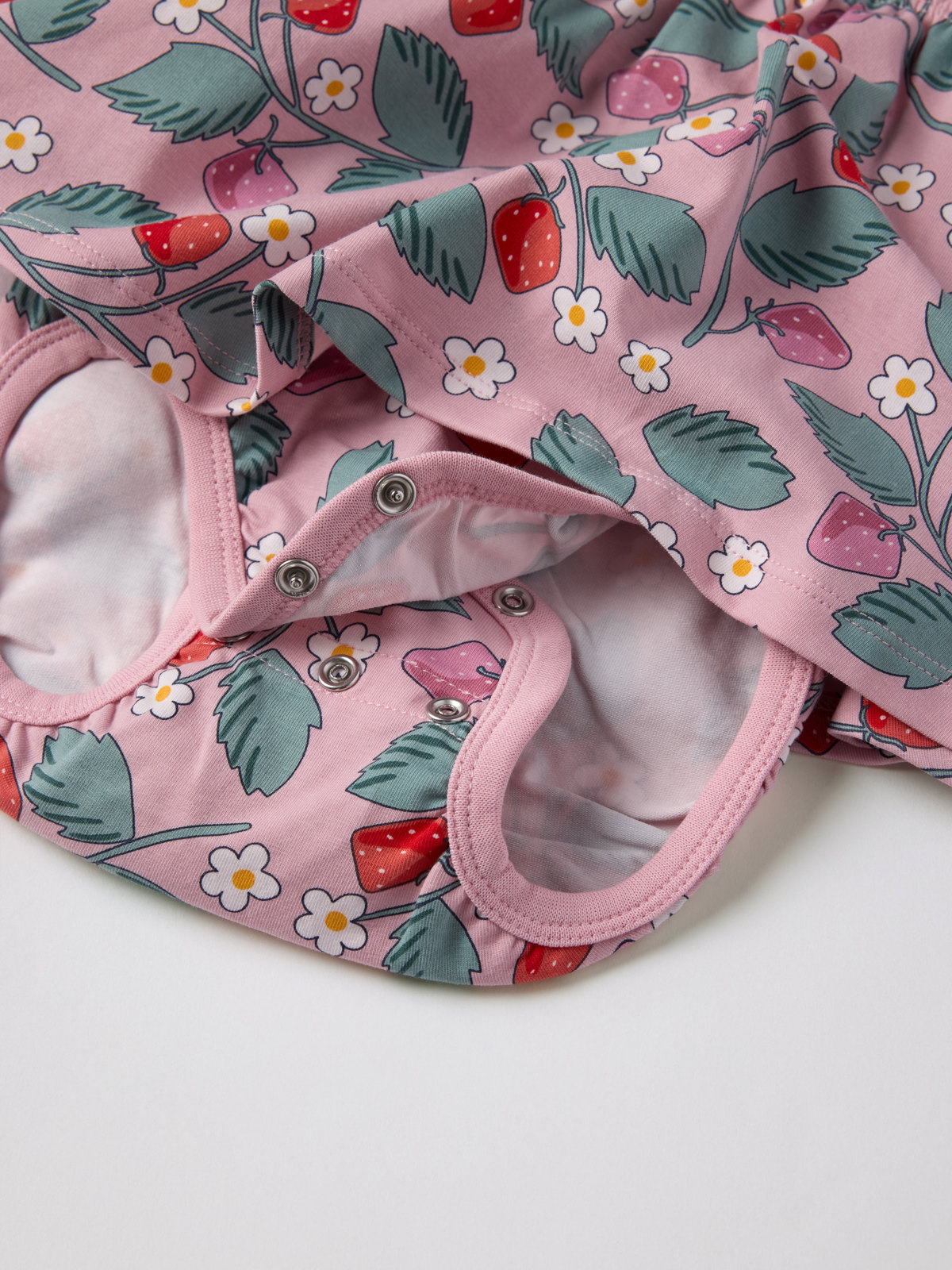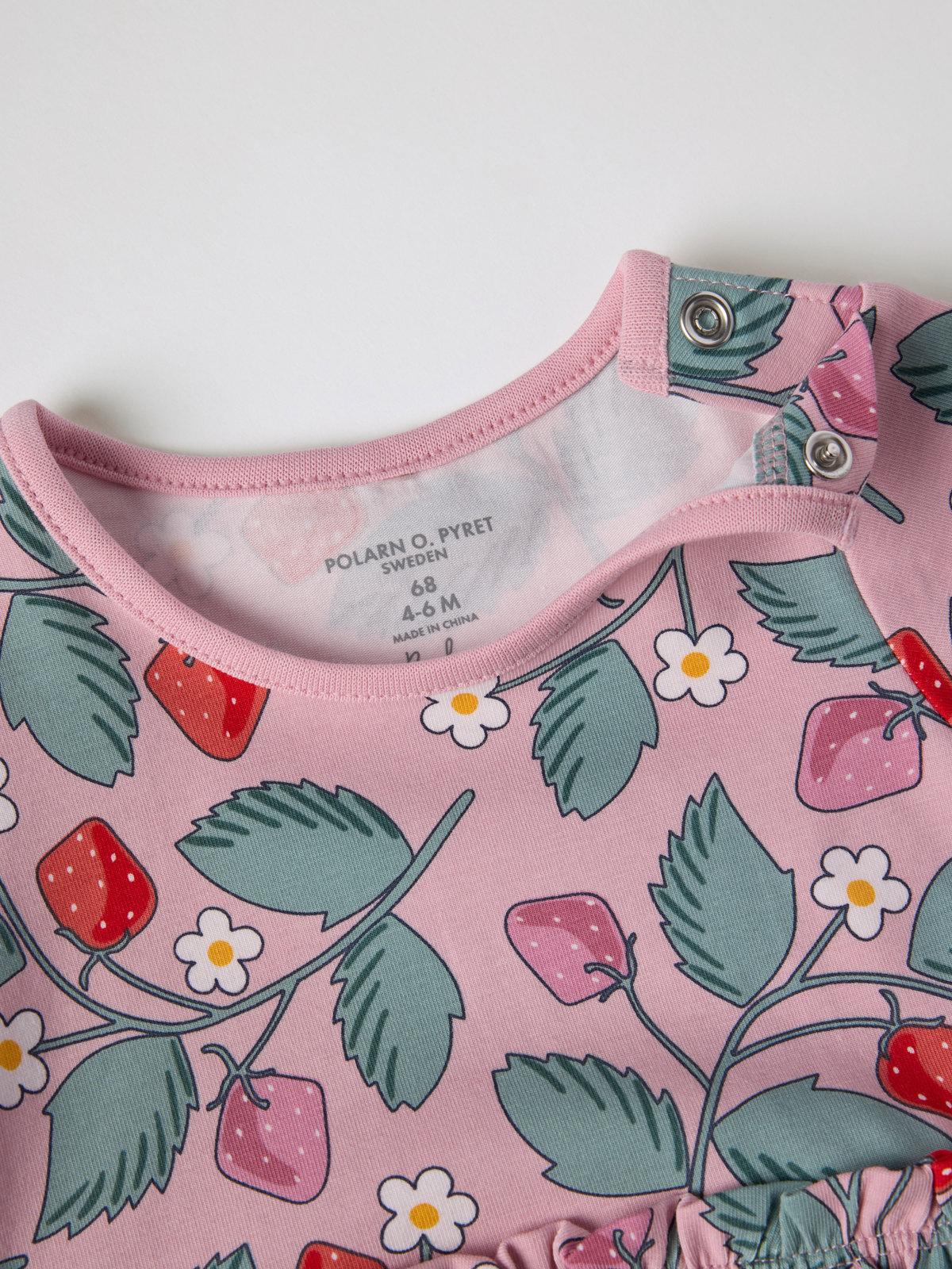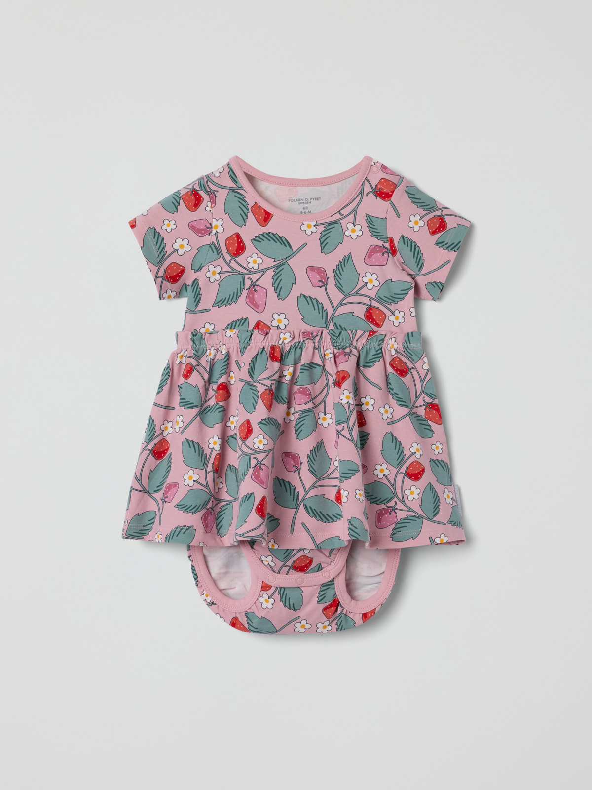 Kurzärmliges Bodykleid aus weicher Bio-Baumwolle für die Allerkleinsten – knuddelig und festfein! Das Bodykleid hat niedliche Stickereien auf dem Rockteil und verdeckte Druckknöpfe an einer Schulter sowie im Schrittbereich, um das An- und Ausziehen zu erleichtern.