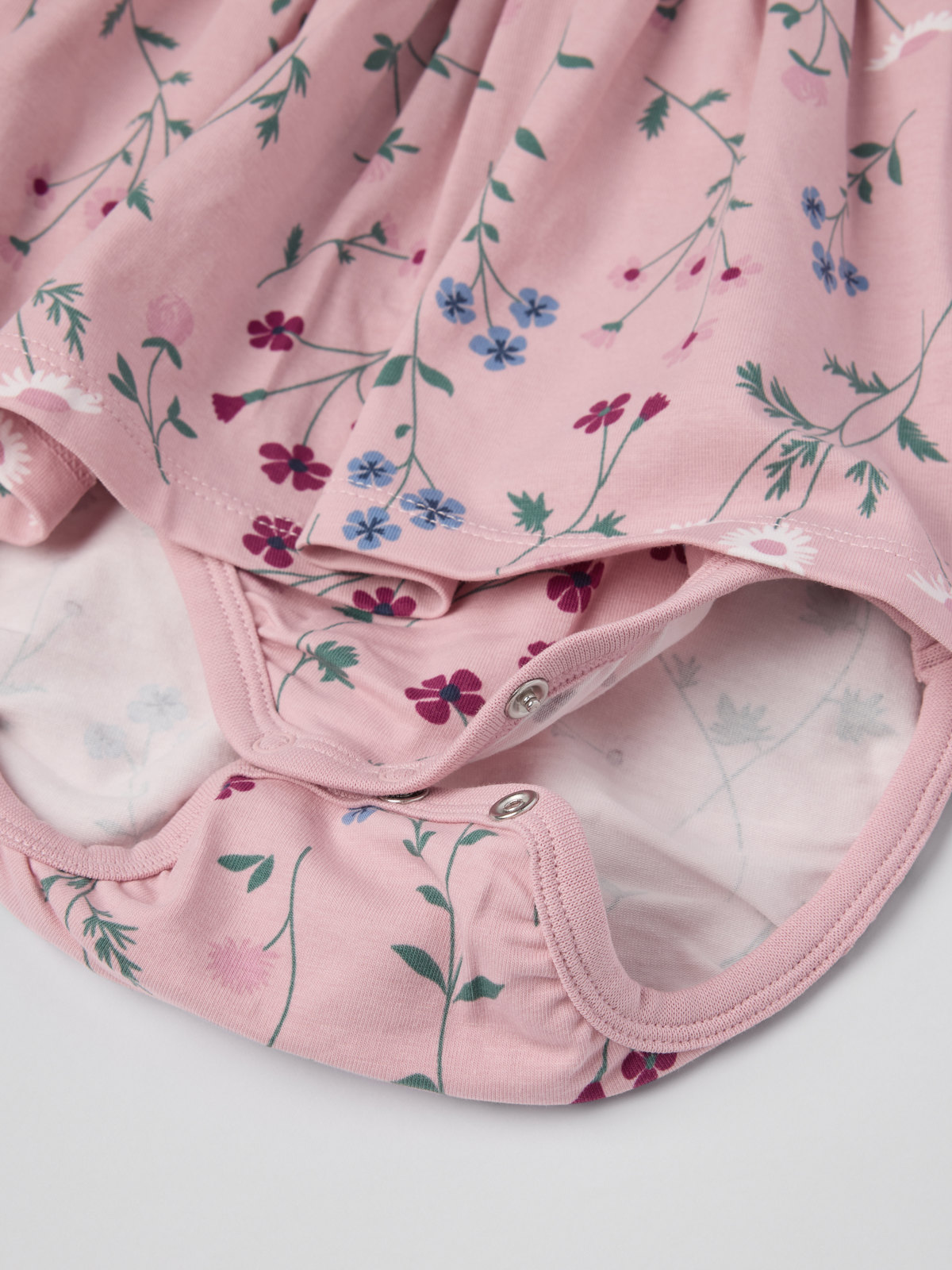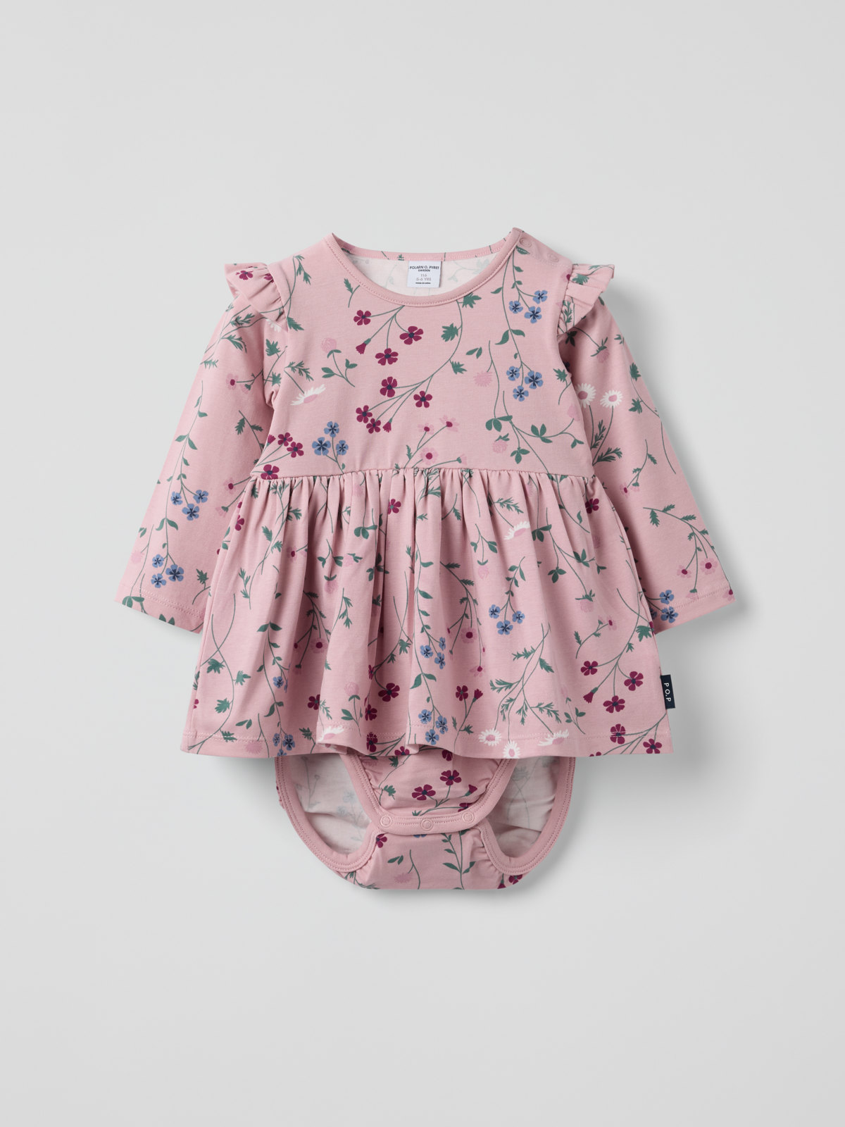 Eine praktische Kombination aus Kleid und Body aus weicher Bio-Baumwolle für Babys. Das Kleid mit Blumenprint ist mit bezaubernden Rüschen über den Schultern verziert. . Die Druckknöpfe an der einen Schulter und im Schritt erleichtern das An- und Ausziehen.