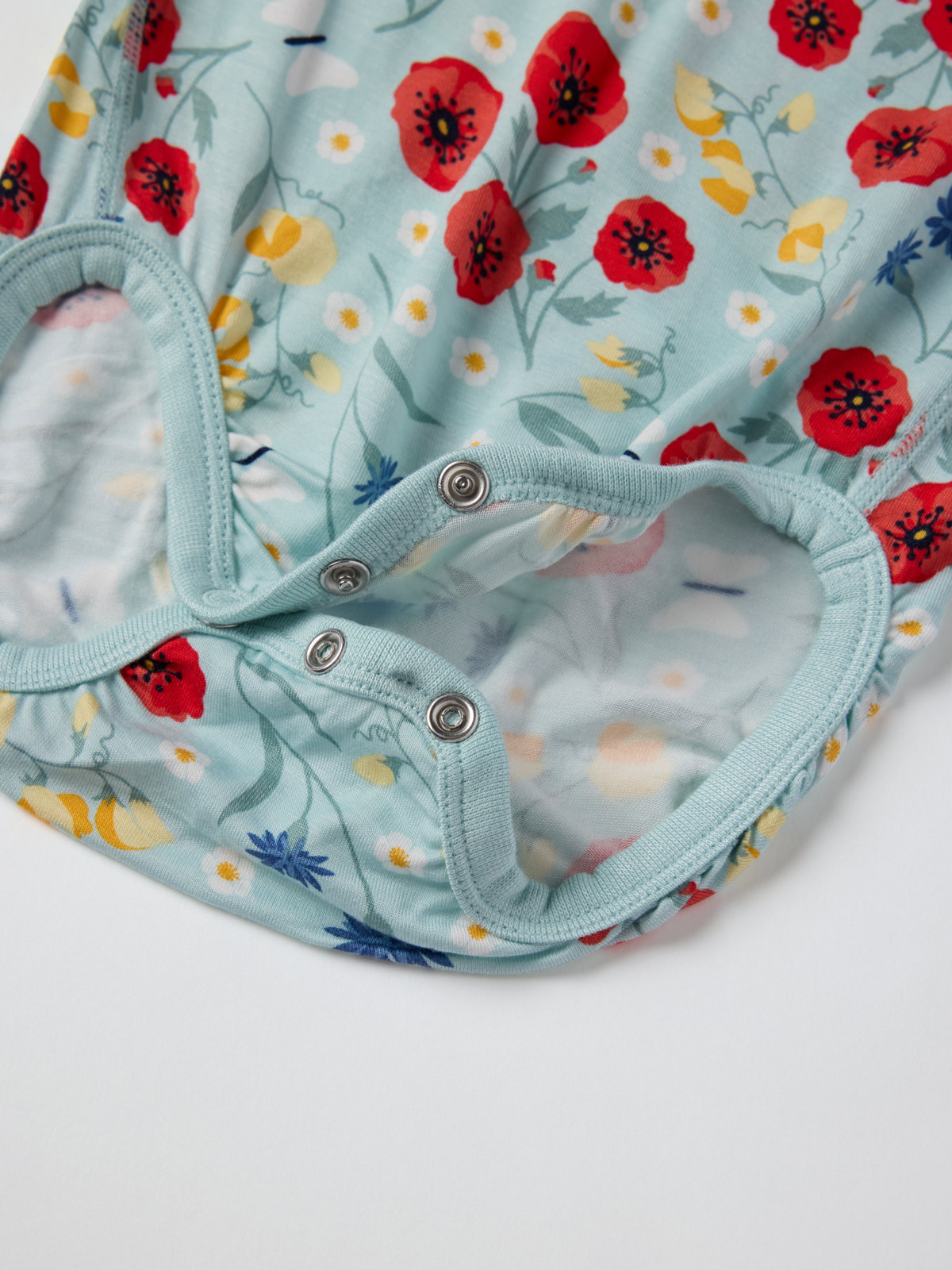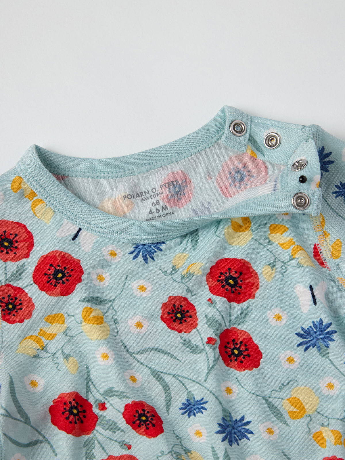 Geblümter kurzärmeliger Body aus luftig-leichtem Trikot aus Ecovero™ Viscose. Ein richtig bequemes Sommerteil! Der Body hat besonders weiche Nähte, die sanft zu empfindlicher Haut sind. Druckknöpfe an der einen Schulter und im Schritt erleichtern das An- und Ausziehen.