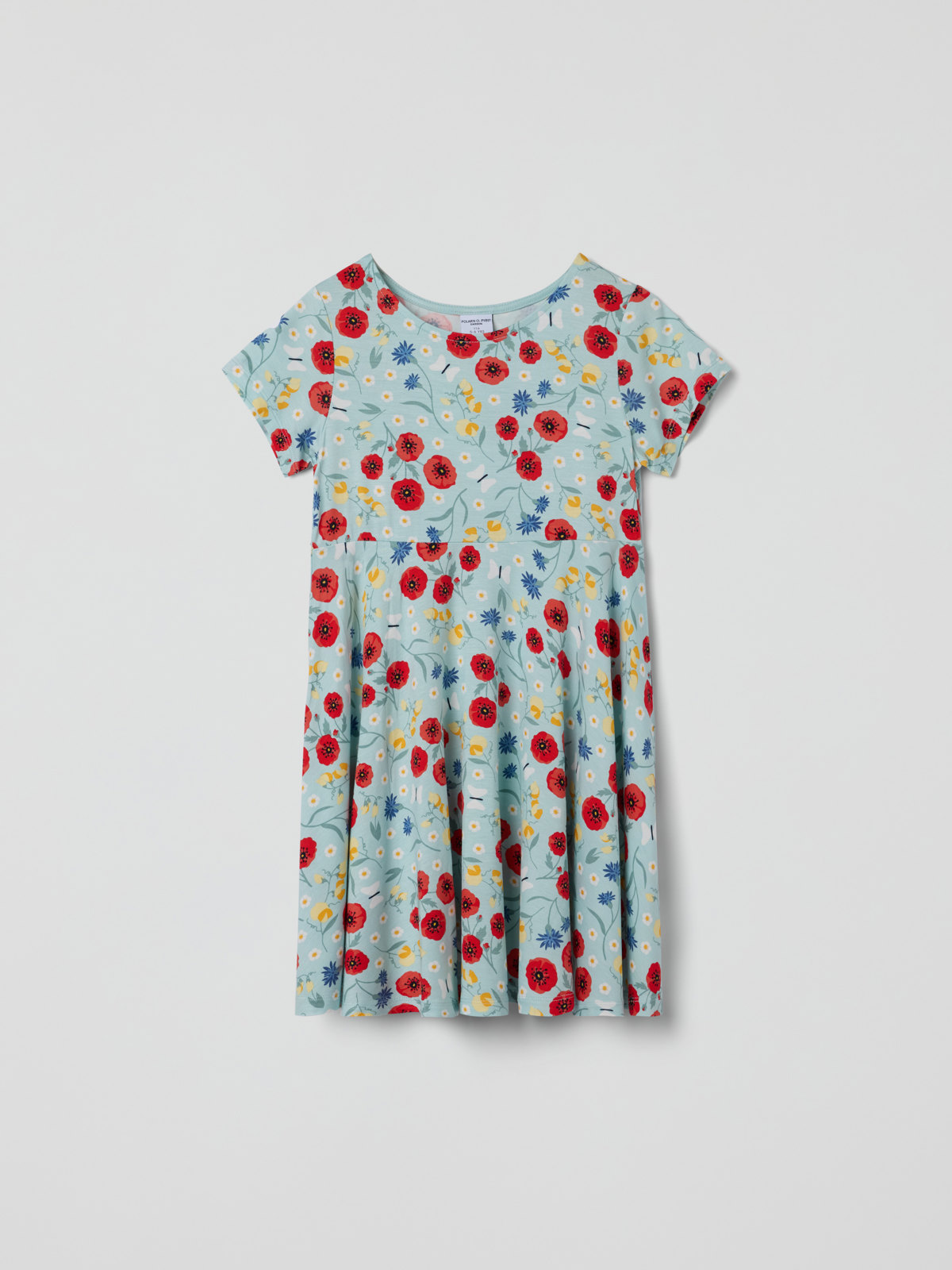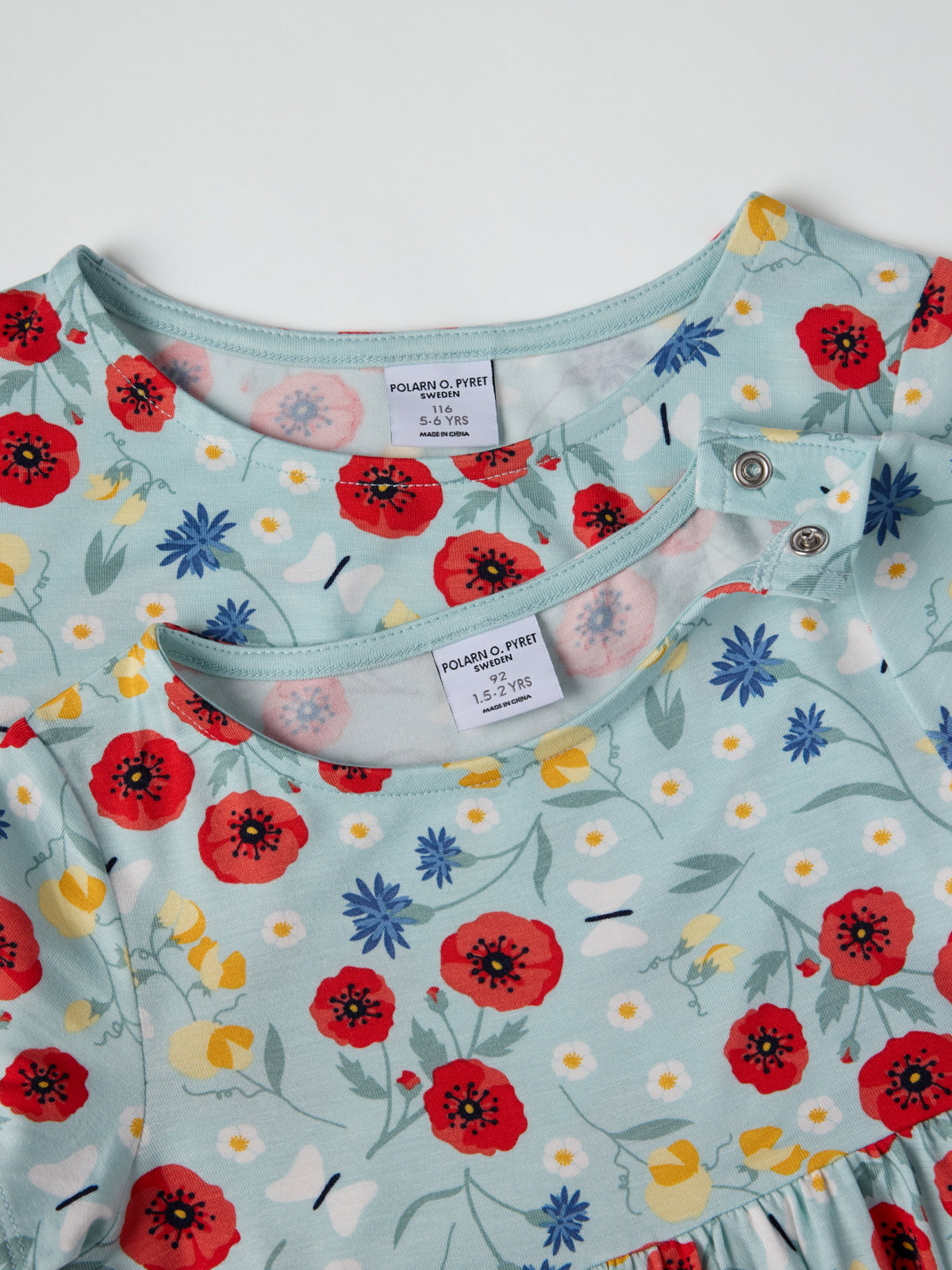 Kurzärmliges Drehkleid aus luftig-leichtem Trikot aus Ecovero™ Viscose. Das darf in keiner Sommergarderobe fehlen! Das Kleid ist durchgehend mit Blumen bedruckt und hat ein besonders weit geschnittenes Rockteil, das beim Drehen wunderschön schwingt. Es wird im Rücken mit einer Knopfleiste geschlossen.