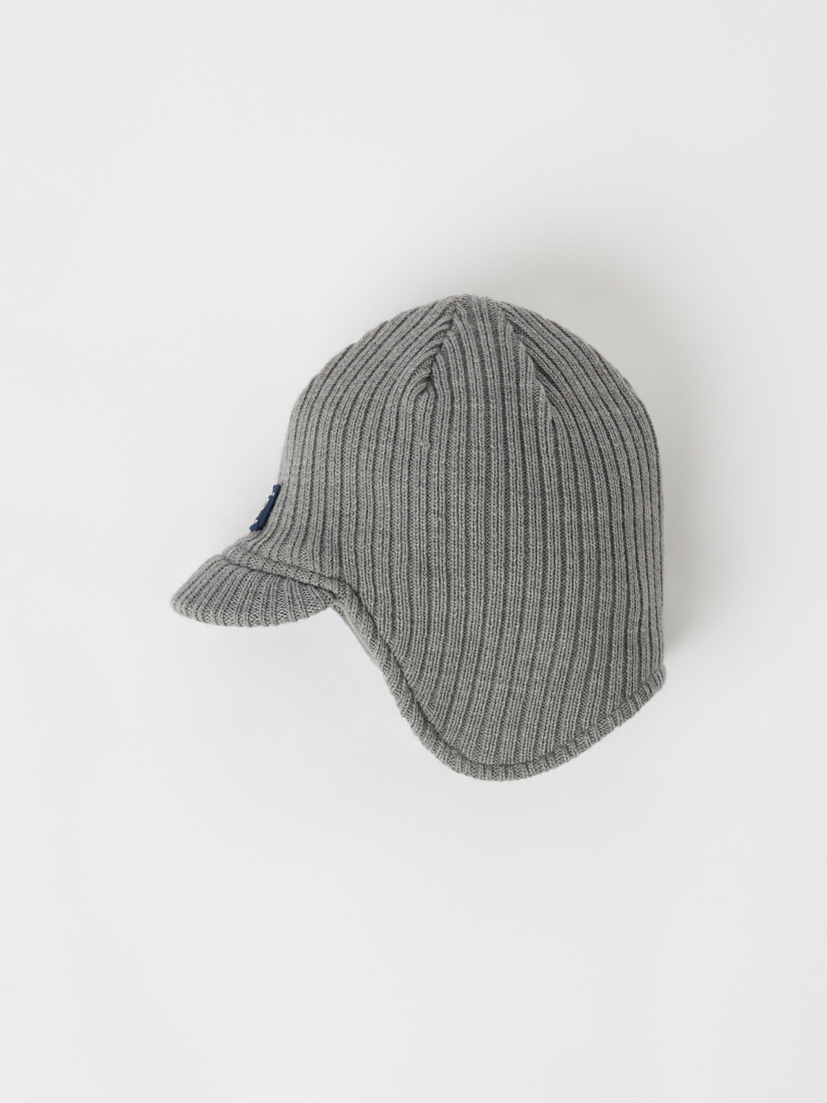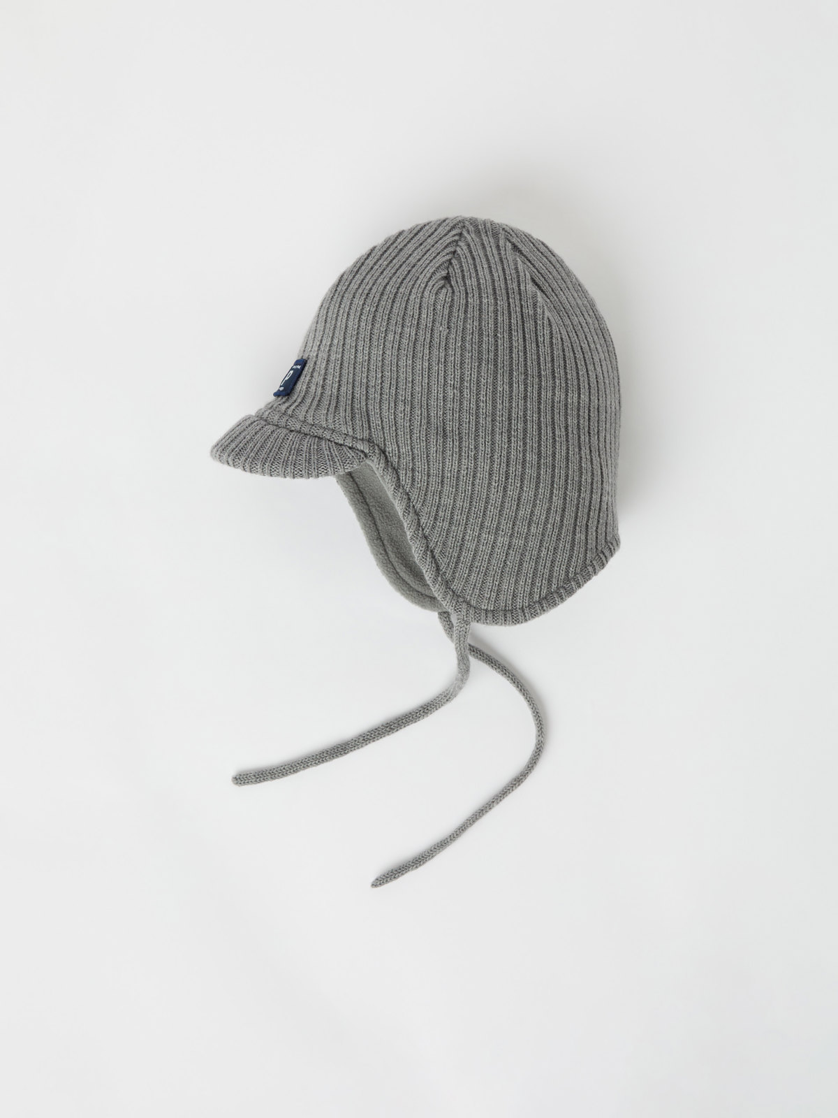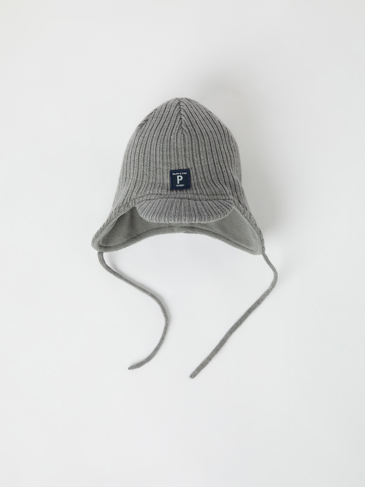 Rippenstrickmütze aus warmer Wolle mit weichem Fleecefutter aus recyceltem Polyester. Die Mütze ist mit einem Schirm versehen, der vor Wind und Wetter schützt. In den kleinsten Größen sorgt ein Bindeband unter dem Kinn dafür, dass die Mütze nicht verrutscht.