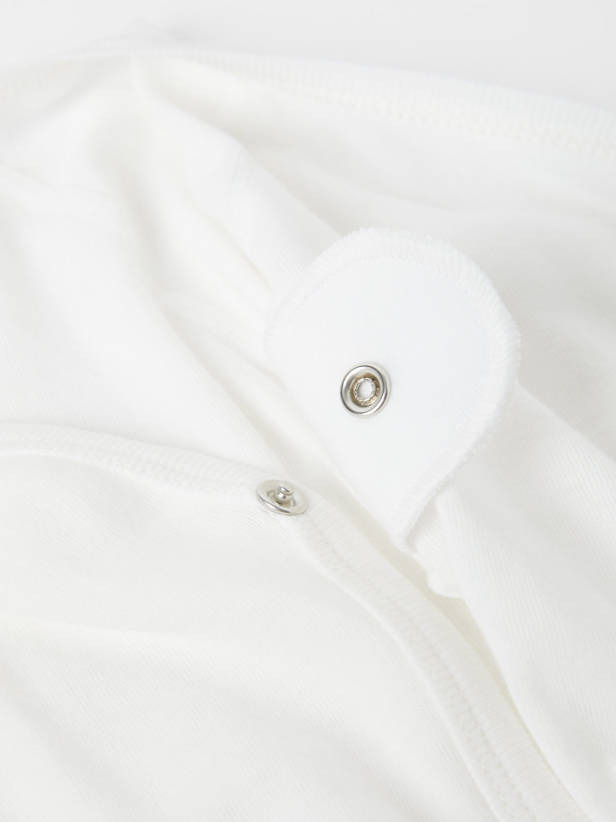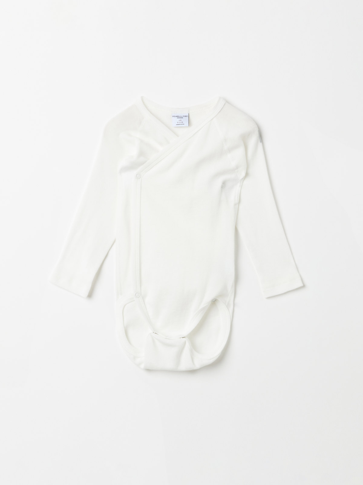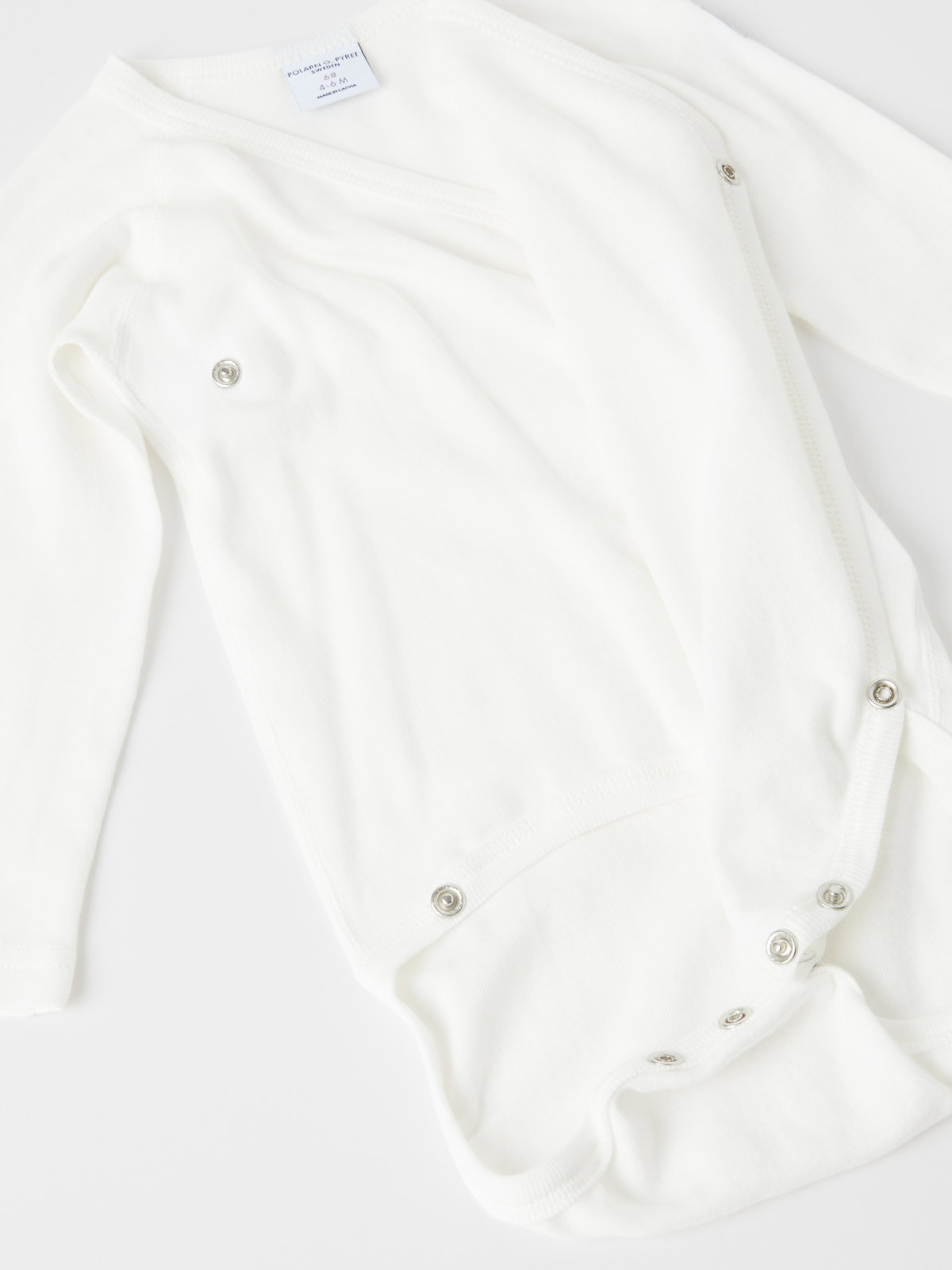 Wickelbody für Neugeborene aus Bio-Baumwolle. Der Body hat unser klassisches Streifenmuster und weiche Rippenbündchen an den Ärmelabschlüssen, die du herunterschlagen kannst, wenn dein Baby ein wenig gewachsen ist. Die Druckknöpfe entlang der Wickelöffnung und im Schritt erleichtern das Anziehen und Wickeln.