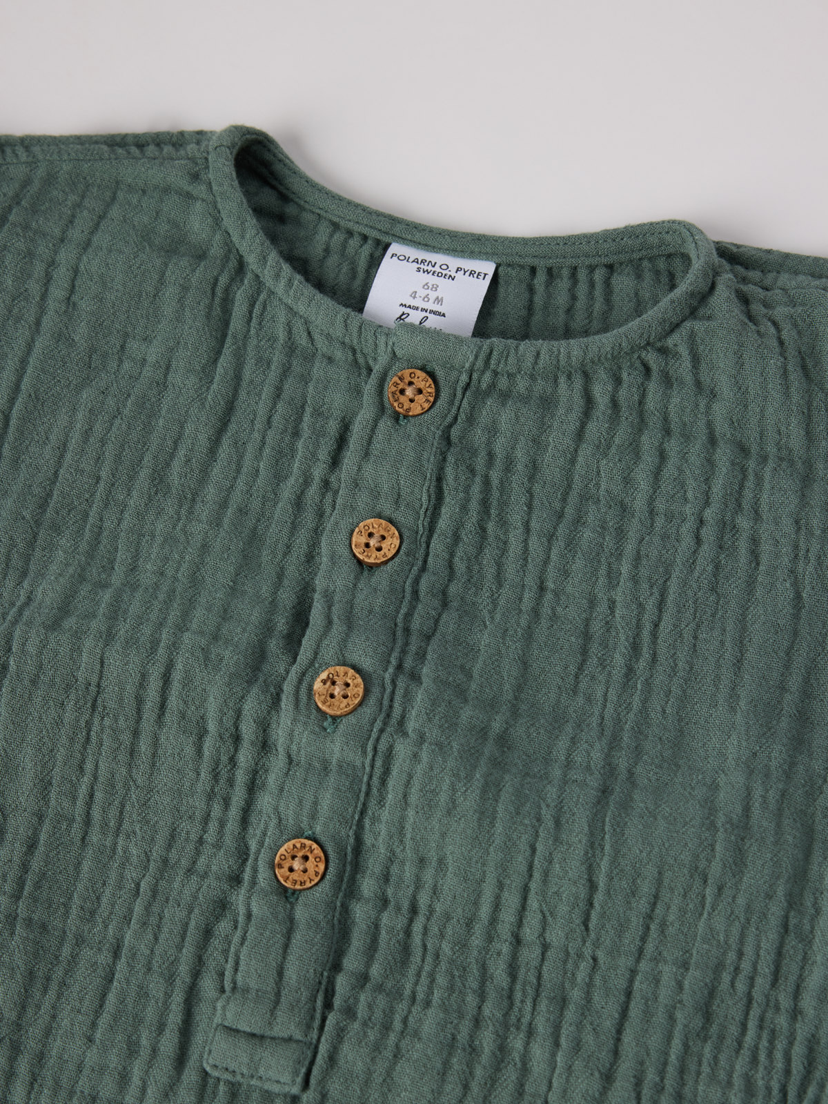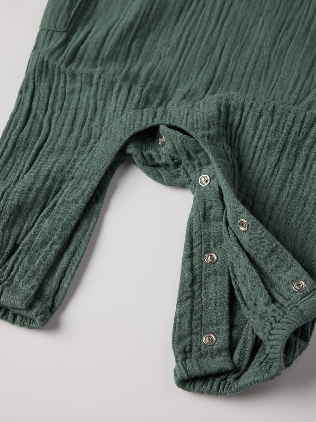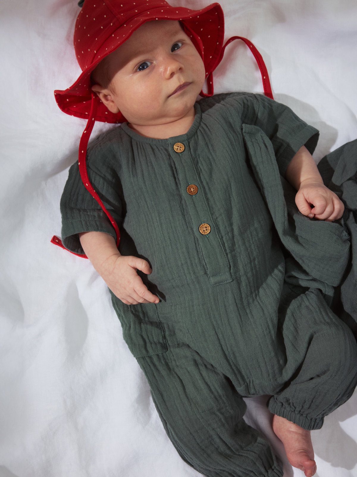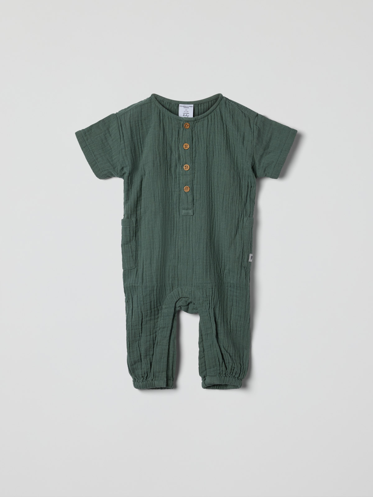Großzügig geschnittener, kurzärmliger Playsuit aus weichem Musselin aus 100 % Bio-Baumwolle für Babys; ein richtiges Lieblingsteil für den Sommer! Der Playsuit hat vorne einen Knopfverschluss und zwei große Taschen sowie dehnbare Beinabschlüsse für eine bequeme Passform.