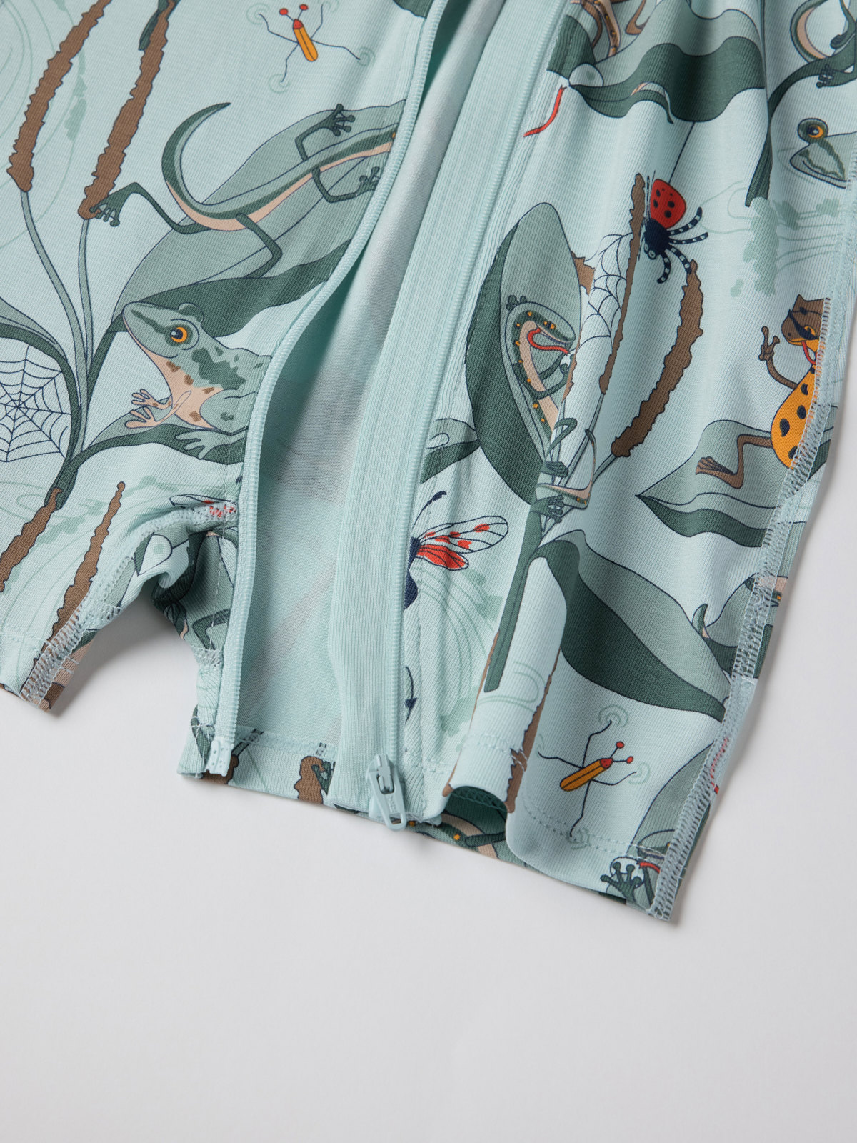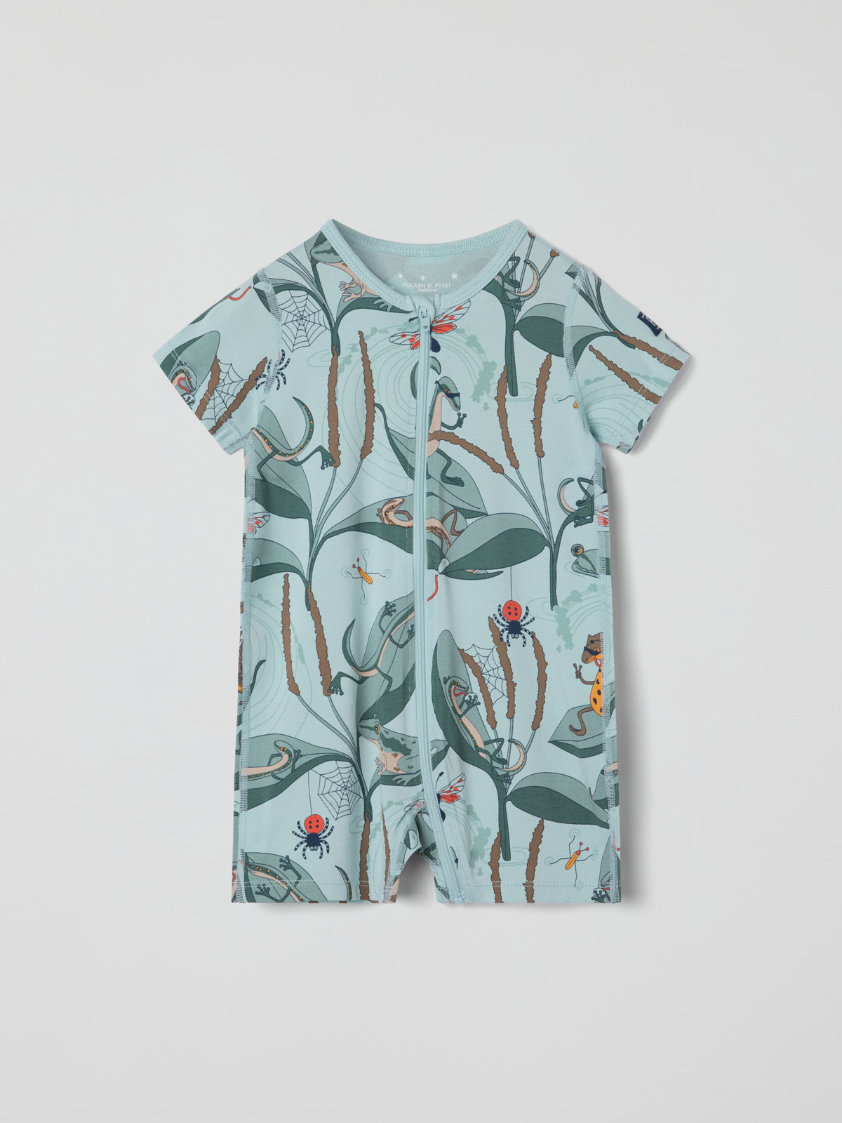 Kurzer Schlafoverall aus luftig-leichtem Trikot aus Tencel™ lyocell; perfekt für warme Nächte! Der Overall hat besonders weiche Nähte, die sanft zu empfindlicher Haut sind. Er ist durchgehend mit Eidechsen bedruckt.