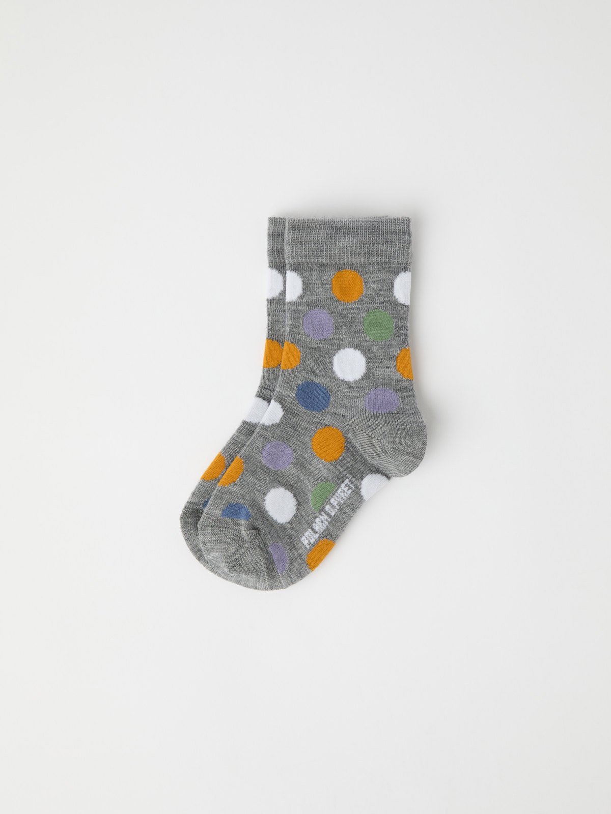 Söckchen mit Pünktchenmuster aus dünner Merinowolle, die bequem an kleinen Füßen sitzen und angenehm wärmen. Die Größe ist an der Innenseite des Schafts angegeben. Dort ist auch Platz für den Namen des Kindes. Ordnung halten ist so einfach!