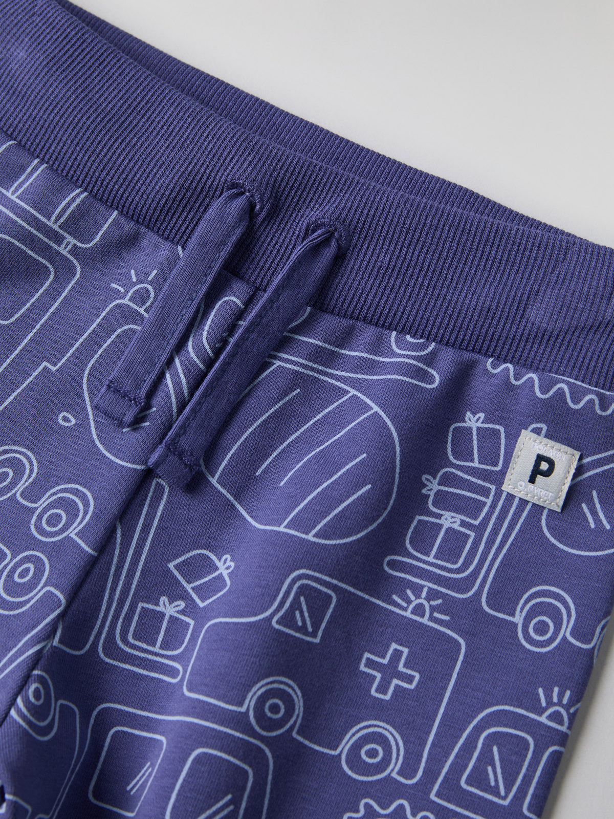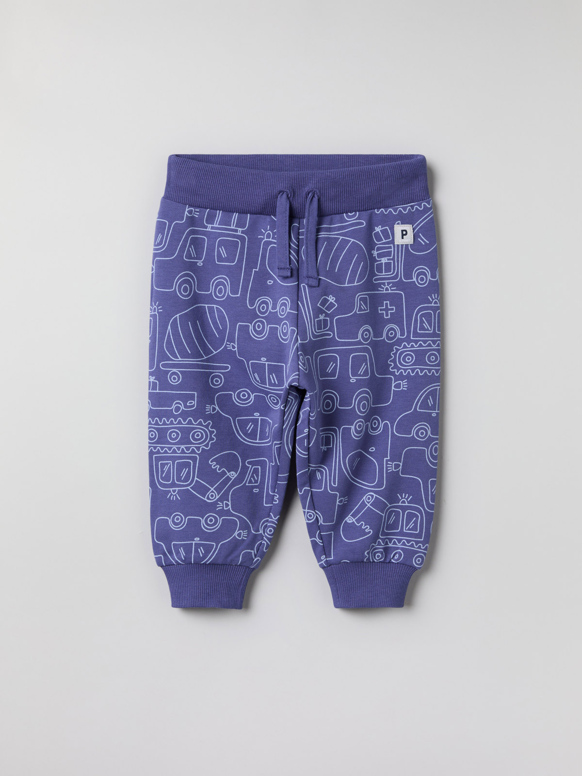 Die Hose ist durchgehend mit einem Autos bedruckt und hat Rippenbündchen in der Taille und an den Beinabschlüssen. In der Taille kann sie zusätzlich mit einem Bindeband reguliert werden.