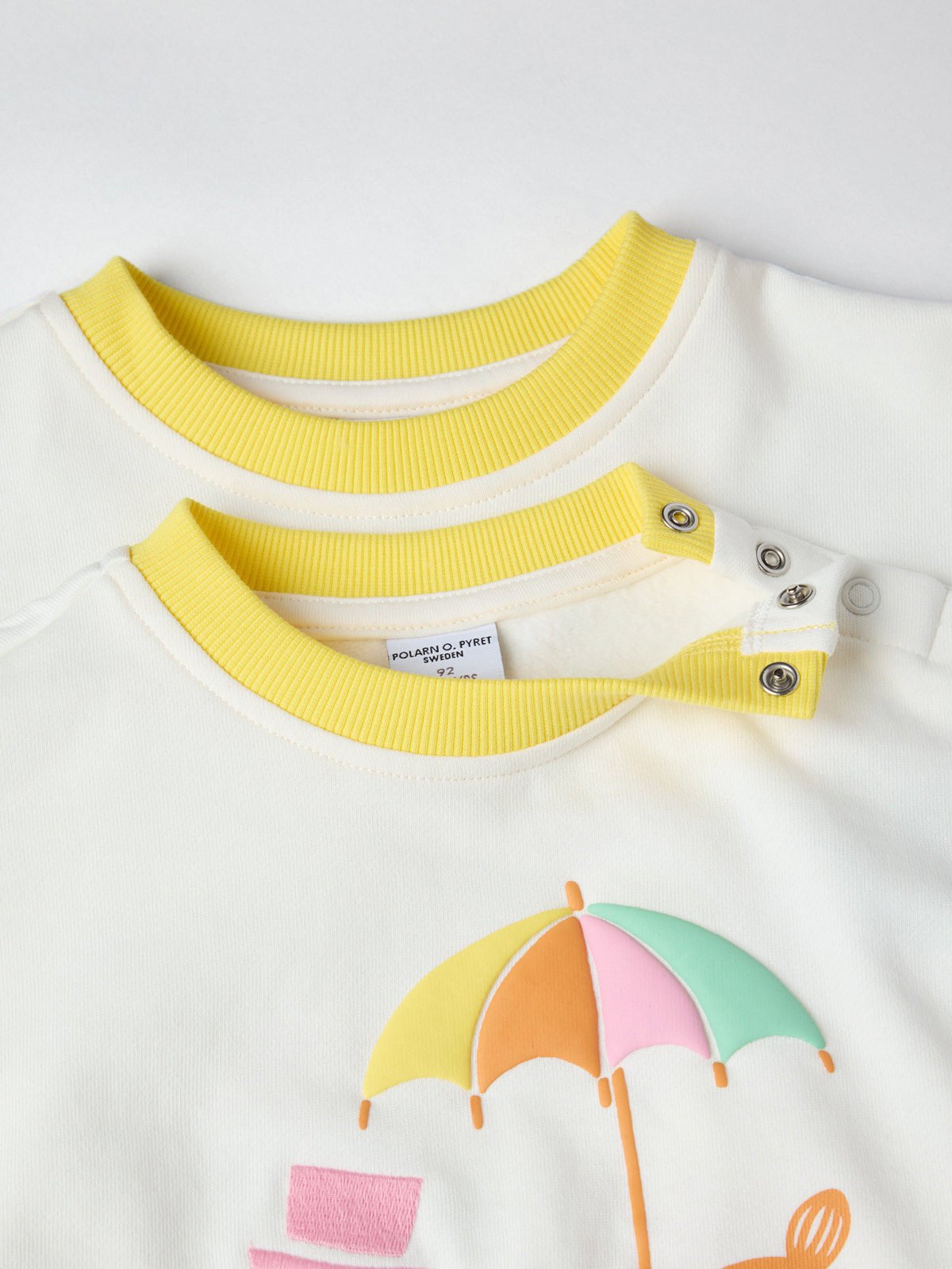 Die Größen 86 bis 92 werden auf einer Schulter mit Druckknöpfen geschlossen, um das An- und Ausziehen zu erleichtern.