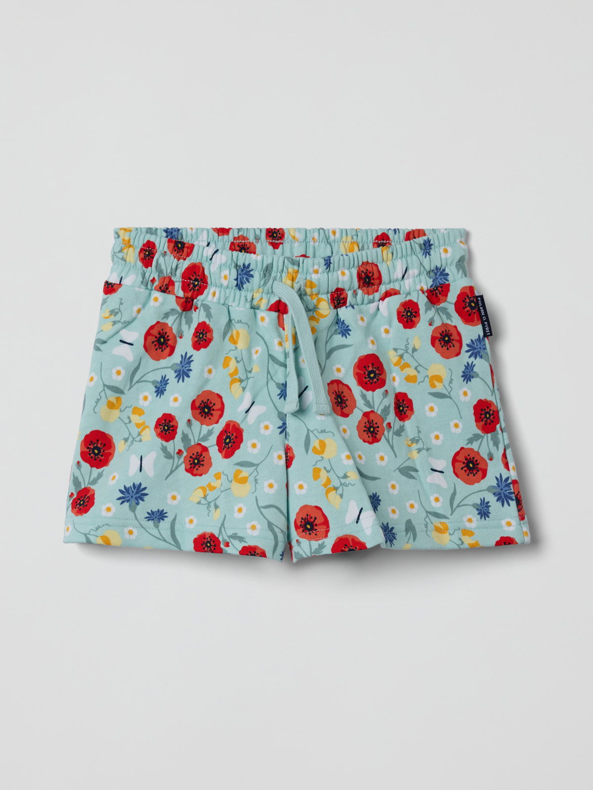 Geblümte Shorts in weicher Sweatshirtqualität aus 100 % Bio-Baumwolle; ein perfektes Alltagsteil für die Sommergarderobe! Der elastische Bund der Shorts kann mit einem Bindeband reguliert werden.