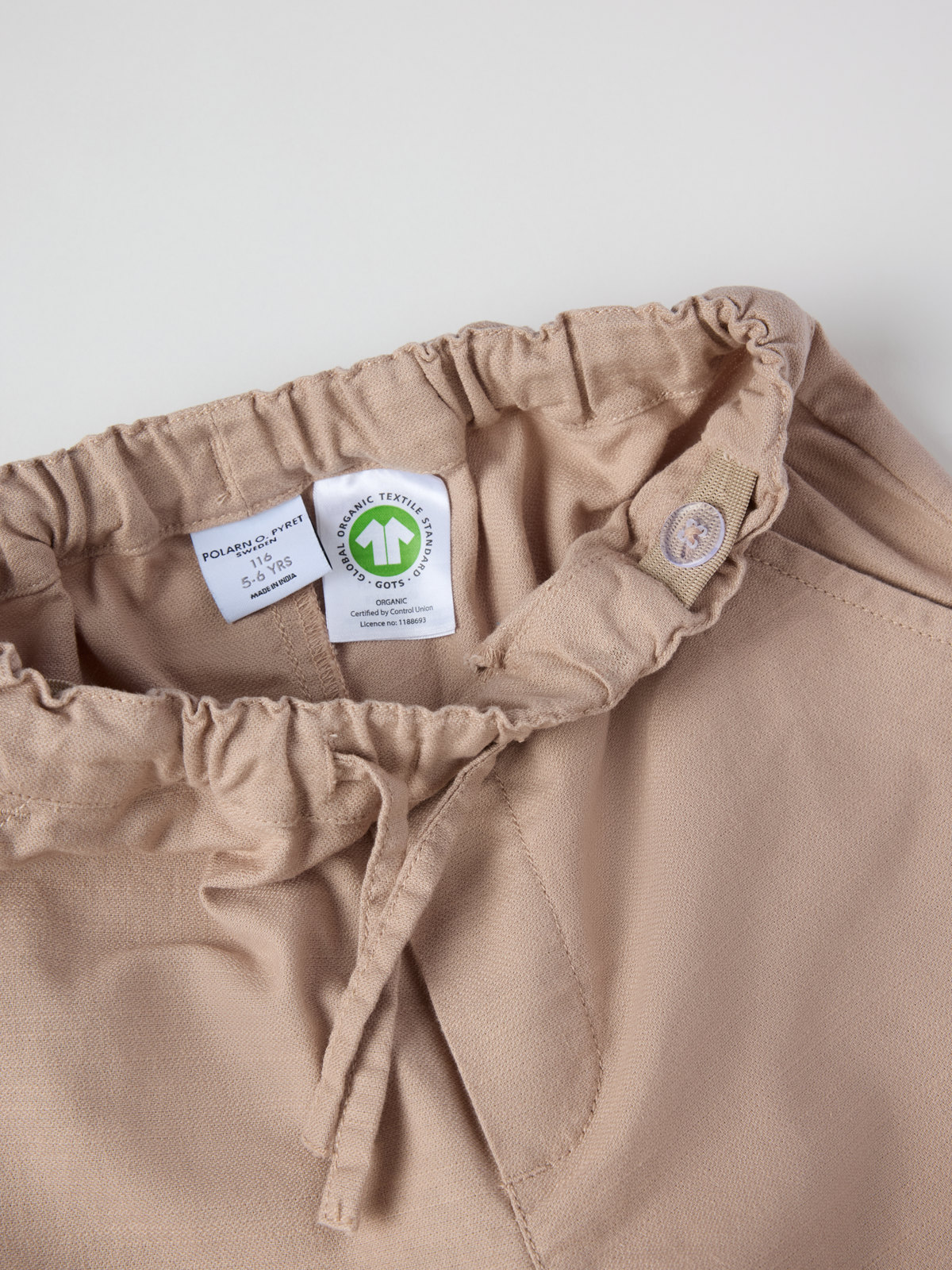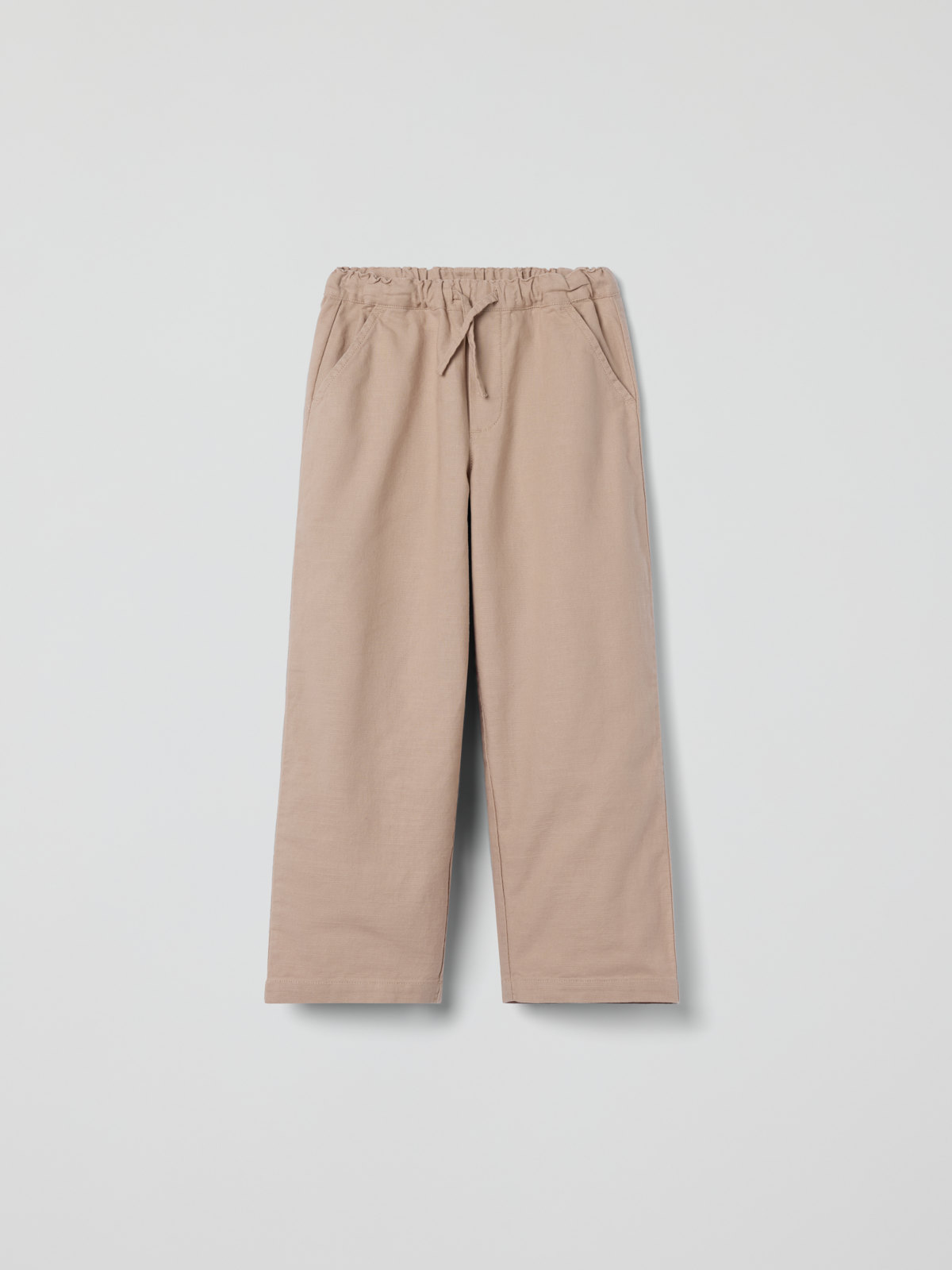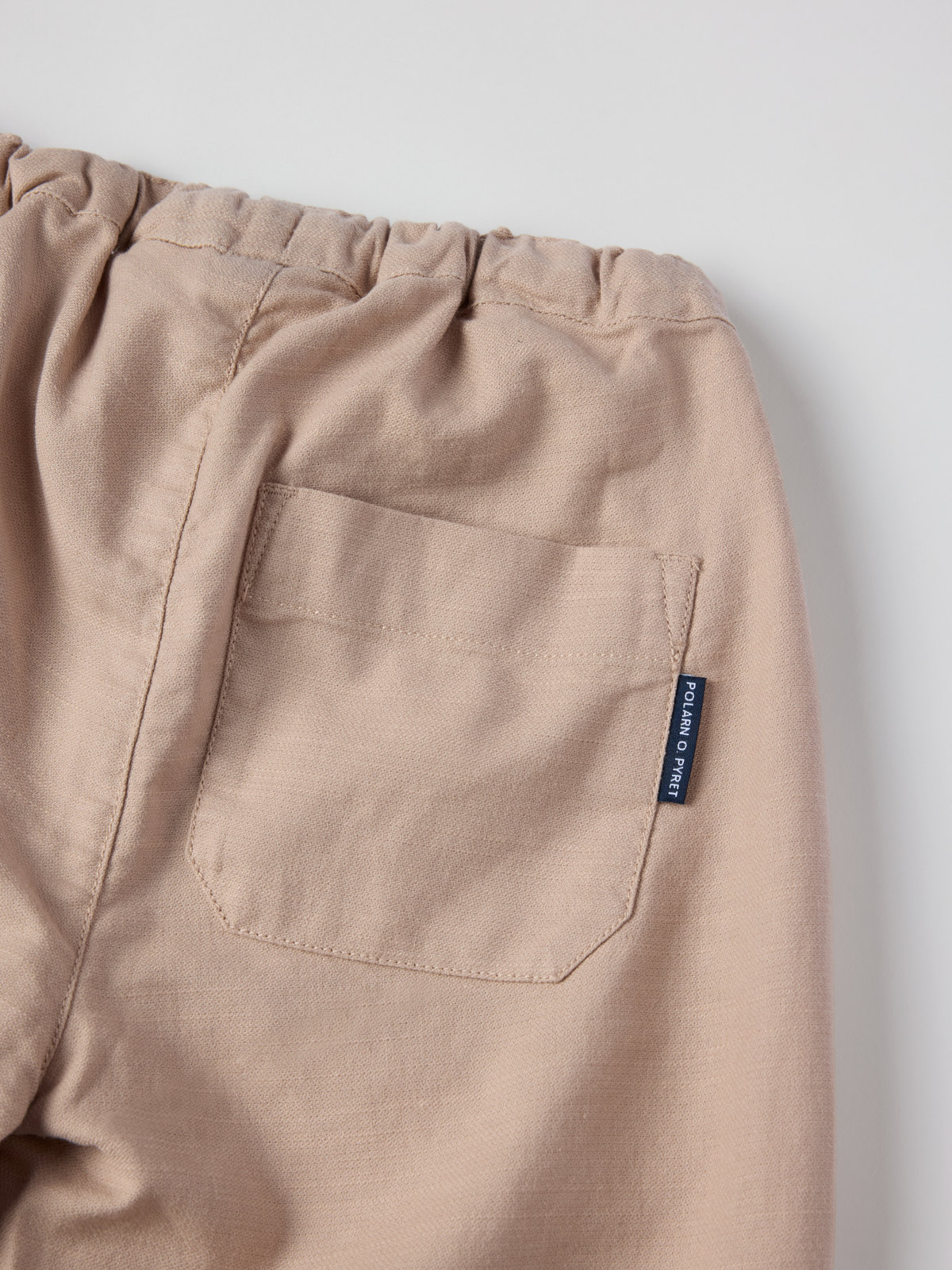 Einfarbige Hose aus dünner Bio-Baumwolle im Leinenlook – hoher Tragekomfort im Alltag und zu feierlichen Anlässen! Die Hose hat vorne zwei Eingrifftaschen und gerade geschnittene Hosenbeine; der elastische Bund kann mit einem Bindeband reguliert werden.