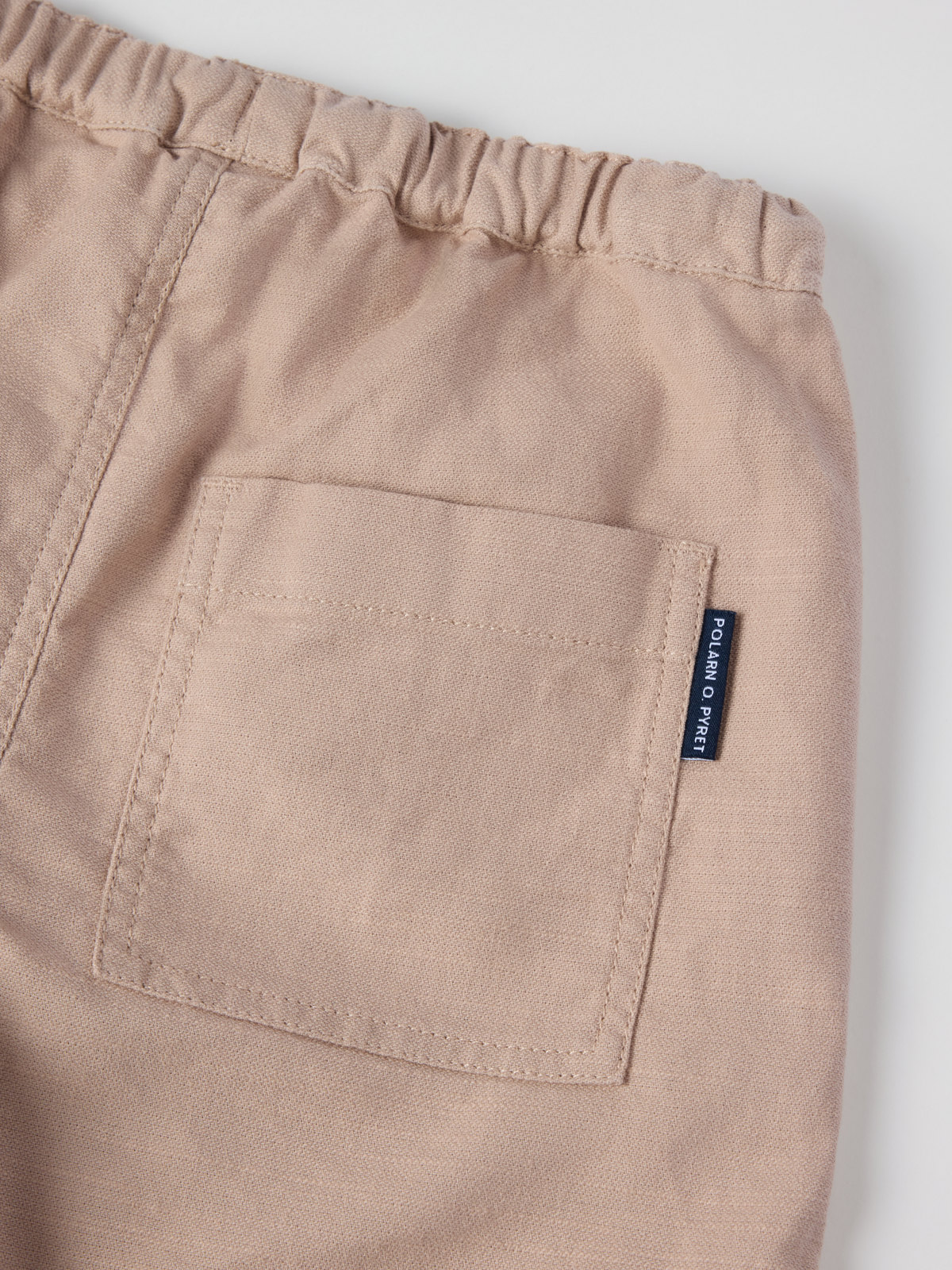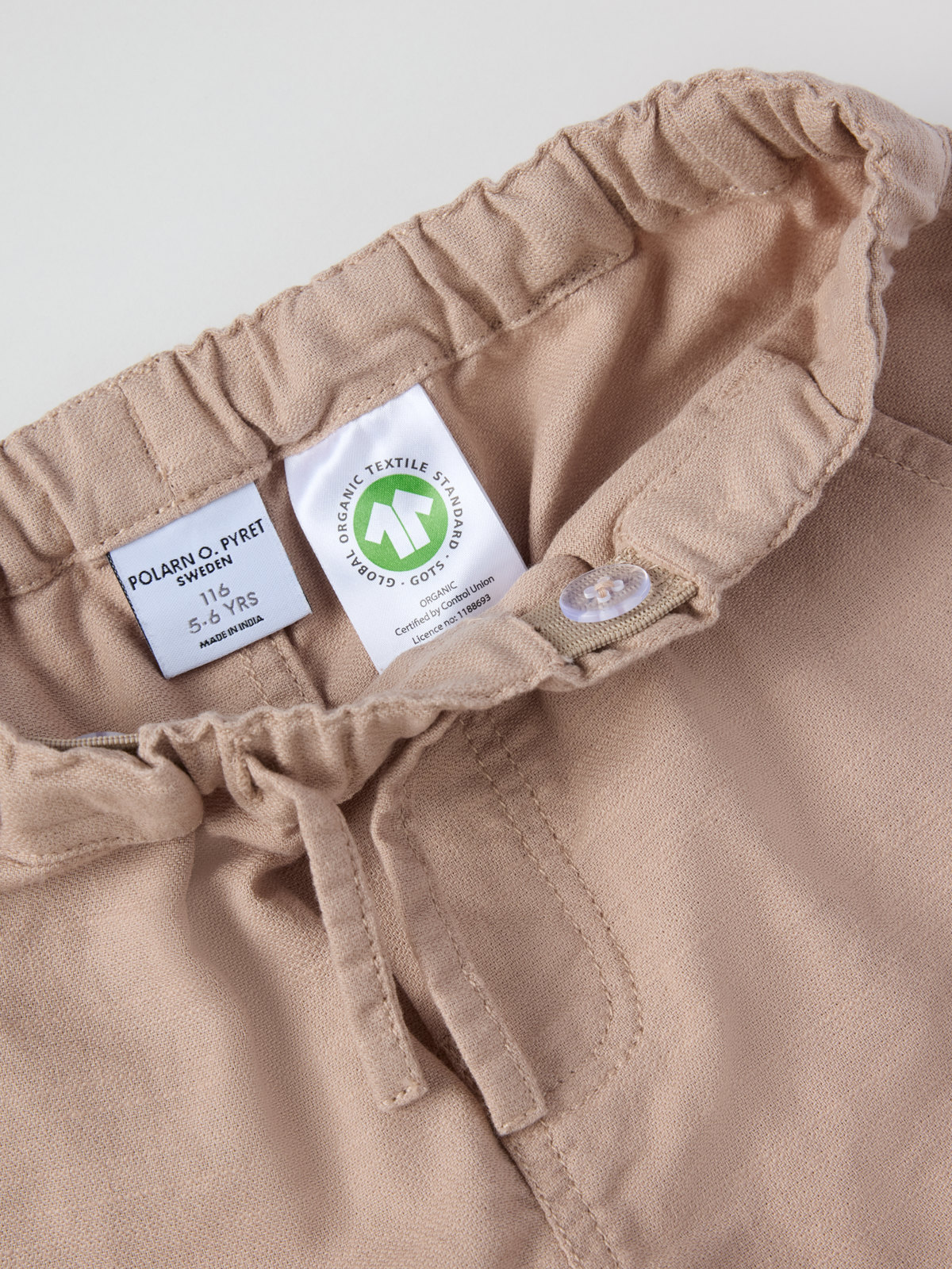 Einfarbige Shorts aus leichter Bio-Baumwolle im Leinenlook; herrlicher Tragekomfort im Alltag und zu festlichen Anlässen. Shorts mit zwei Eingrifftaschen vorne und elastischem Bund, der mit einem Bindeband reguliert werden kann.