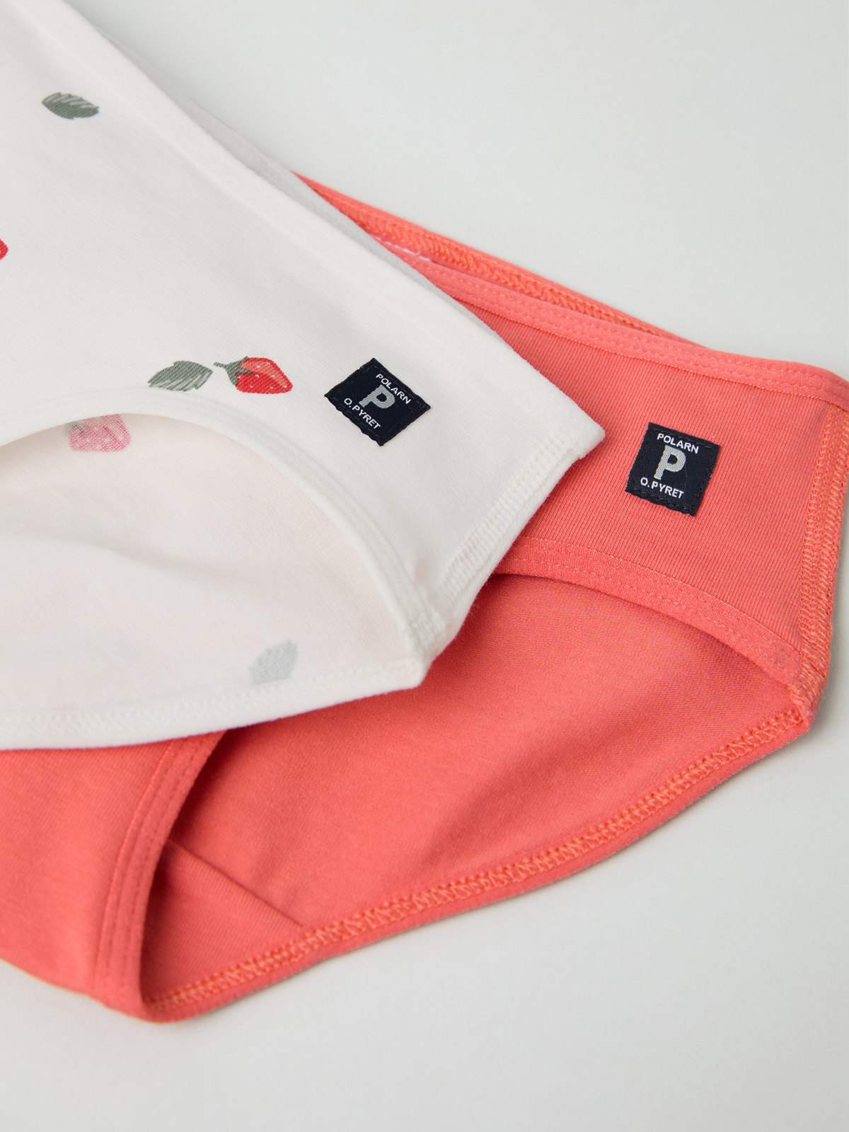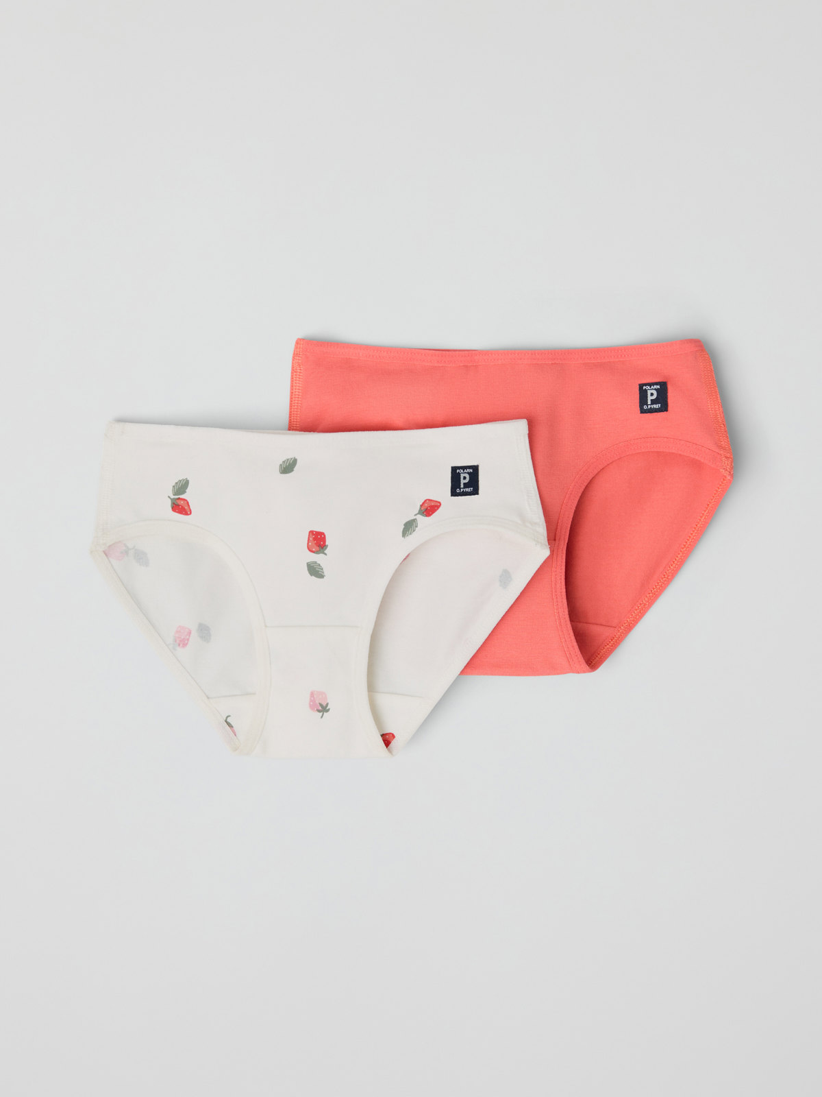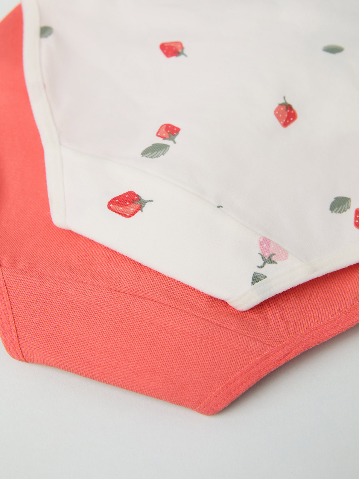 2er-Pack Unterhöschen für Mädchen aus Bio-Baumwolle, bei denen dank besonders weicher Nähte nichts scheuert. Das eine Höschen ist mit Beeren durchgehend gemustert, das andere ist einfarbig.