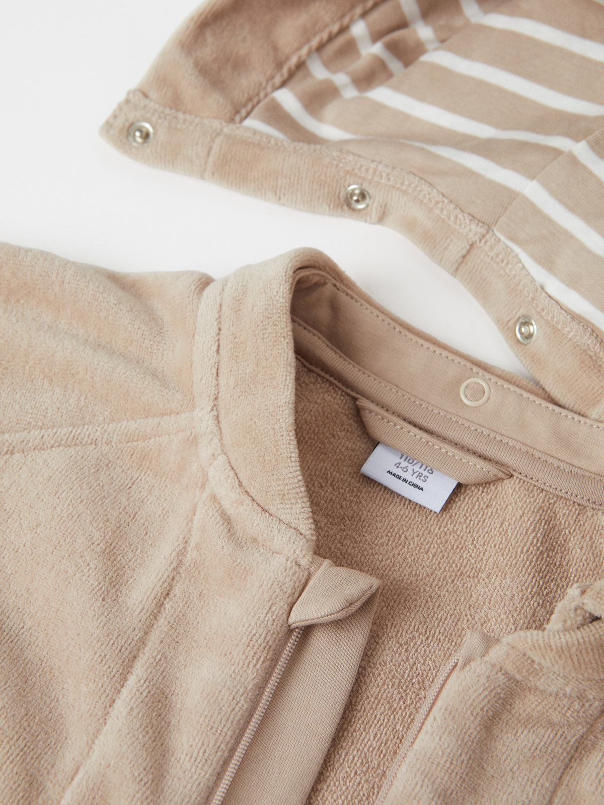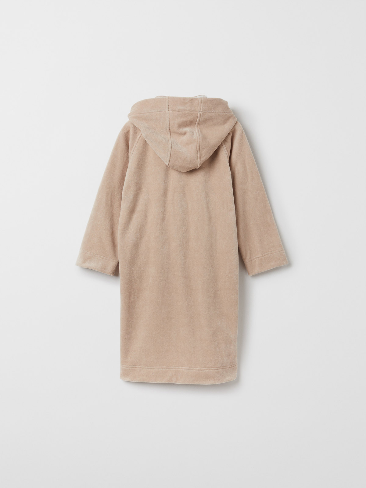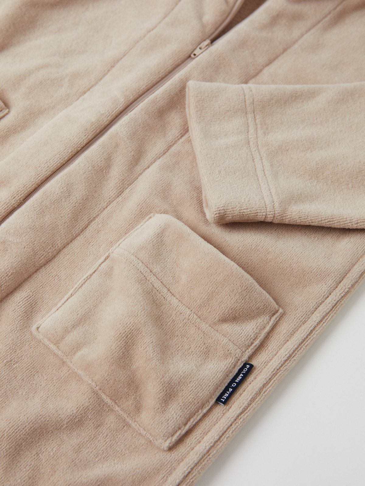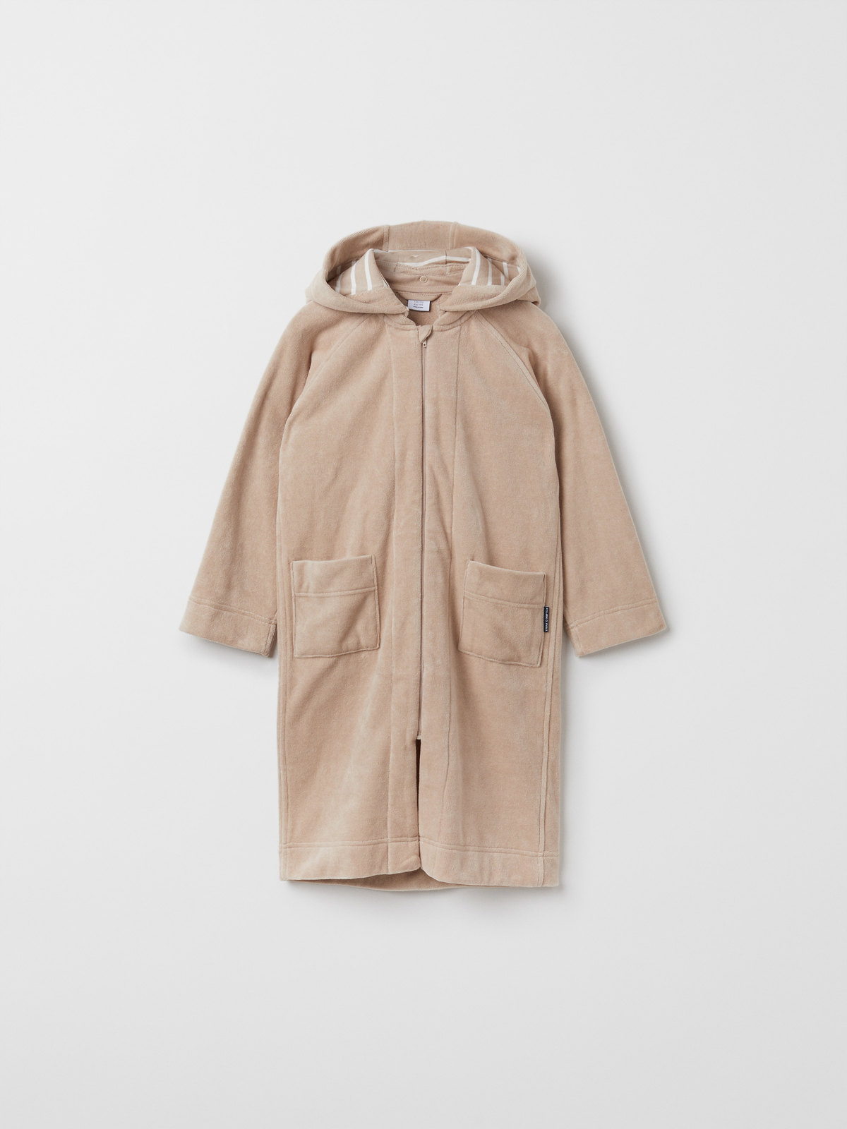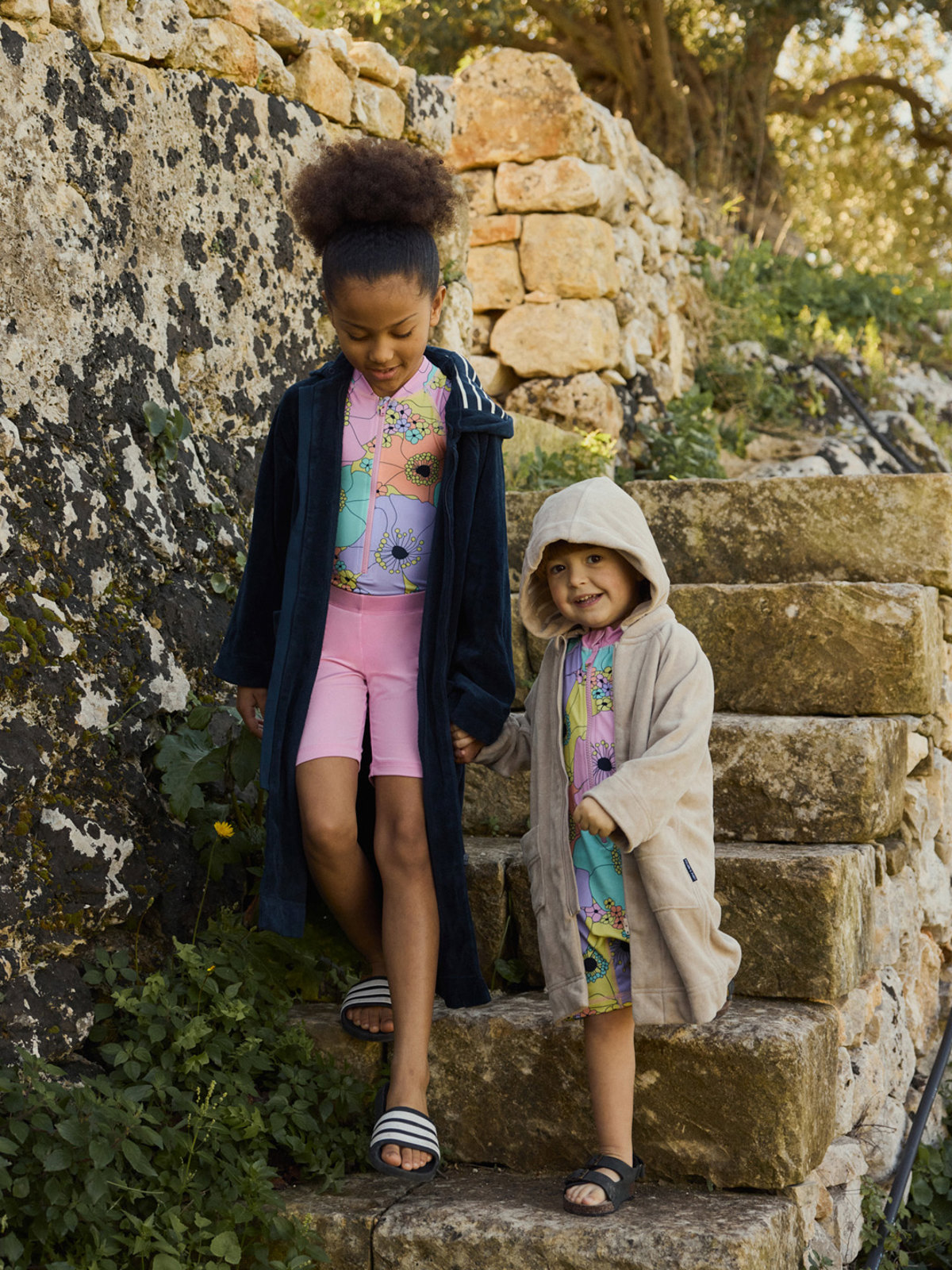 Der Bademantel wird aus anschmiegsamer Bio-Baumwolle und recyceltem Polyester gefertigt. Er hat eine abnehmbare Kapuze, die mit Druckknöpfen befestigt wird, und ein weiches Baumwollfutter mit unseren klassischen Streifen. Der Bademantel reicht bis zur Mitte der Wade. Er hat vorne zwei Taschen und wird mit Reißverschluss geschlossen.