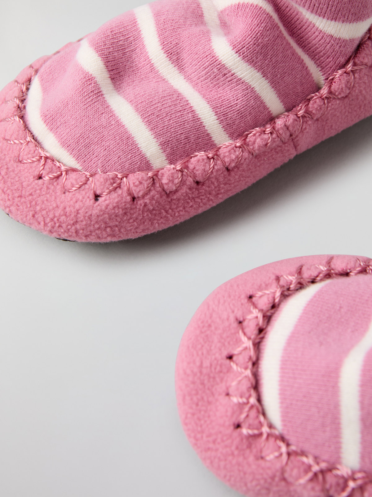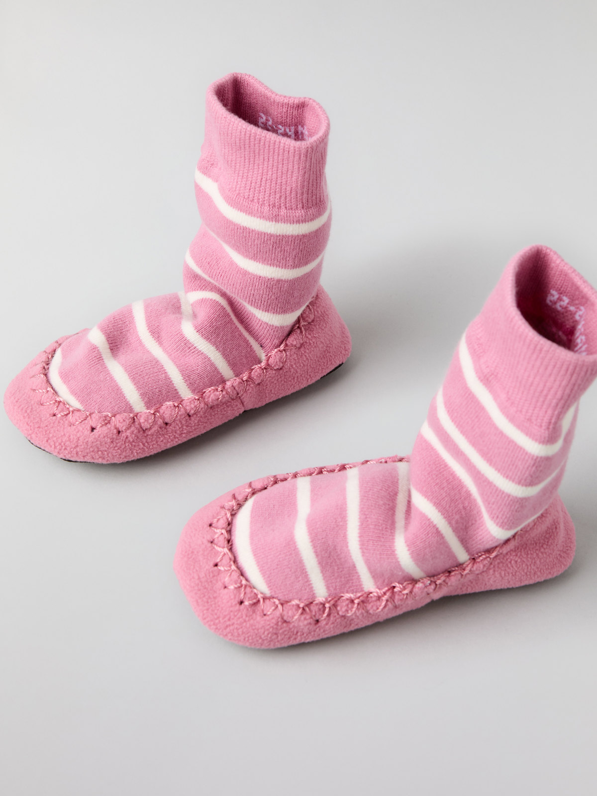 Die Mokassins haben eine Sohle aus smartem Shellmaterial mit einer besonders griffigen Oberfläche und weichem Fleecerand. Das Obermaterial aus gestricktem Trikot sorgt für eine bequeme Passform und erleichtert das An- und Ausziehen.
