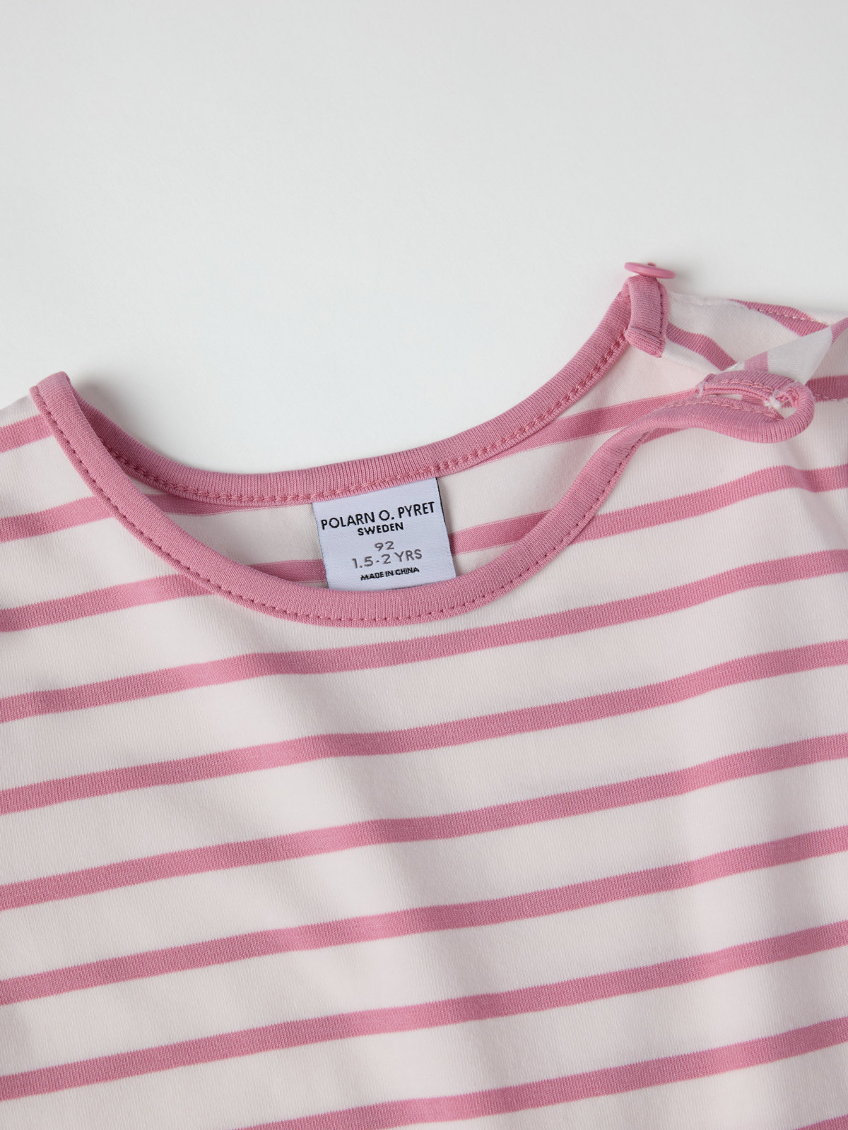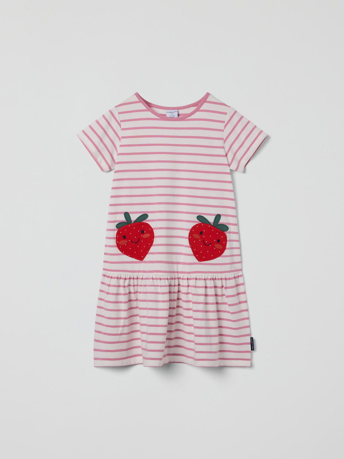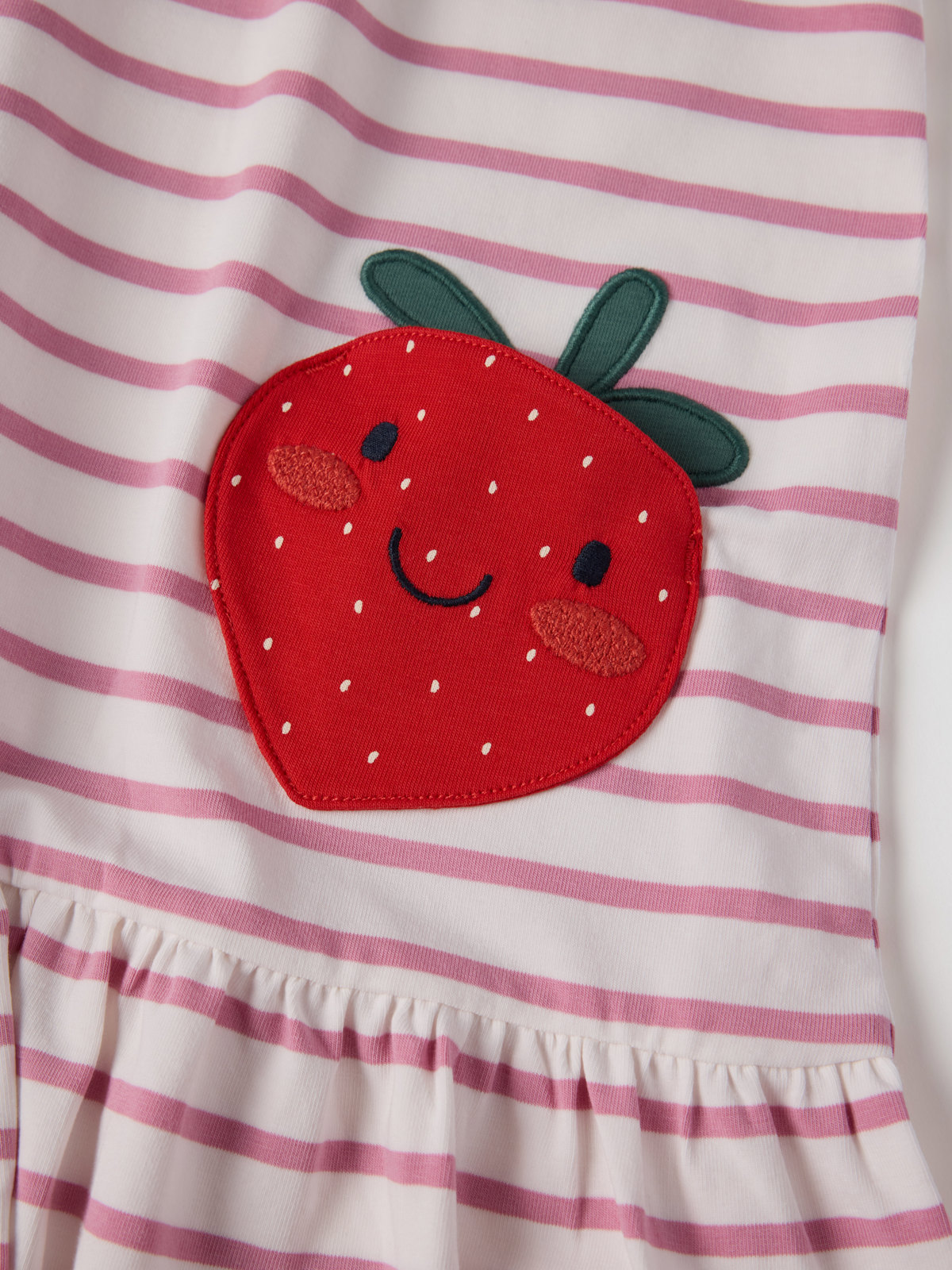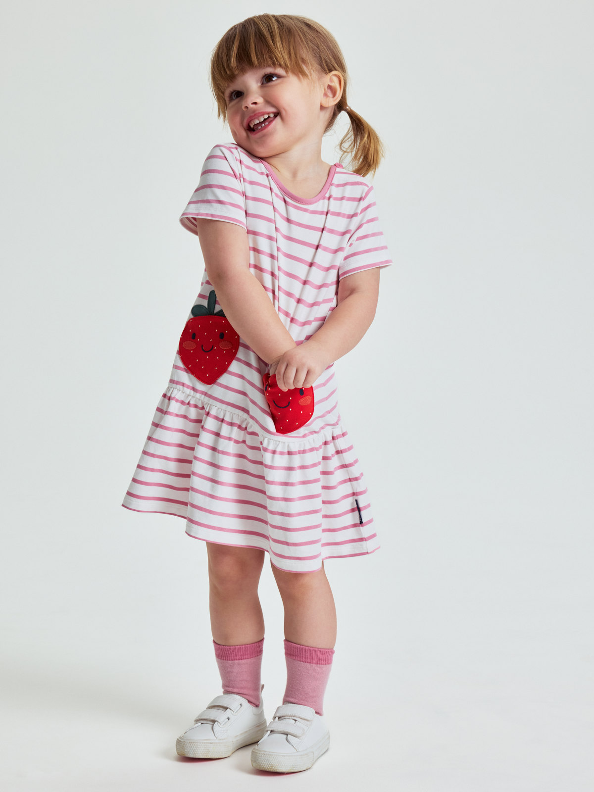 Kurzärmliges Kleid aus weicher Bio-Baumwolle mit verspielten Taschen in Form von Erdbeeren; ein Lieblingssommerteil für Alltag und festliche Anlässe! Das Kleid mit unseren klassischen Streifen ist am unteren Saum mit einer bezaubernden Rüsche verziert.