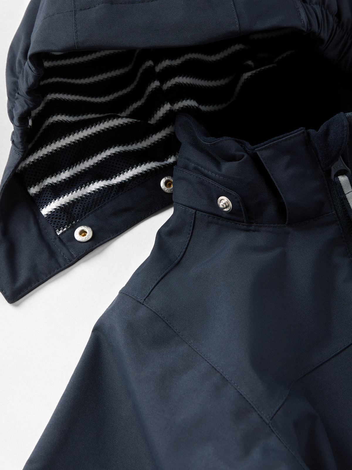 • Die verstellbare Kapuze hat Druckknöpfe für mehr Sicherheit und kann abgenommen werden. Die seitlichen Gummizüge gewährleisten eine gute Passform