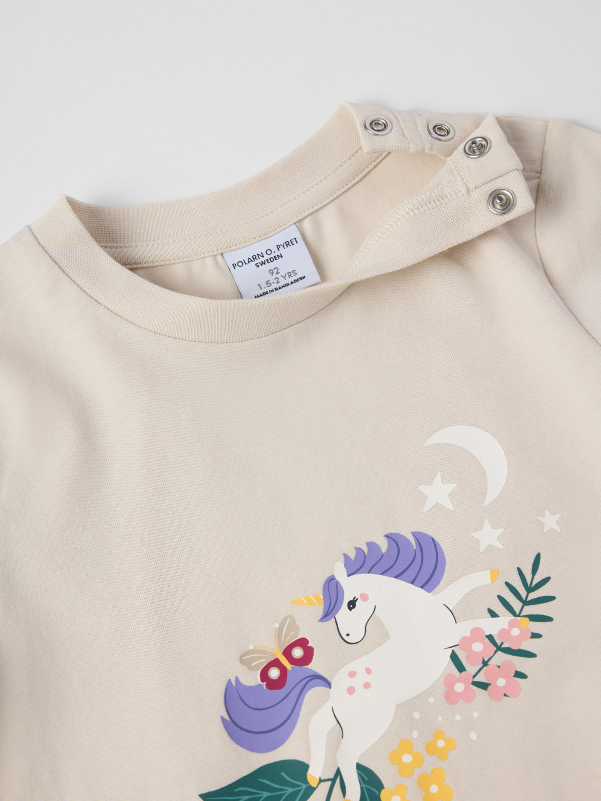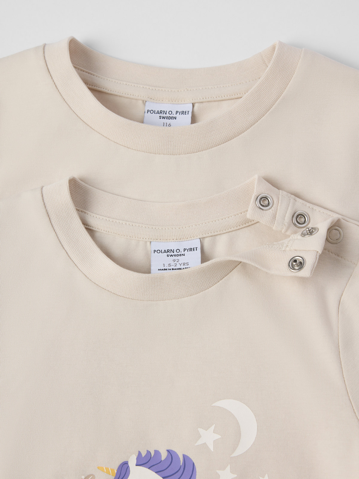 Die Größen 86 bis 92 werden hinten an einer Schulter mit Druckknöpfen geschlossen, um das An- und Ausziehen zu erleichtern.