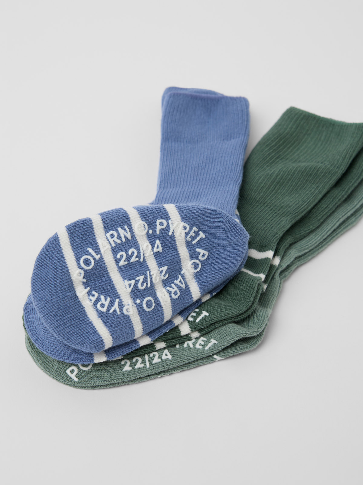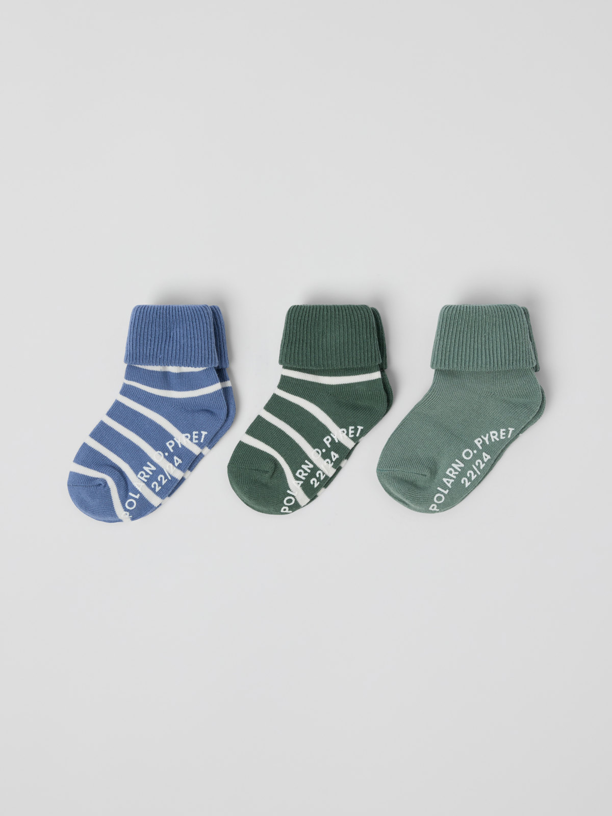 Hier kommt ein 3er-Pack Söckchen mit rutschhemmenden Noppen zum Auffüllen der Sockenschublade. Die Söckchen aus weicher Bio-Baumwolle haben Bündchen zum Umschlagen.