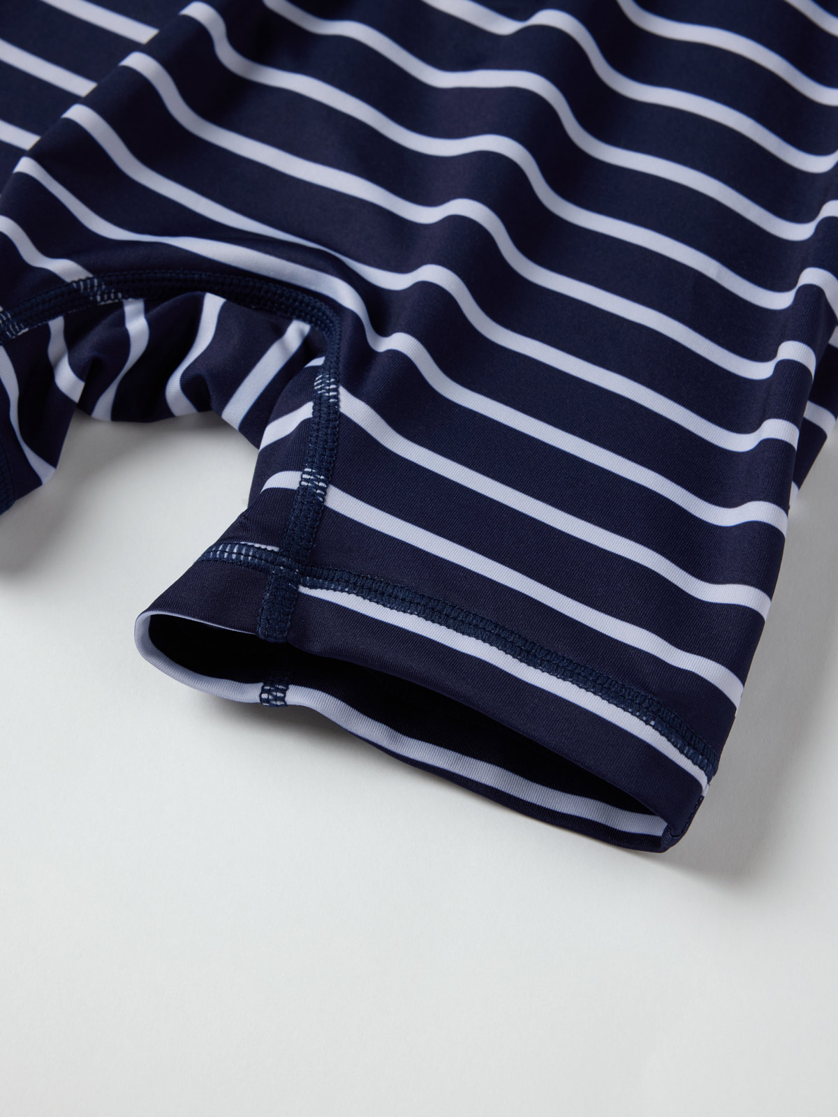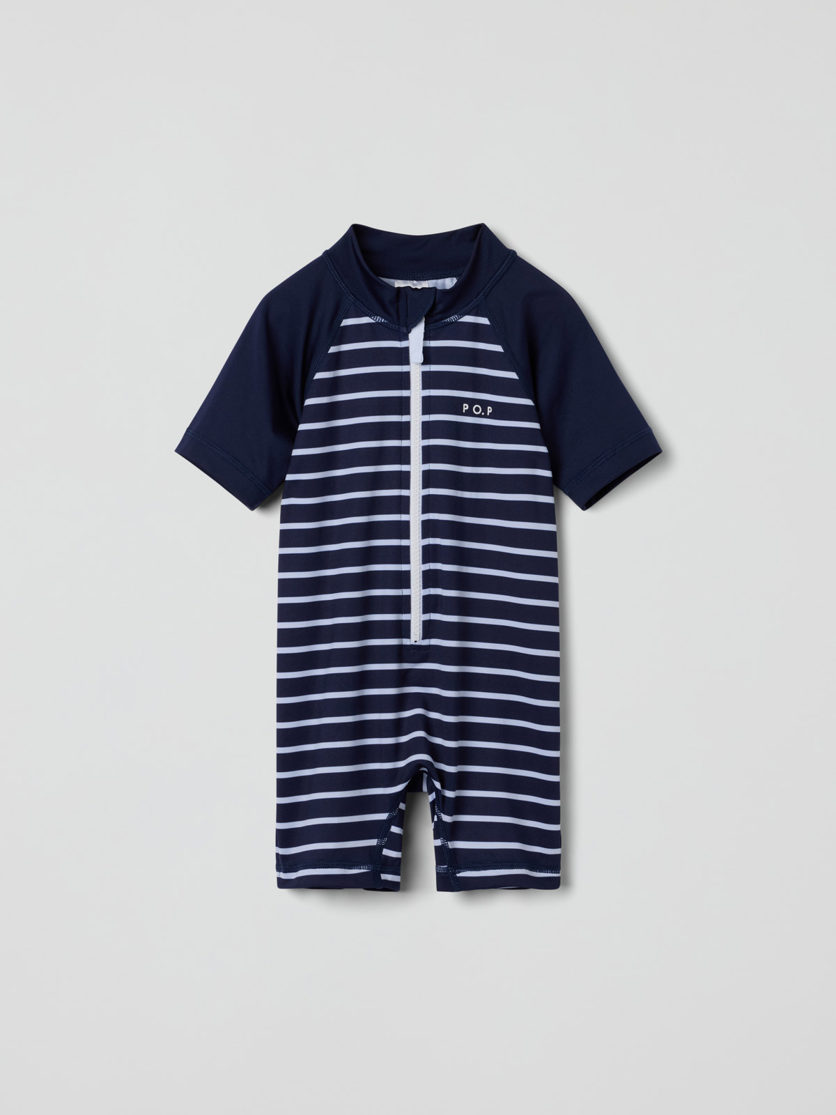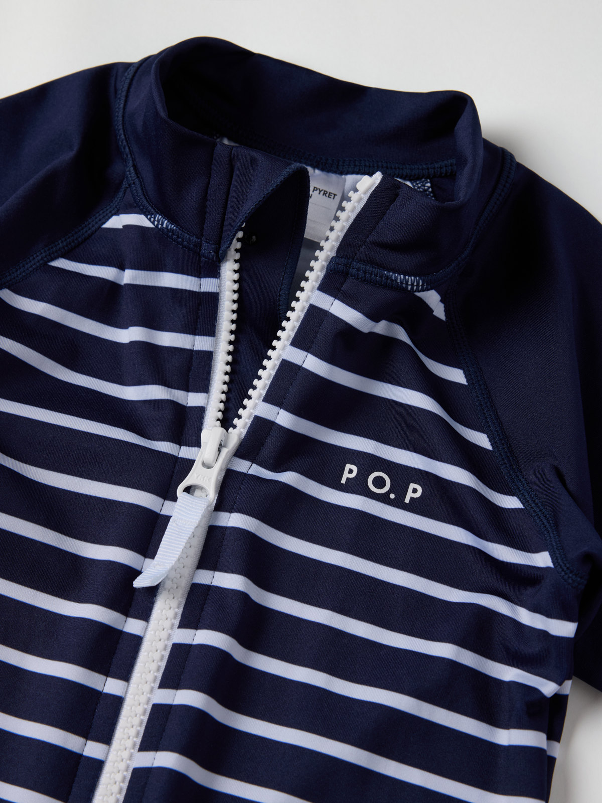 Unser klassischer, gestreifter UV-Anzug mit UPF 50 aus weichem und bequemem Material aus recyceltem Polyester mit besonders weichen Nähten, die nicht scheuern. Der Reißverschluss an der Vorderseite macht das An- und Ausziehen zum Kinderspiel und der Kinnschutz am oberen Ende sorgt dafür, dass an Hals und Wangen nichts kratzt.