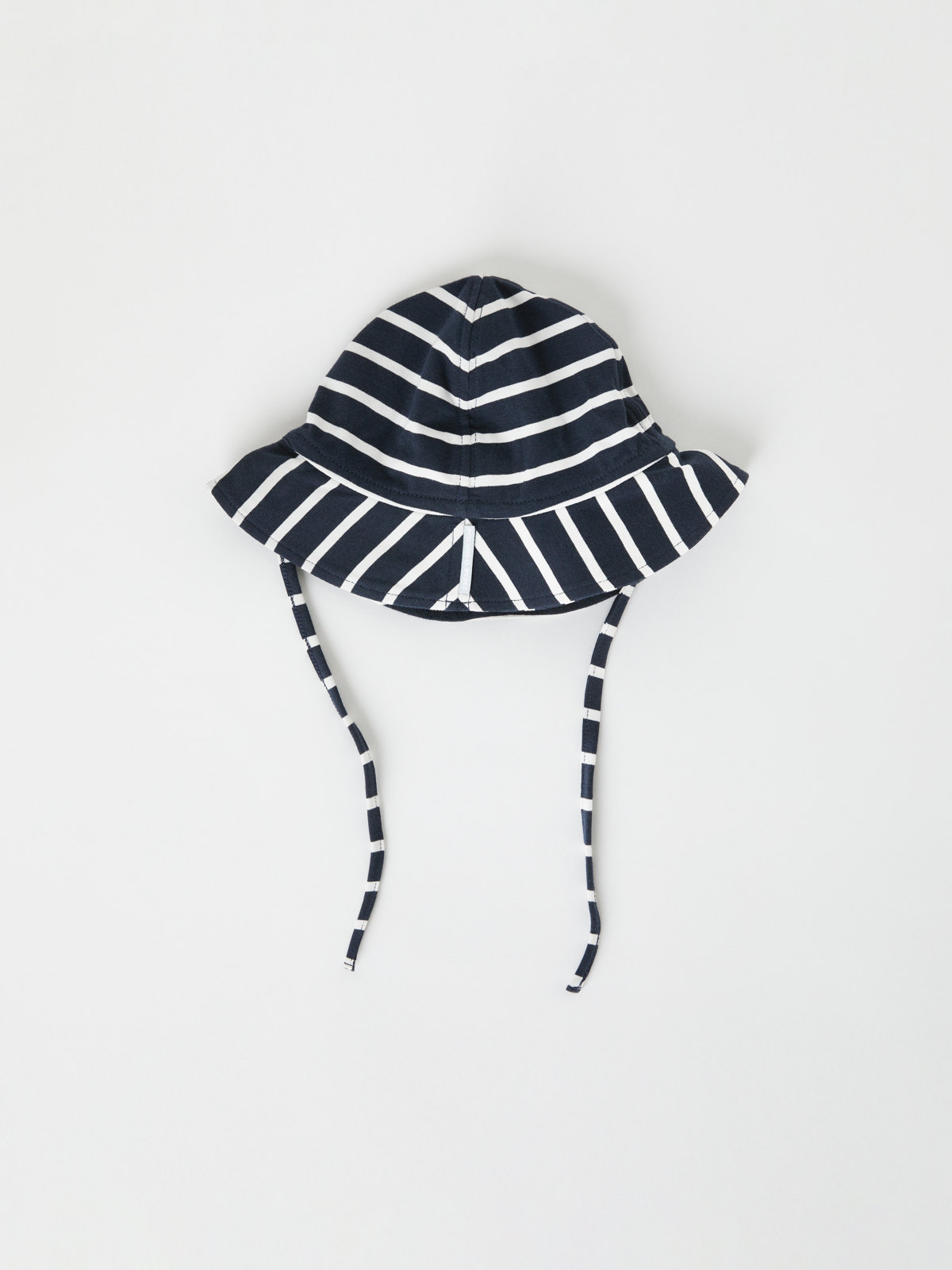 Schütze die empfindliche Haut deines Babys mit einem gestreiften Sonnenhut aus weicher Bio-Baumwolle. Die Bindebänder werden unterm Kinn geschlossen und sorgen dafür, dass der Sonnenhut nicht verrutscht.