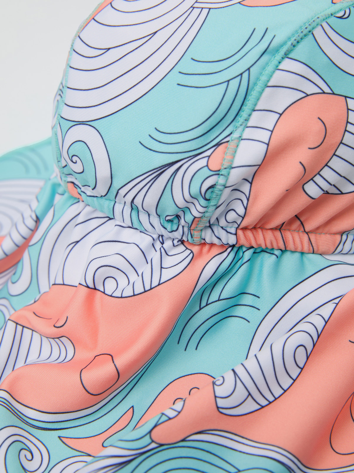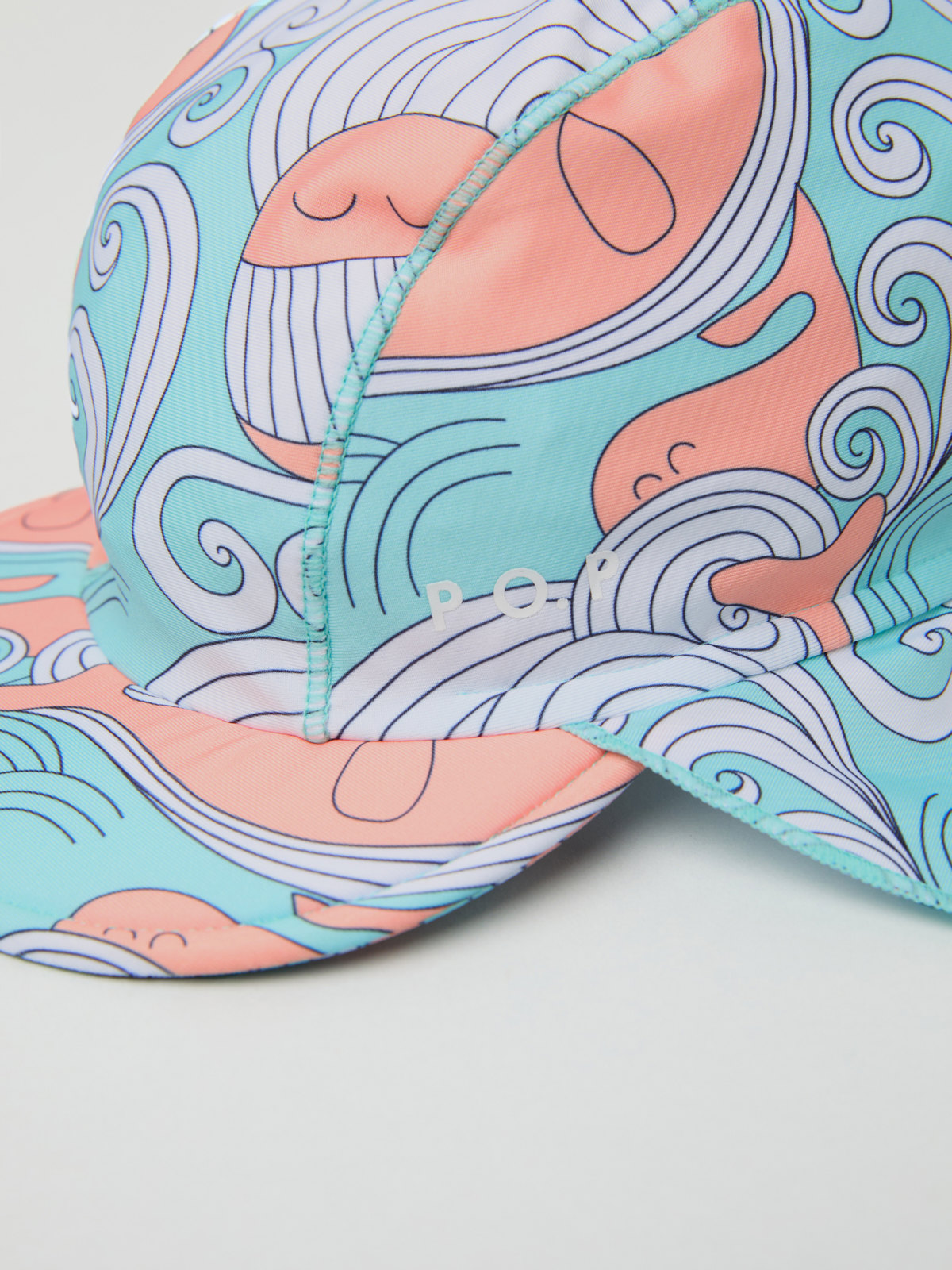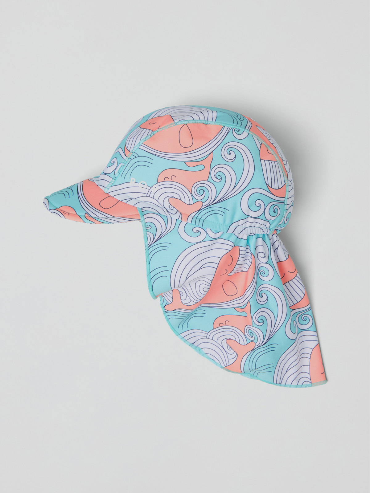 Weiche, stretchige Sonnenschutzkappe mit UV-Schutz UPF 50, die durchgehend mit Walen bedruckt ist – perfekt am Stand oder Pool! Die Kappe aus 100 % recyceltem Polyester trocknet schnell. Mit Schirm und breitem Nackenschutz schützt die Kappe die empfindliche Haut von Gesicht und Nacken vor der Sonne.