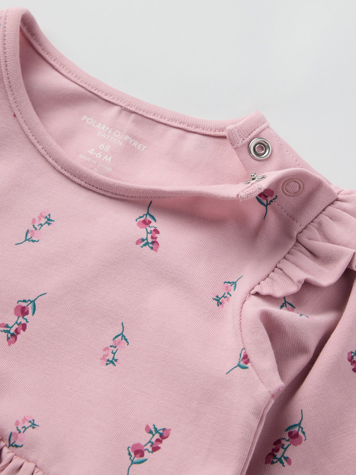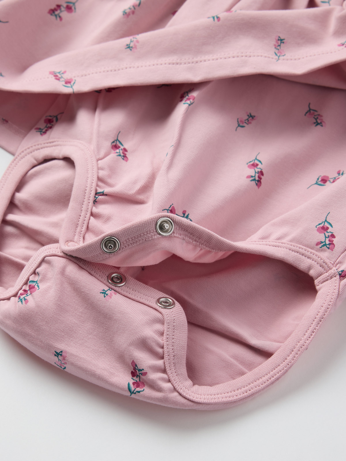 Eine praktische Kombination aus Kleid und Body aus weicher Bio-Baumwolle für Babys. Das Kleid mit Blumenprint ist mit bezaubernden Rüschen über den Schultern verziert. . Die Druckknöpfe an der einen Schulter und im Schritt erleichtern das An- und Ausziehen.