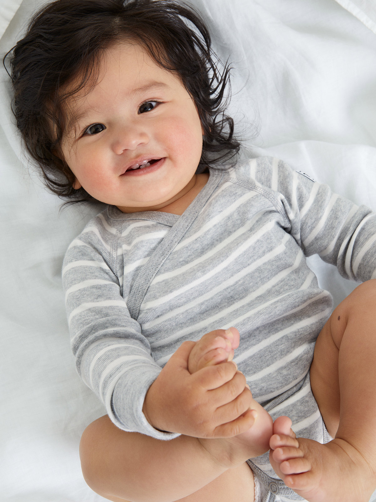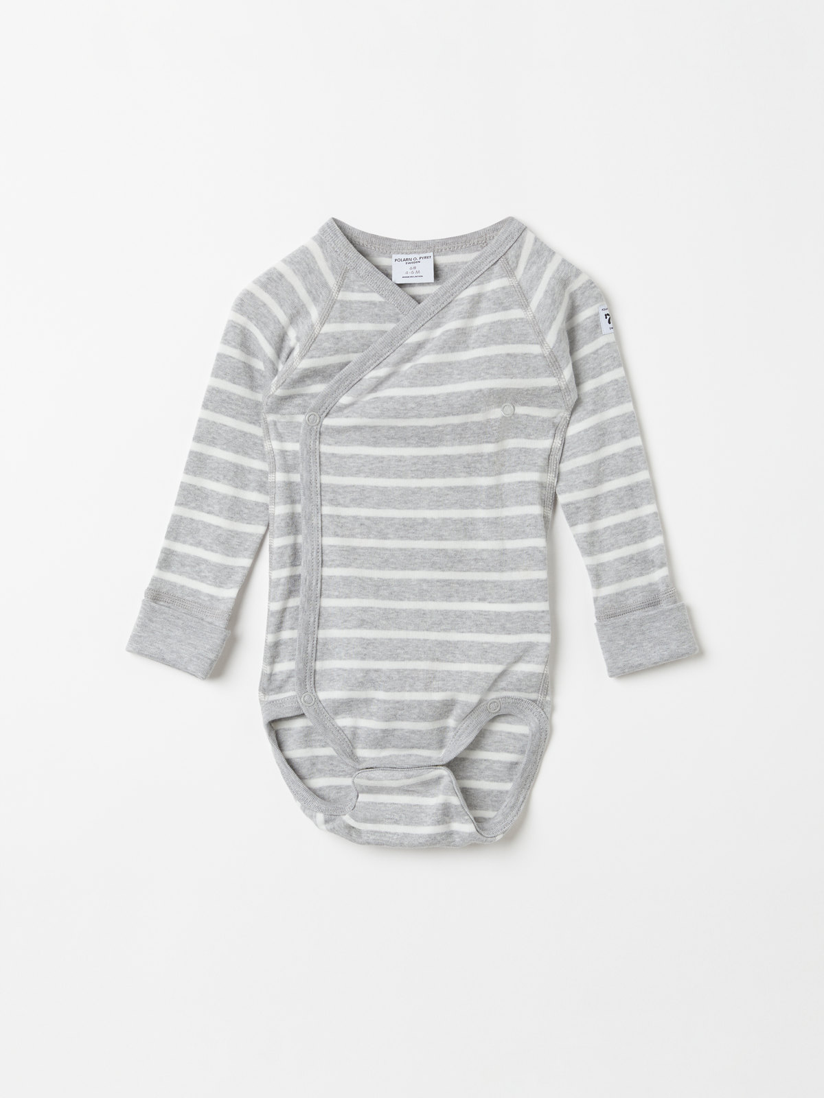 Gestreifter Wickelbody aus 100 % Bio-Baumwolle für Babys. Der Body hat unser klassisches Streifenmuster und weiche Rippenbündchen an den Ärmelabschlüssen, die du herunterschlagen kannst, wenn dein Baby ein wenig gewachsen ist. Die Druckknöpfe entlang der Wickelöffnung und im Schritt erleichtern das Anziehen und Wickeln.