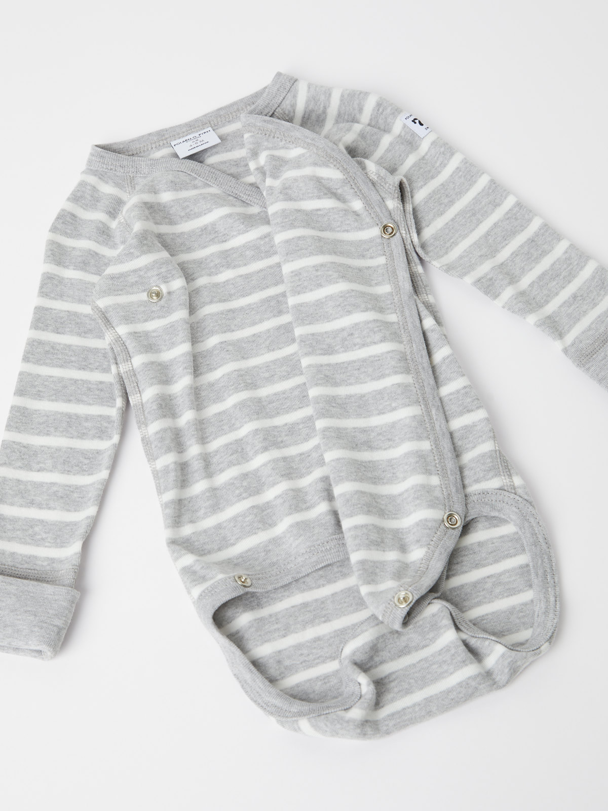 Wickelbody für Neugeborene aus Bio-Baumwolle. Der Body hat unser klassisches Streifenmuster und weiche Rippenbündchen an den Ärmelabschlüssen, die du herunterschlagen kannst, wenn dein Baby ein wenig gewachsen ist. Die Druckknöpfe entlang der Wickelöffnung und im Schritt erleichtern das Anziehen und Wickeln.