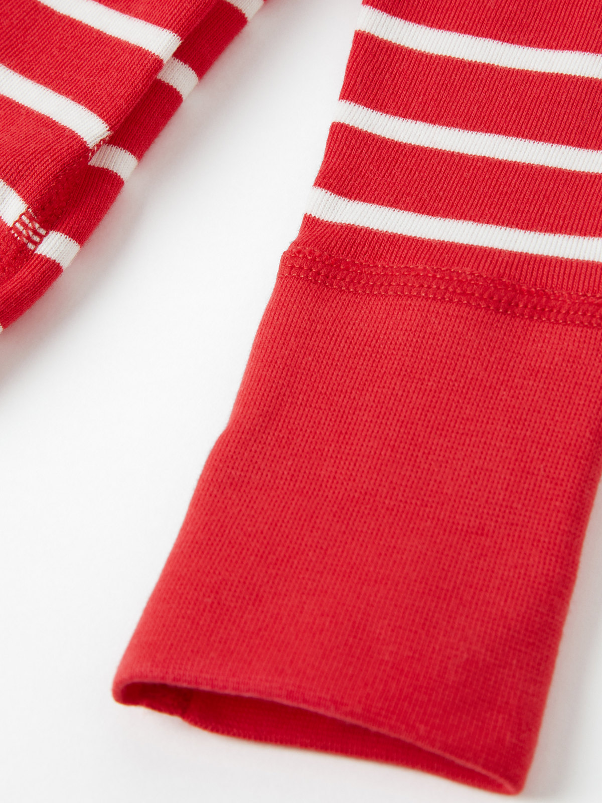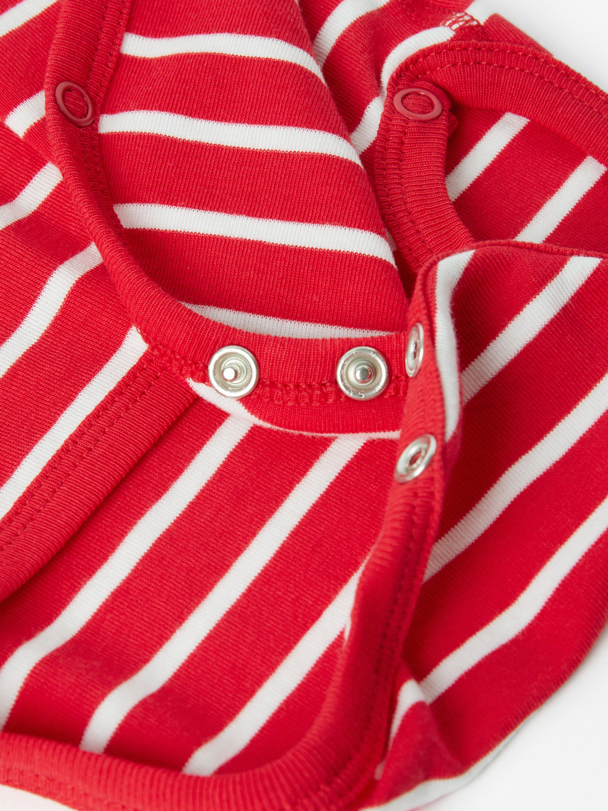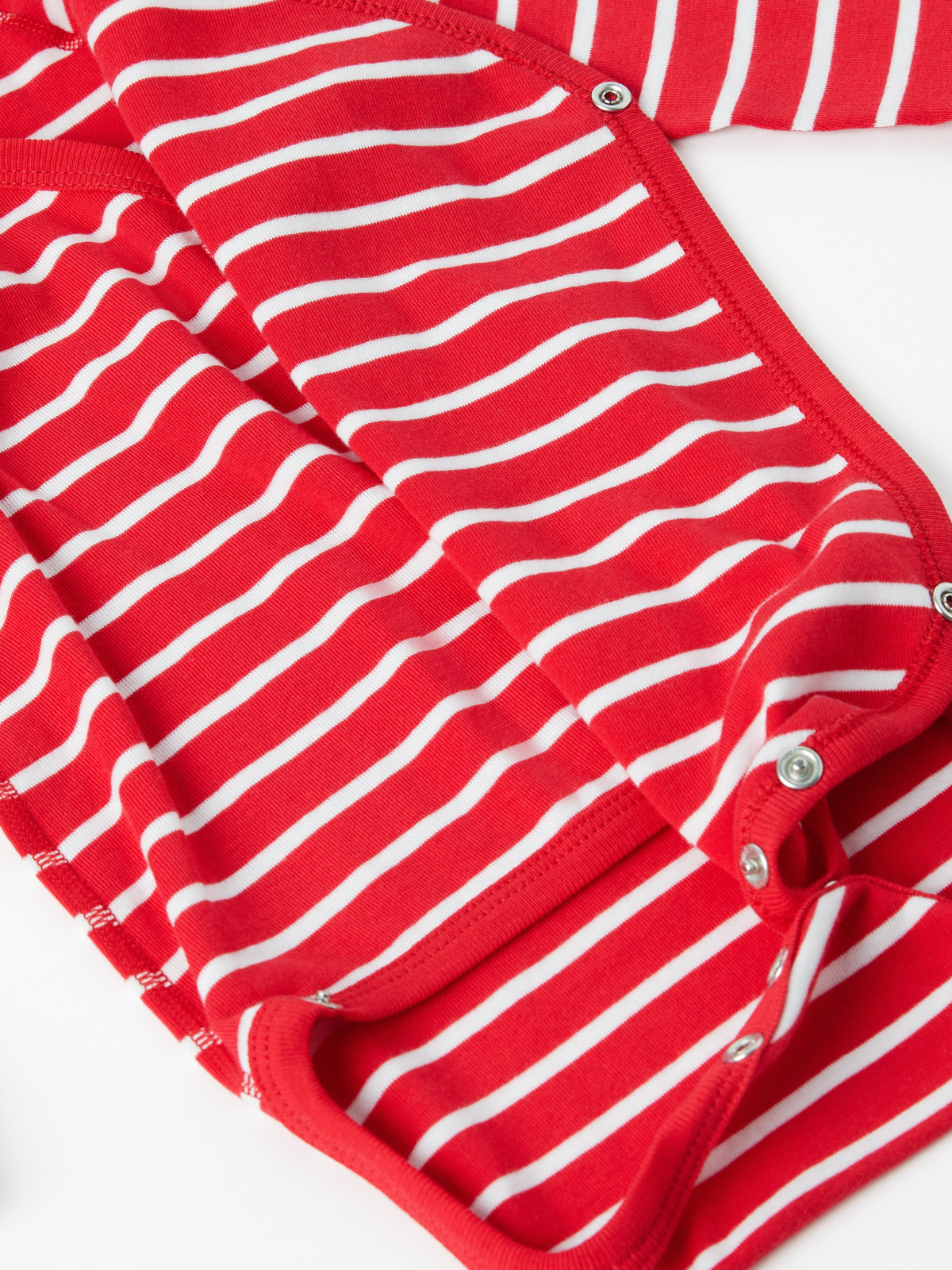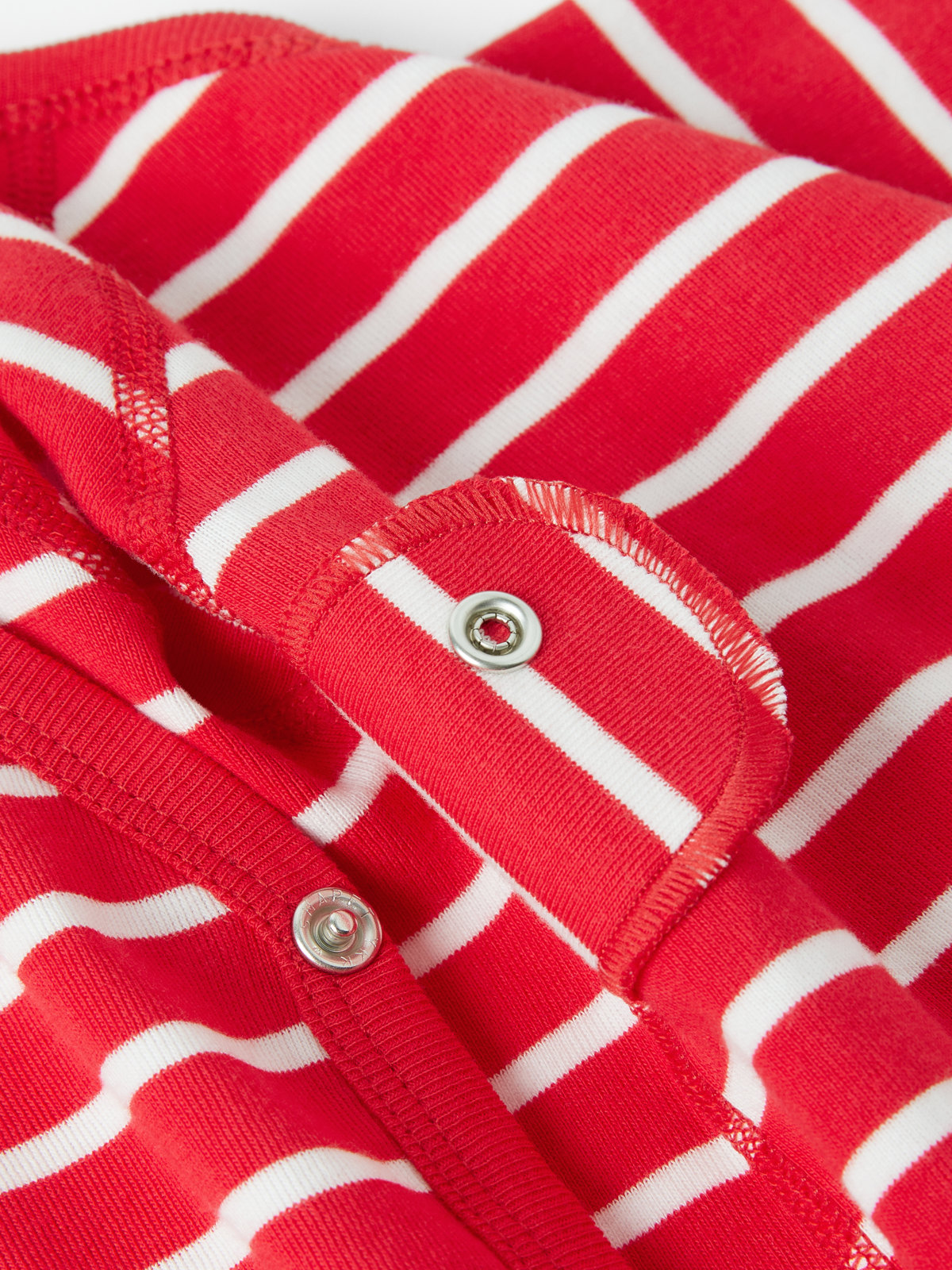 Gestreifter Wickelbody aus 100 % Bio-Baumwolle für Babys. Der Body hat unser klassisches Streifenmuster und weiche Rippenbündchen an den Ärmelabschlüssen, die du herunterschlagen kannst, wenn dein Baby ein wenig gewachsen ist. Die Druckknöpfe entlang der Wickelöffnung und im Schritt erleichtern das Anziehen und Wickeln.
