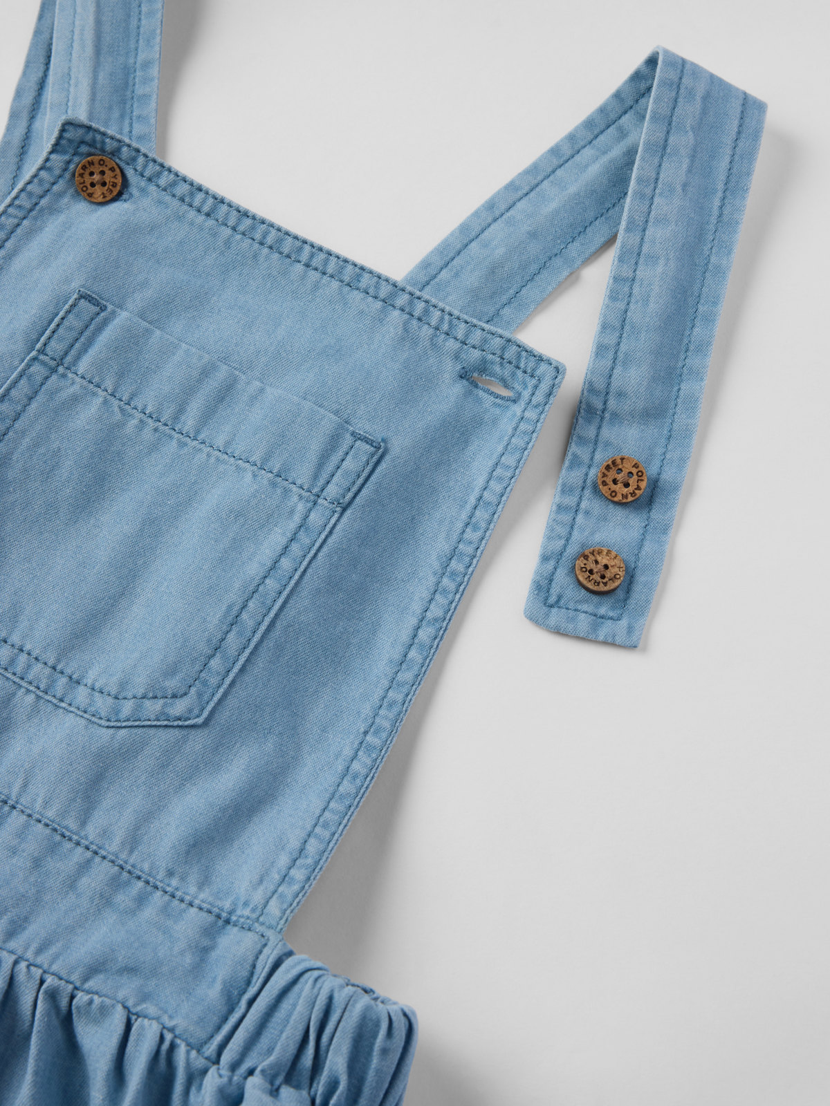 Latzkleid aus leichtem Chambray aus 100 % Bio-Baumwolle – perfekt für Alltag und Feierlichkeiten! Das Kleid hat schmale Träger, die vorne mit einem Knopf geschlossen werden, eine betonte Taille und einen gerafften Rockteil. Außerdem verfügt es über eine dekorative Brusttasche.