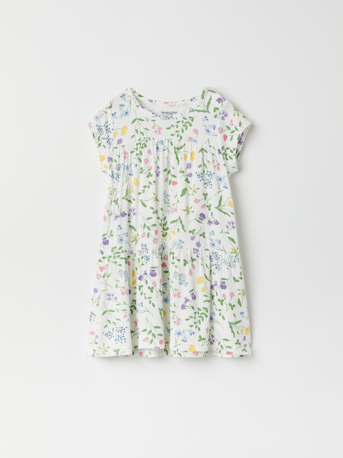 Das kurzärmelige Kleid wird auf einer Schulter mit Druckknöpfen geschlossen, um das An- und Ausziehen zu erleichtern.