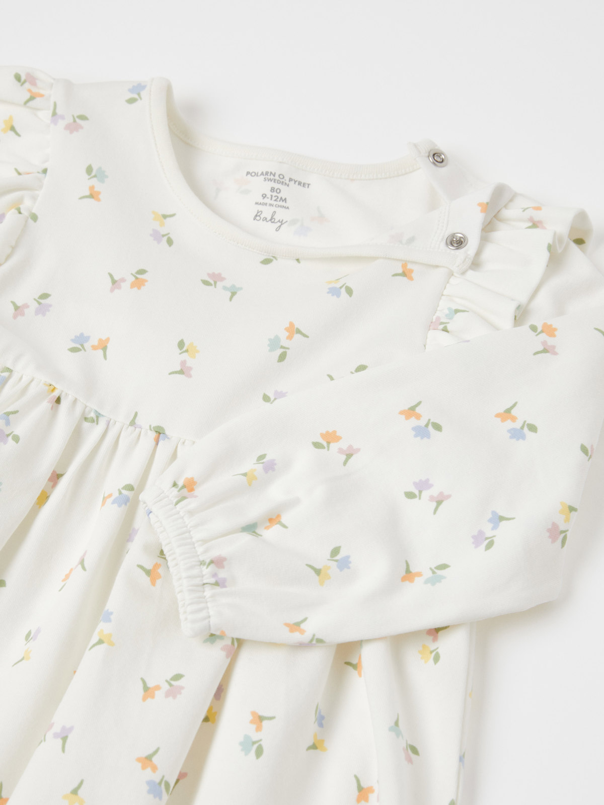 Bezauberndes, durchgehend bedrucktes Kleid aus weichem Bio-Baumwolltrikot. Das Kleid ist durchgehend mit kleinen Blumen bedruckt und an den Schultern mit Rüschen verziert.