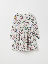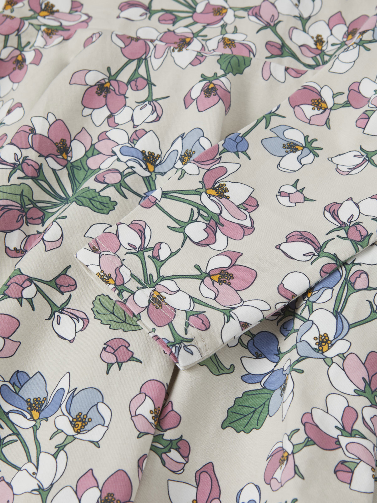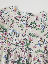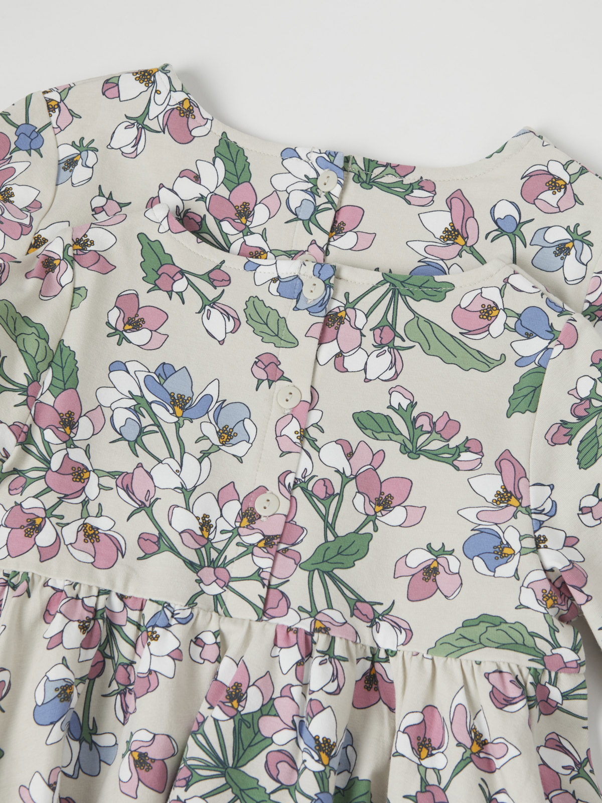Das Kleid ist durchgehend mit Blumen bedruckt und wird im Rücken mit einer Knopfleiste geschlossen.