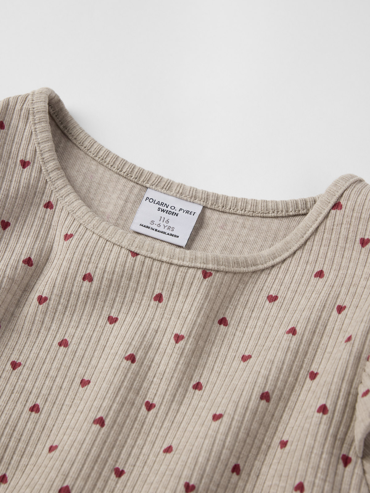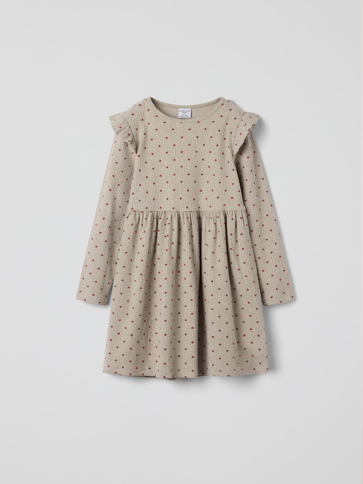Weiches, geripptes Babykleid aus Bio-Baumwolle. Das Kleid ist rundum mit kleinen Herzen gemustert und mit zarten Rüschen an den Schultern verziert.