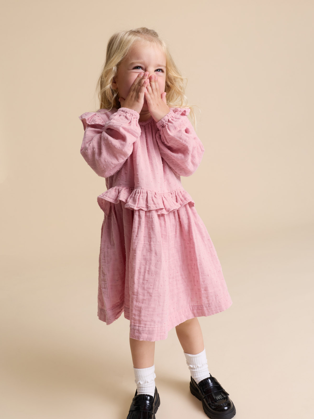 Süßes Musslinkleid aus 100 % Bio-Baumwolle – perfekt für jeden Anlass! Das Kleid ist mit Volants an der Taille und an den Schultern verziert und wird hinten mit einer Knopfleiste geschlossen. Die Ärmel haben elastische Abschlüsse.