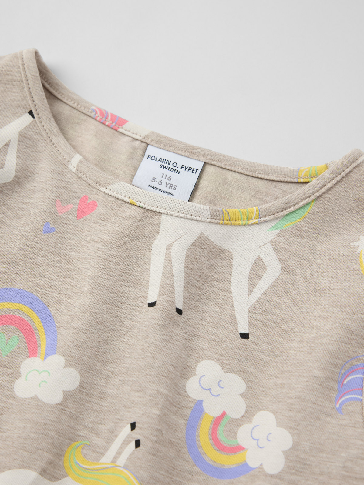 Hübsches Alltagskleid mit weitem Rock – perfekt für die Kita und kleine Feste! Das Kleid besteht aus weicher Bio-Baumwolle und hat einen gerippten Halsausschnitt. Es wird hinten am Rücken mit einer Knopfleiste geschlossen.