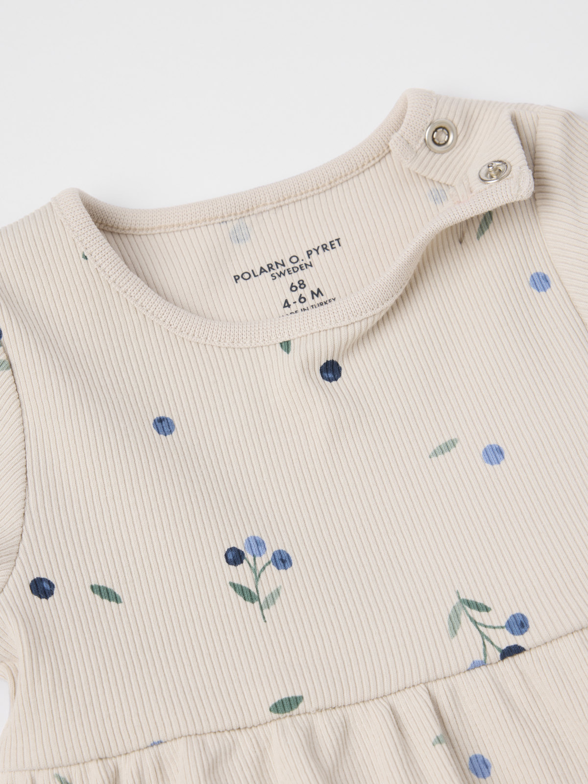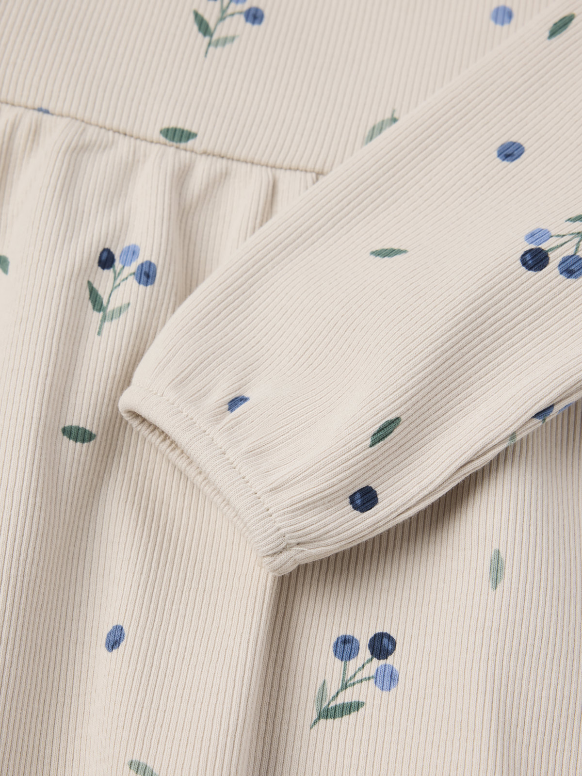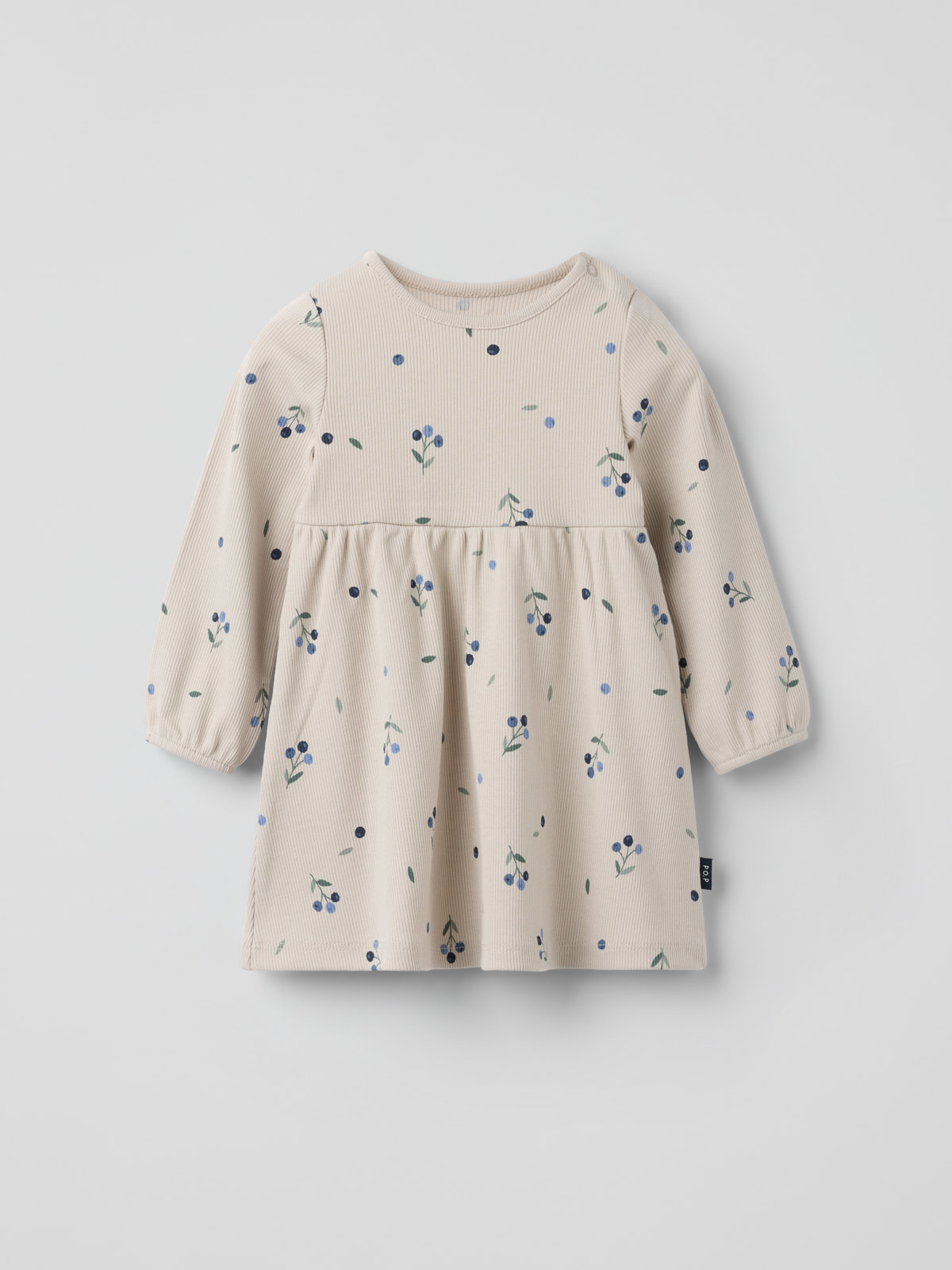 Süßes Kleid aus Ribbenstrick Bio-Baumwolltrikot – bequem für jede Gelegenheit! Das Kleid ist durchgehend über den Schultern mit Rüschen verziert.