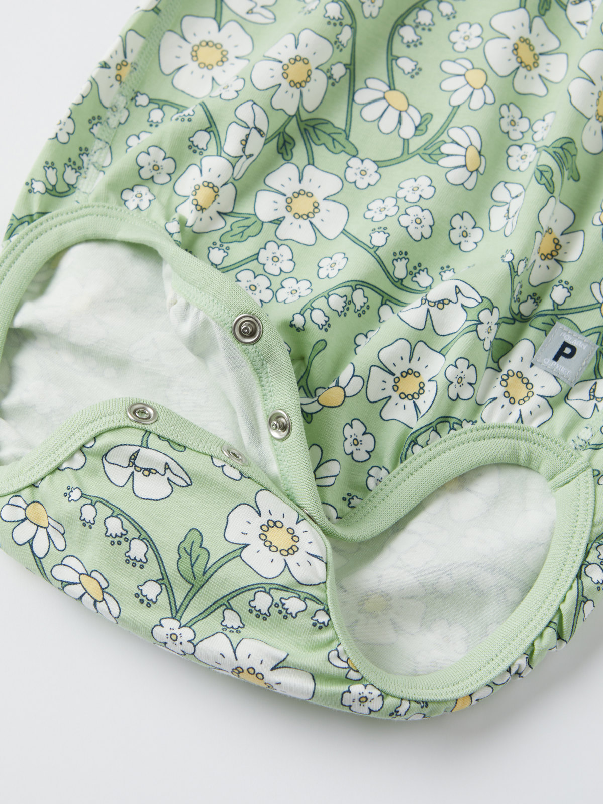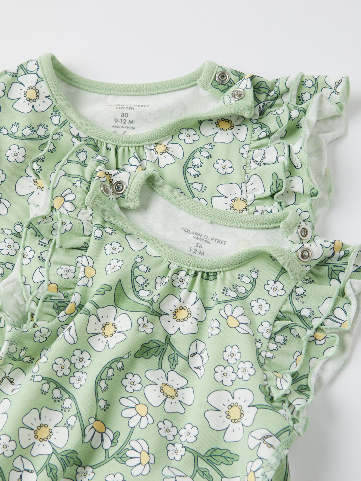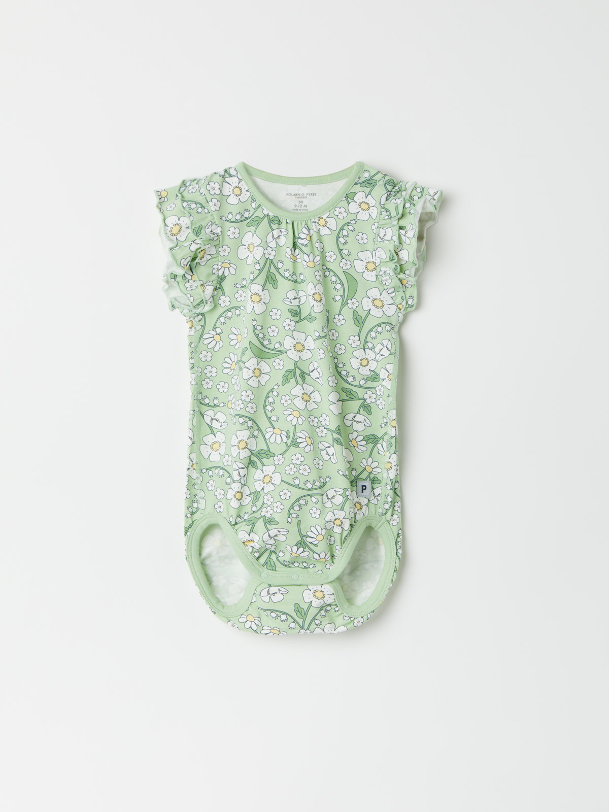 Niedlicher Body aus weicher Bio-Baumwolle für Babys. Der Body ist durchgehend mit Blumen bedruckt und an den Ärmeln mit doppelten Rüschen besetzt.
