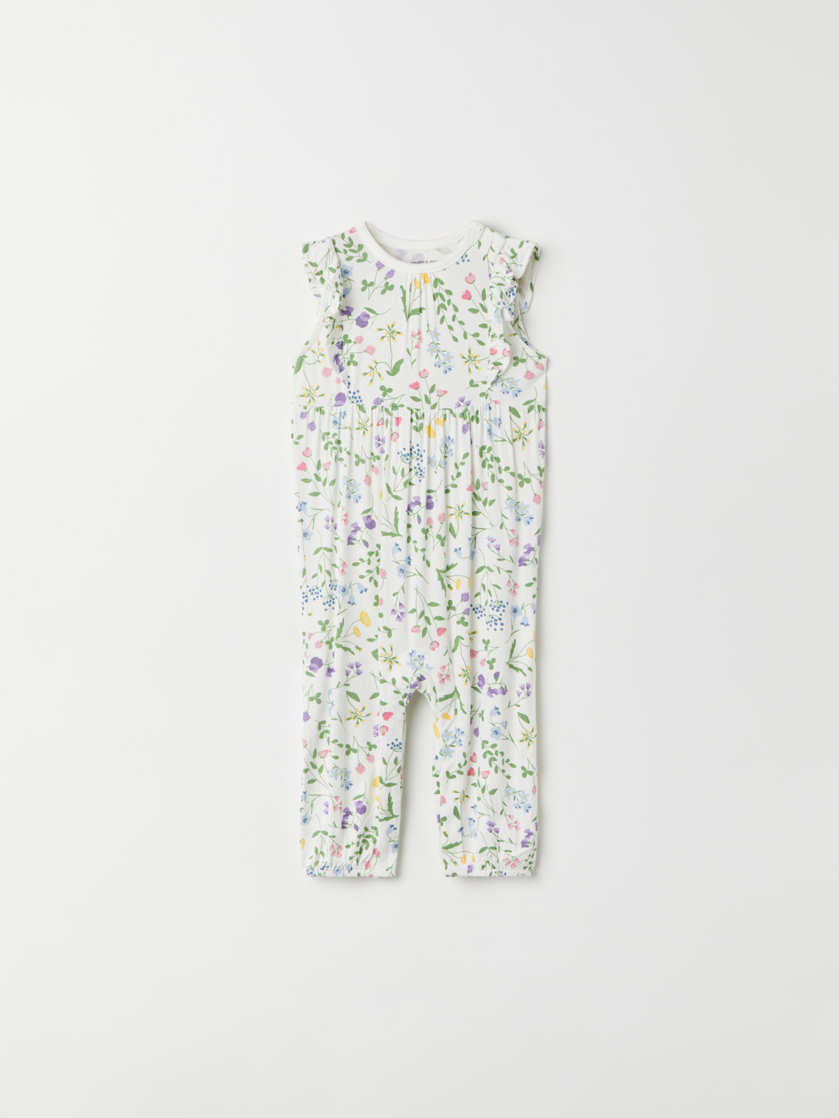 Der Playsuit mit durchgehendem Blumenprint ist vorne mit Rüschen verziert, die sich über Schultern und Rücken fortsetzen.