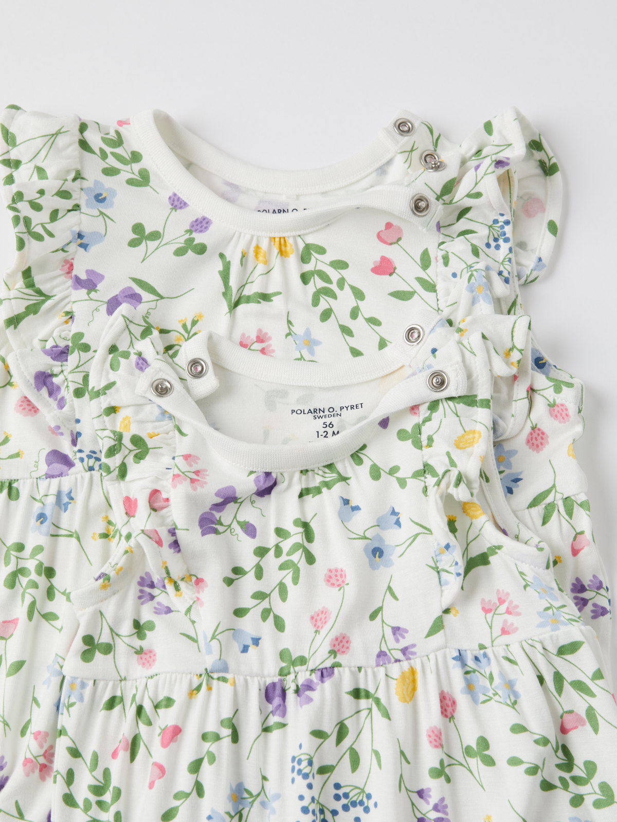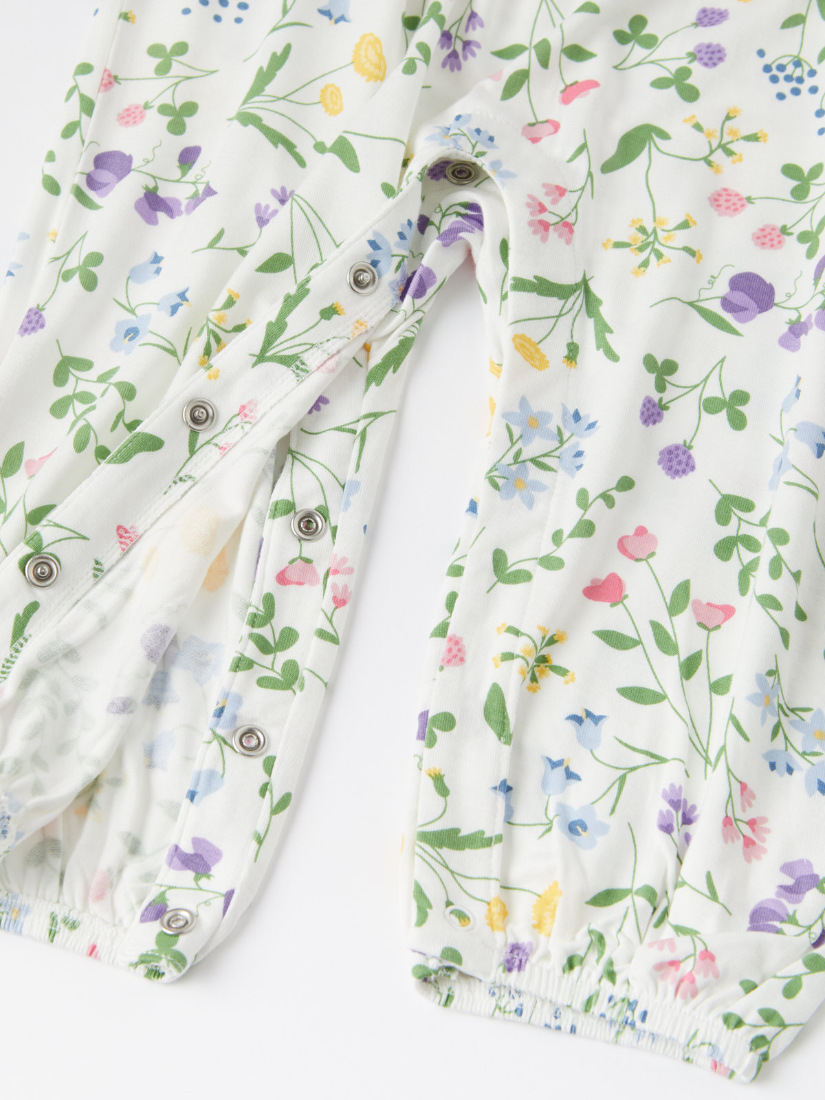 Auf einer Schulter und im Schritt wird er mit Druckknöpfen geschlossen, um das An- und Ausziehen zu erleichtern. Die Beinabschlüsse sind elastisch.