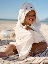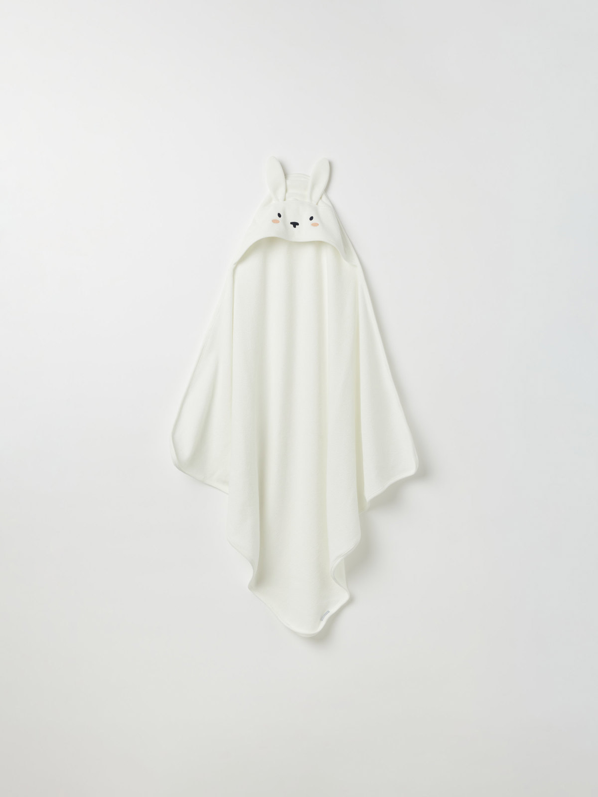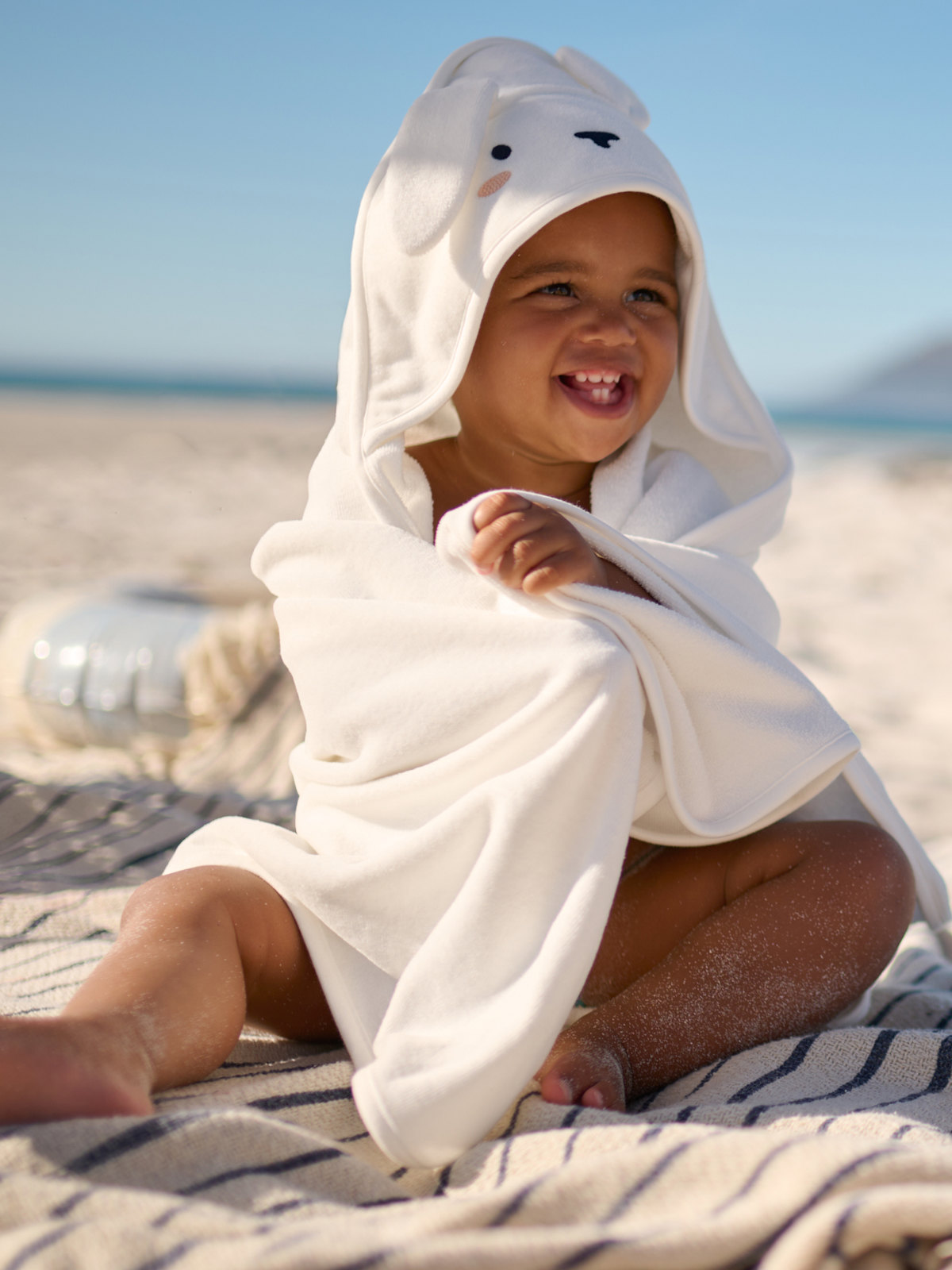 Das Badetuch aus weichem Baumwollfrottee hat eine praktische kleine Kapuze in einer Ecke, die auf den kleinen Kopf gezogen werden kann, damit das Badetuch nicht verrutscht.