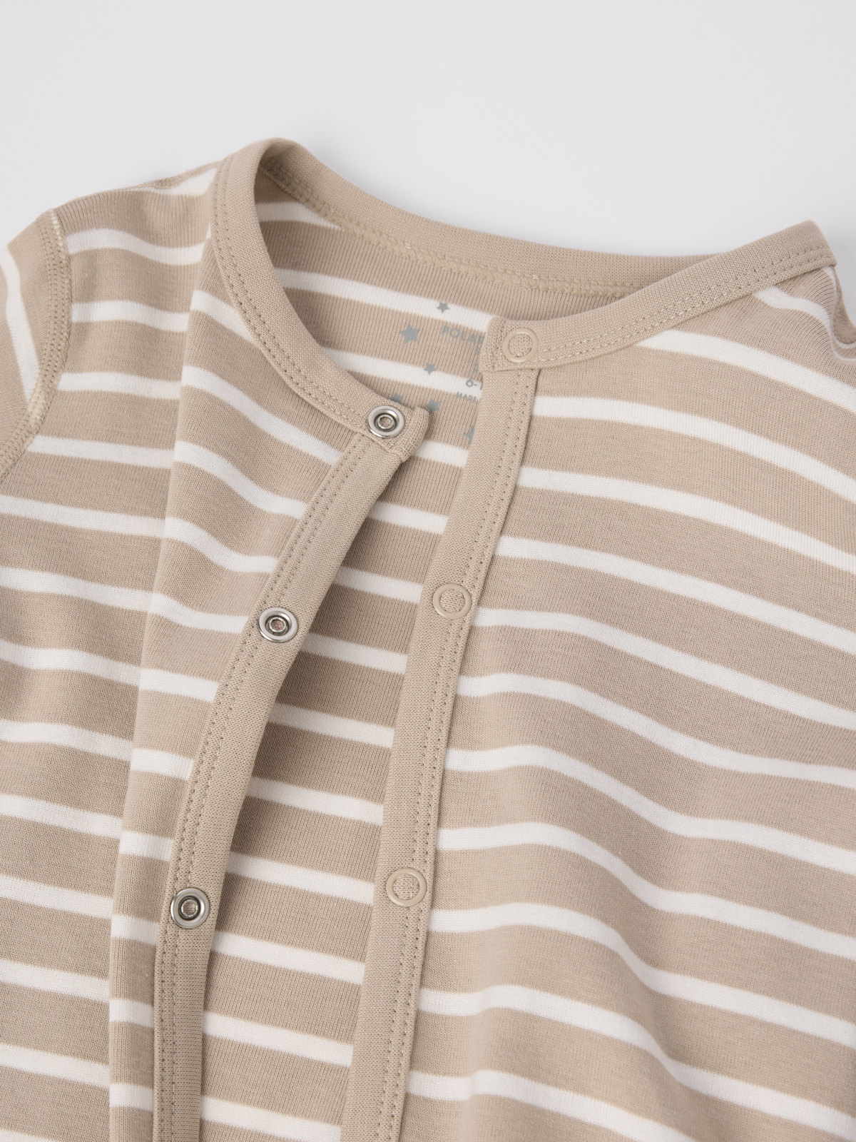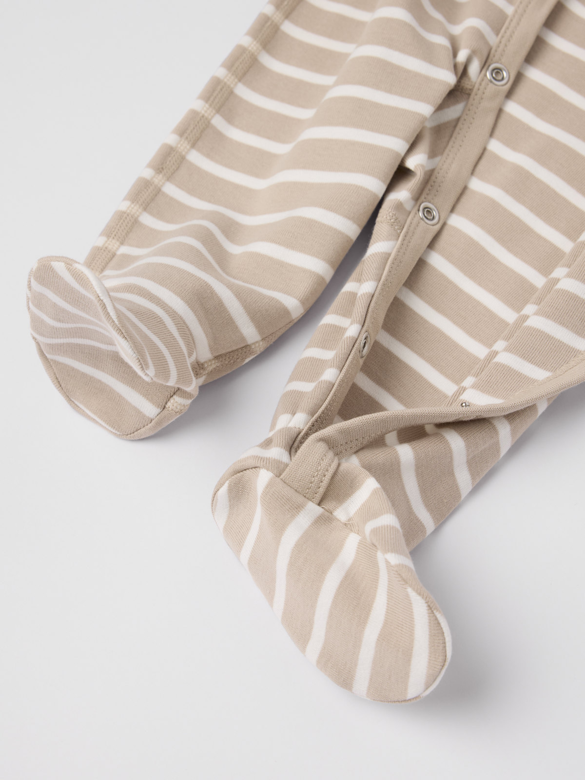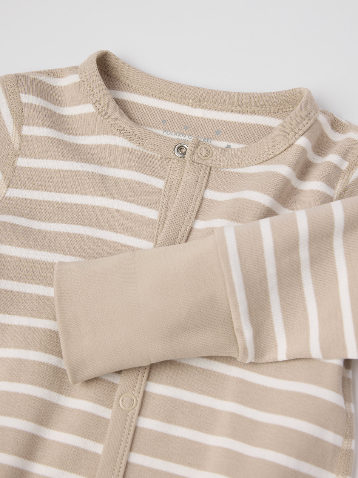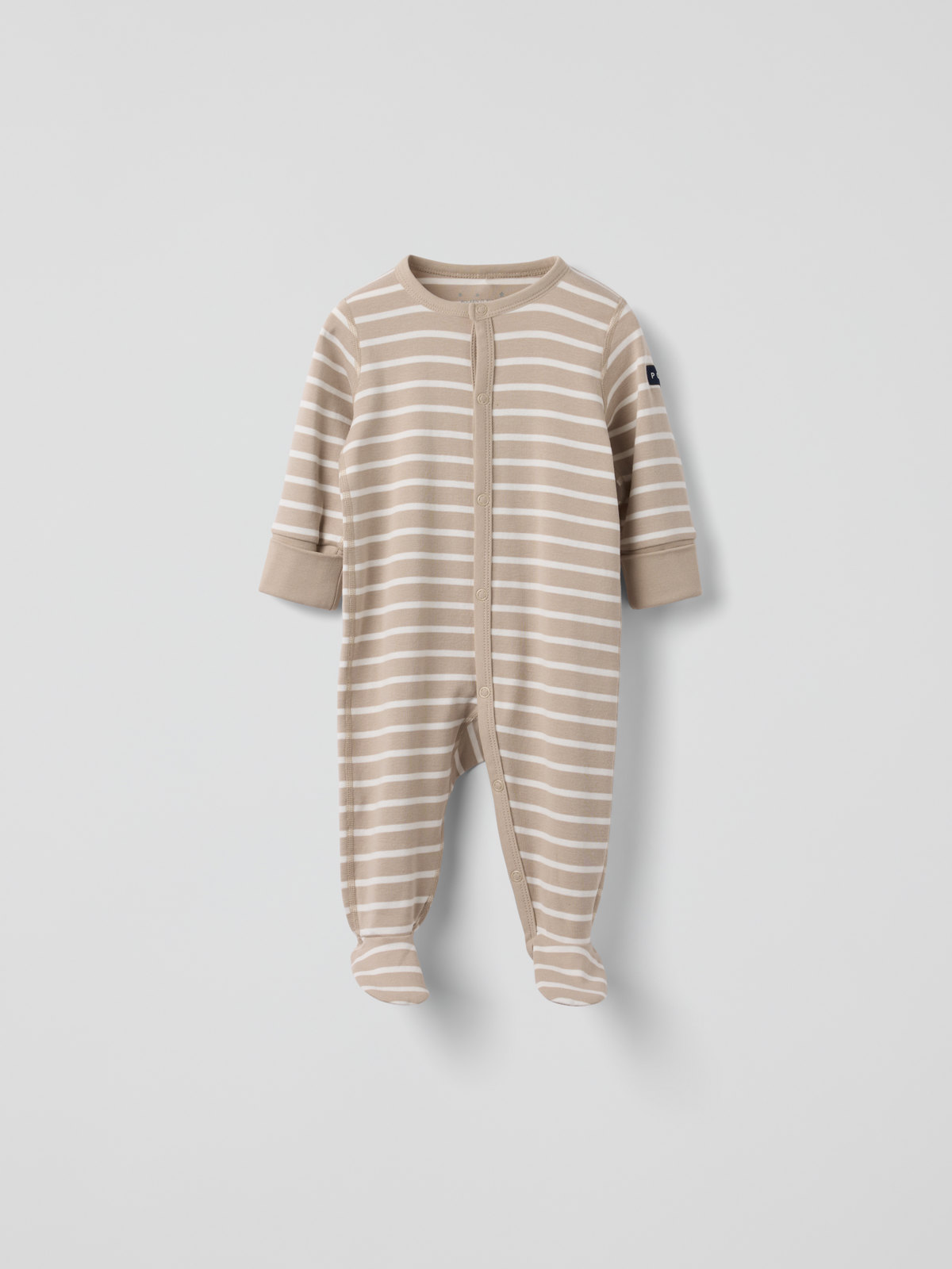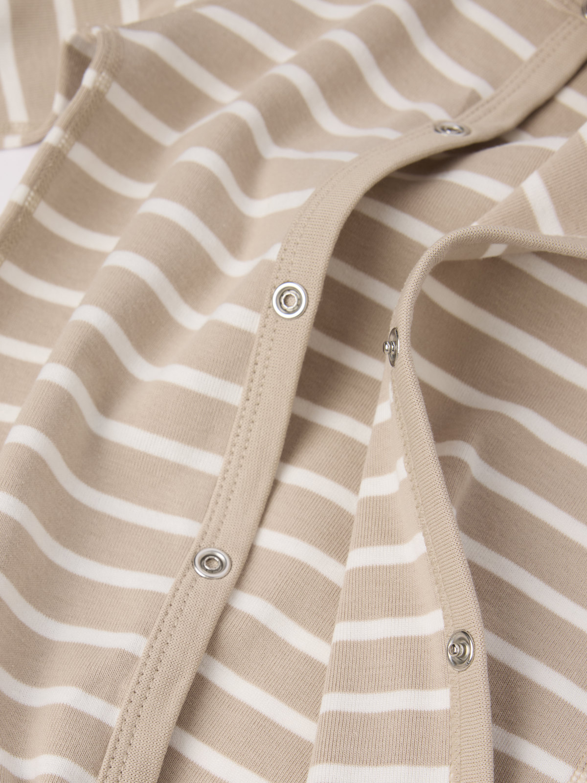 Gestreifter Schlafoverall aus weicher Bio-Baumwolle für die Allerkleinsten. Die extra langen Bündchen an Ärmel- und Beinabschlüssen können umgeschlagen werden, dadurch wächst das Kleidungsstück etwas mit deinem Kind mit. Knöpfe vom Hals bis zum Beinabschluss erleichtern das An- und Ausziehen.