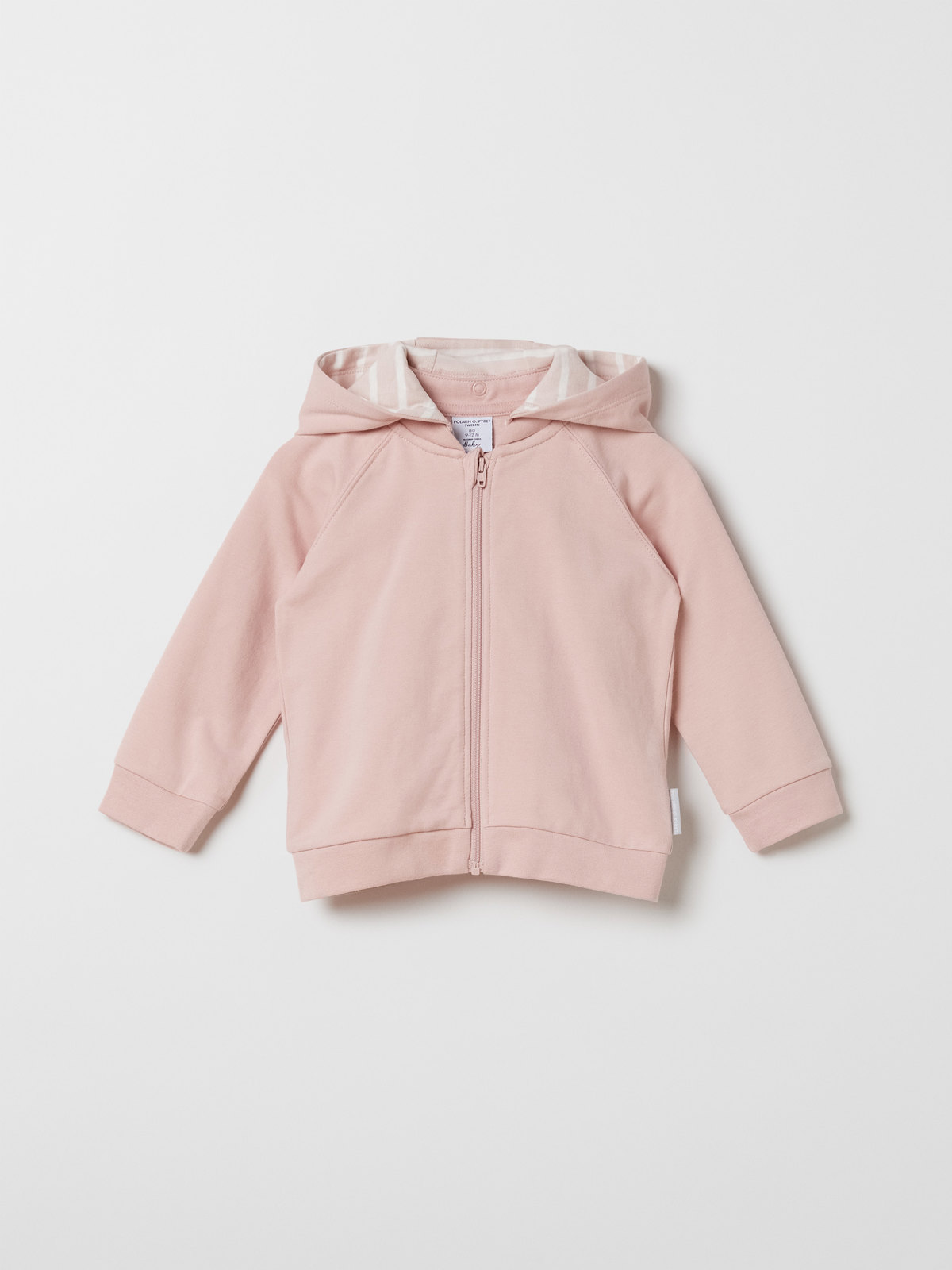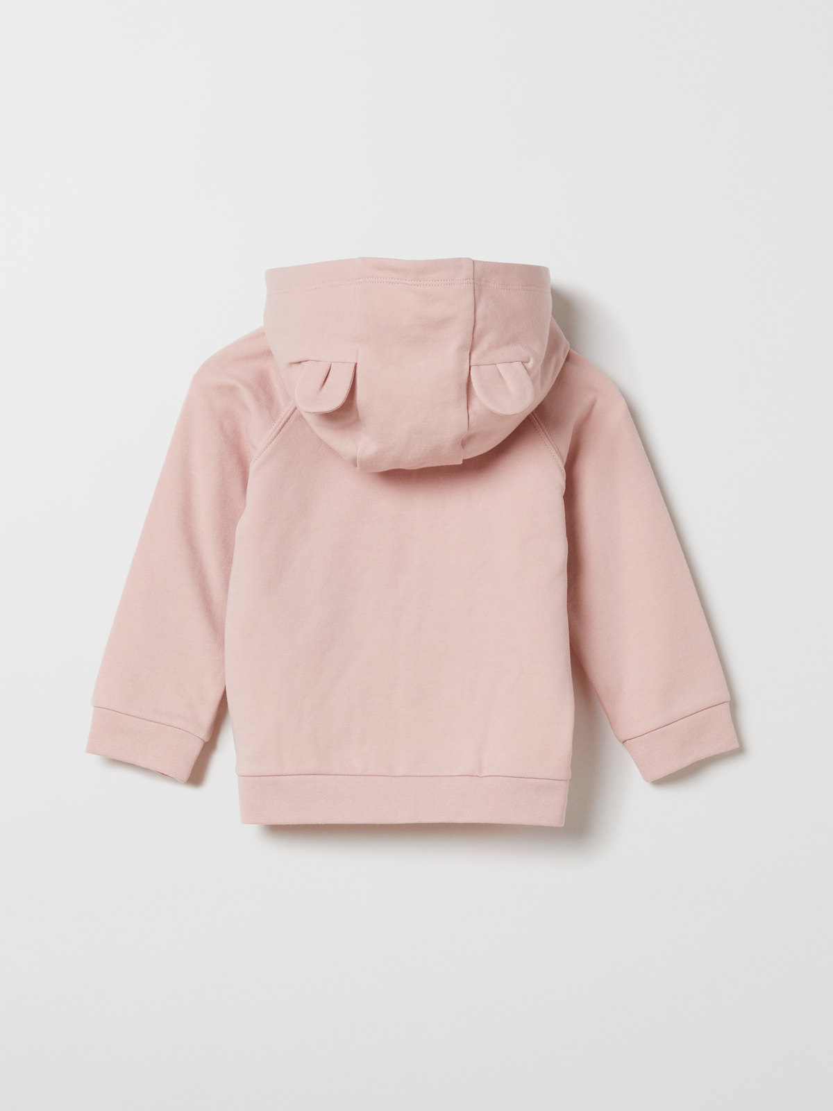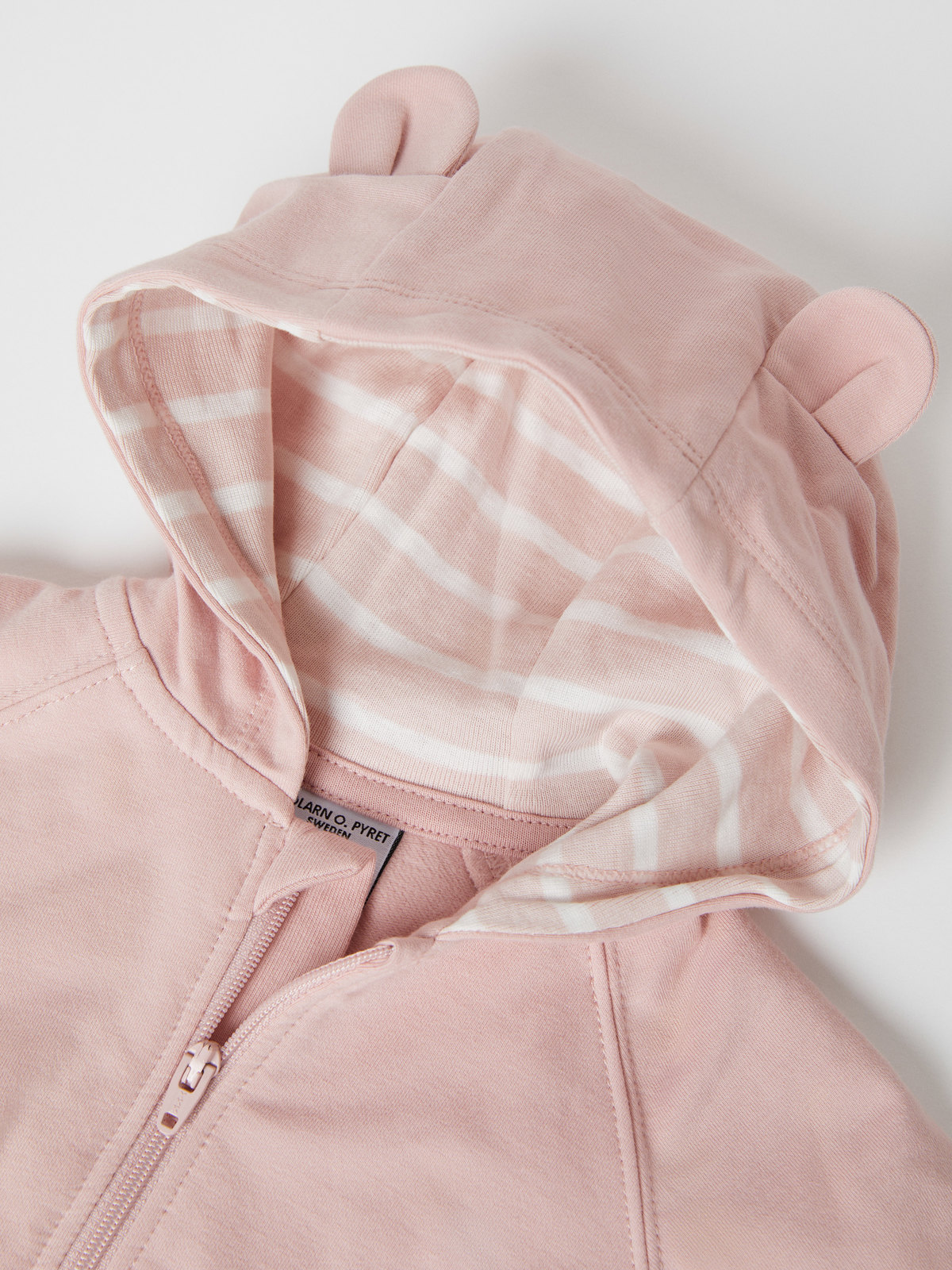 Der Hoodie hat eine Kapuze mit kleinen angenähten Öhrchen und ist mit gestreiftem Jersey gefüttert.
