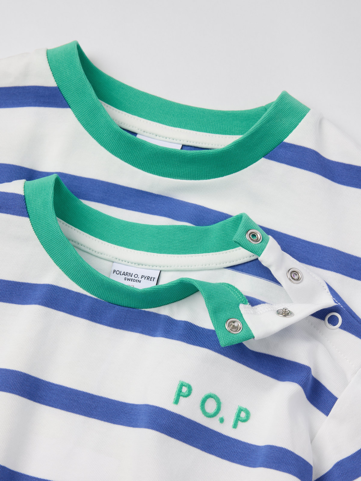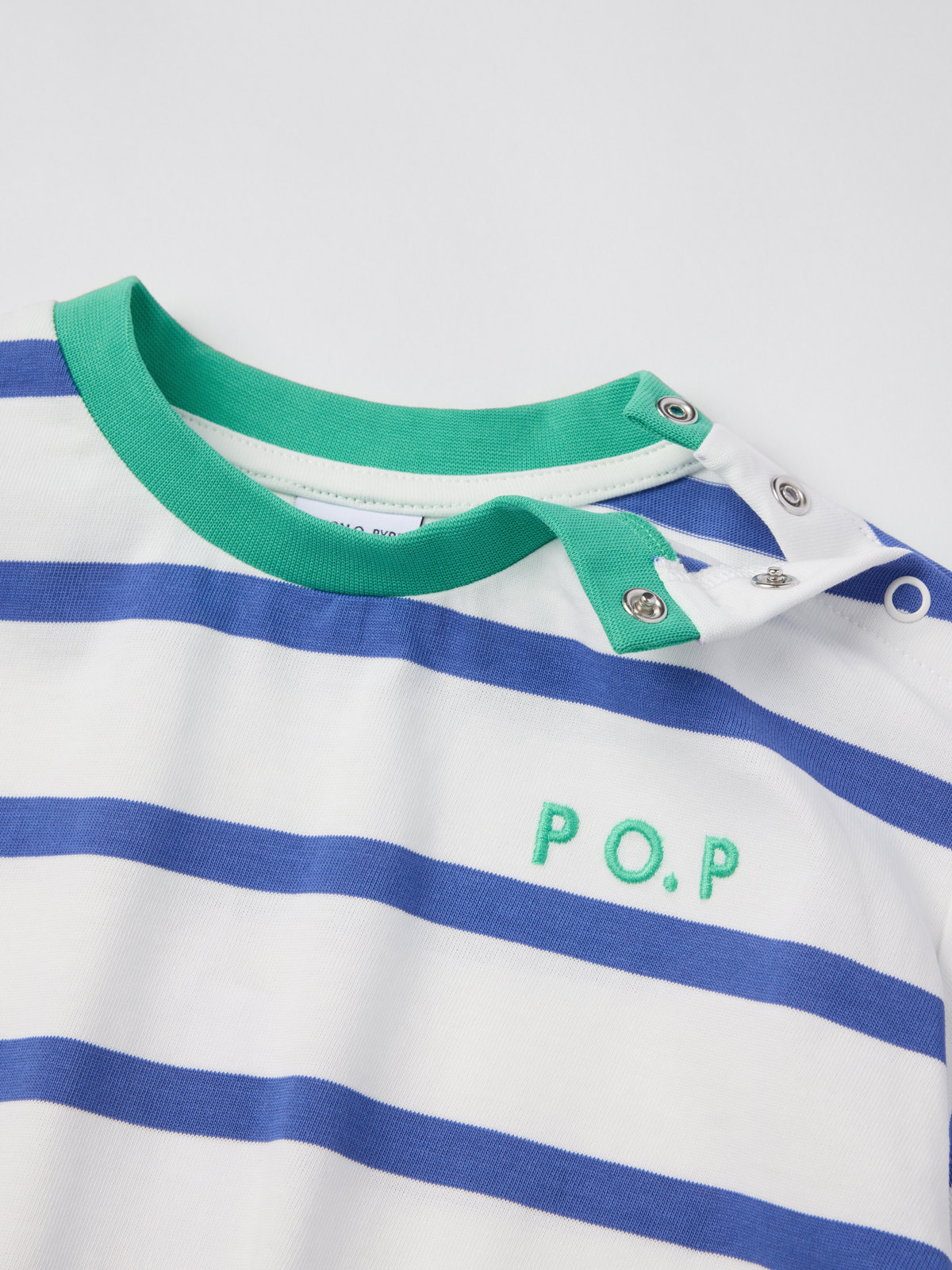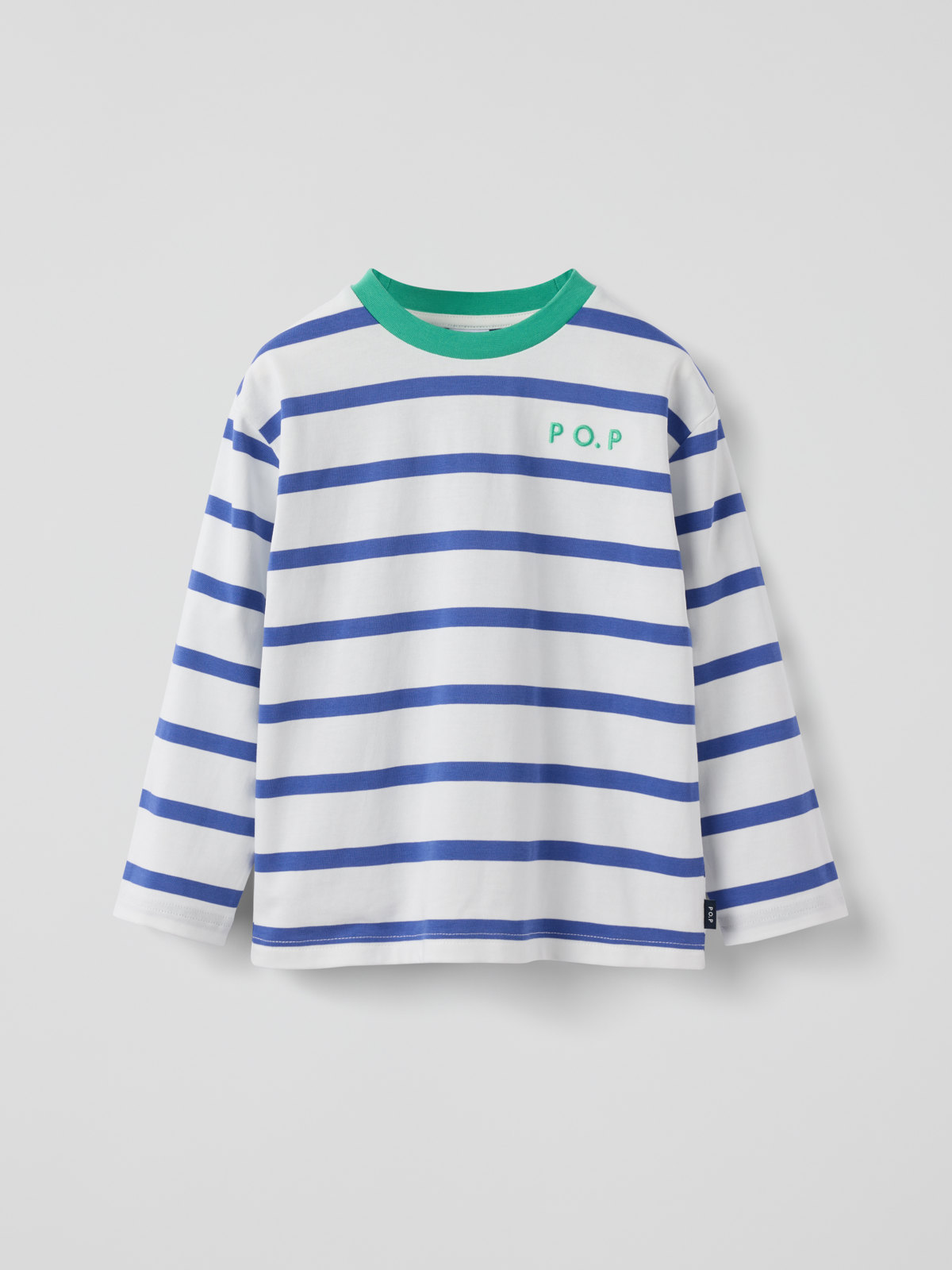 Langärmliges T-Shirt aus weichem Jersey aus 100 % Bio-Baumwolle mit hübschen Details. Das Shirt ist gestreift, hat einen kontrastfarbenen Rippkragen und eine kleine PO.P-Stickerei auf der Brust.