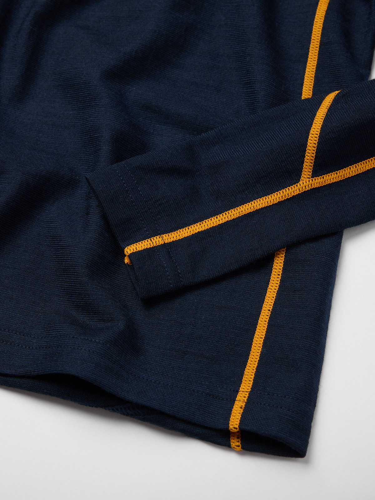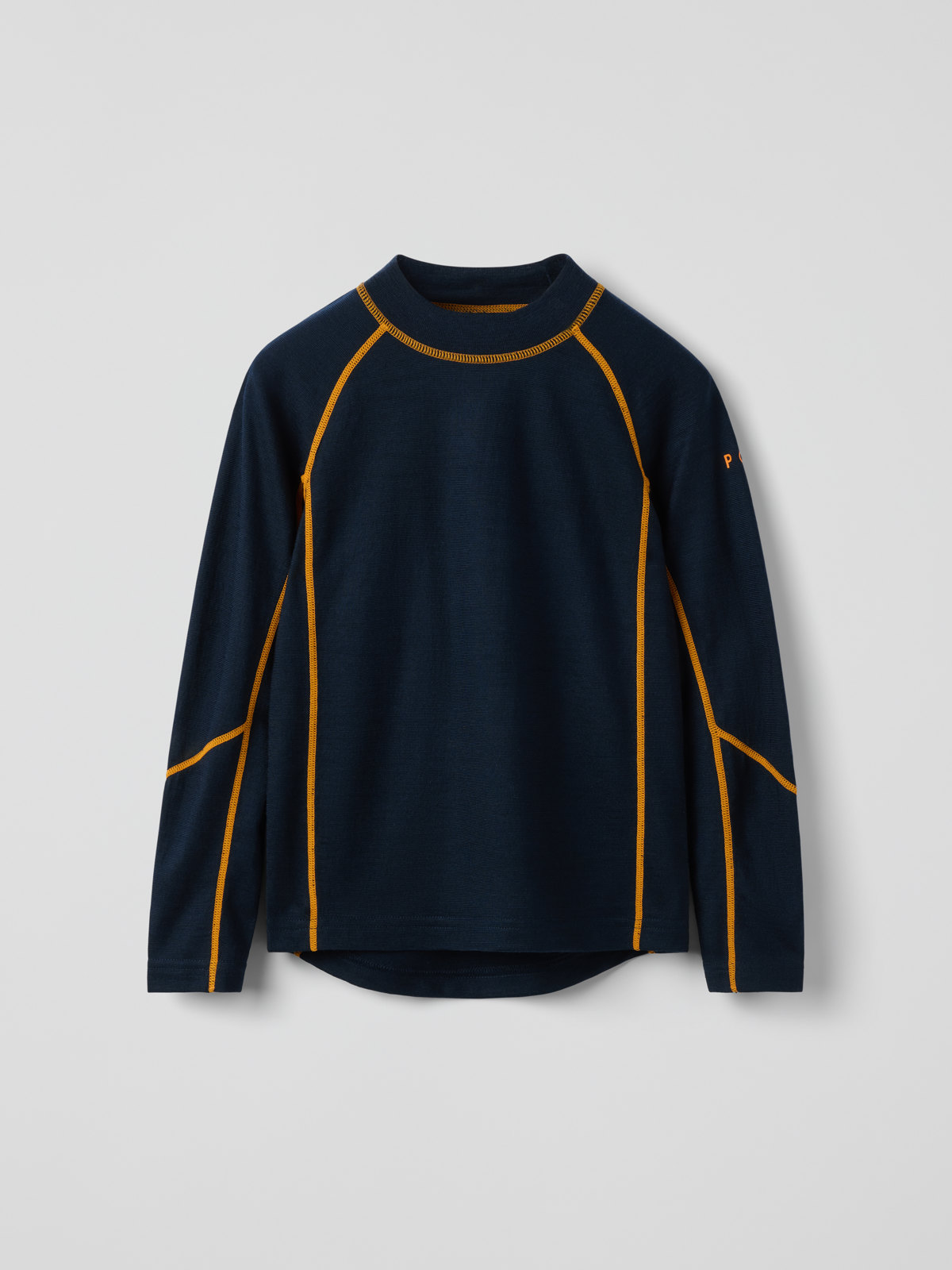Oberteil aus weicher und wärmender Merino-Polyester-Mischung mit kontrastfarbenen Nähten und Saum – perfekt als erste Schicht direkt auf der Haut. Merinowolle wärmt auch im nassen Zustand und hilft, die Körpertemperatur zu regulieren, und das Polyester transportiert die Feuchtigkeit vom Körper weg. Das Oberteil ist mit besonders weichen Nähten genäht und passt ideal zur passenden Hose als Unterwäsche an kalten Wintertagen oder bei aktiven Ausflügen.